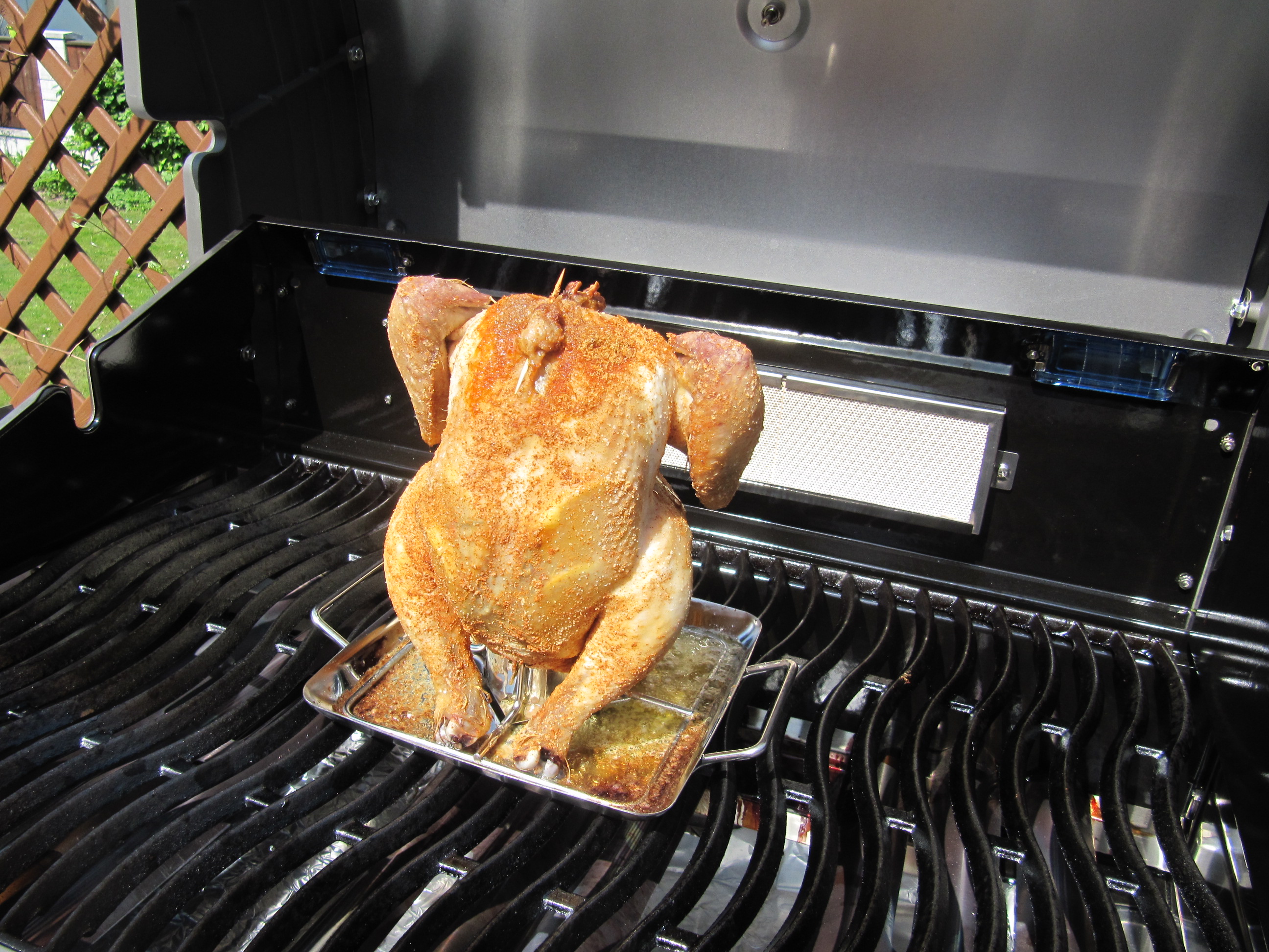 Zubehör: Geflügelhalter, Napoleon Gasgrill LE3, eventuell Räucherpfeife und Hickory-Holzräucherchips.