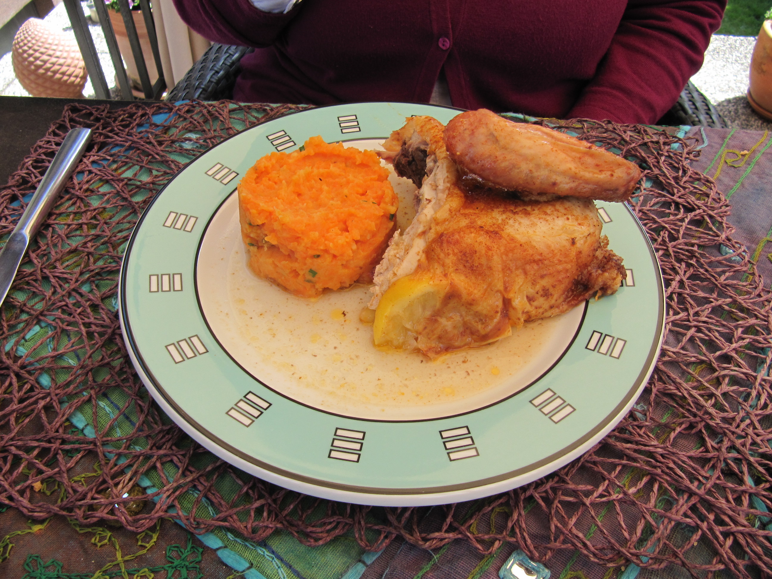Das Huhn in servierfertige Portionen teilen. Das Huhn wird durch die verdampfende Flüssigkeit sehr saftig !