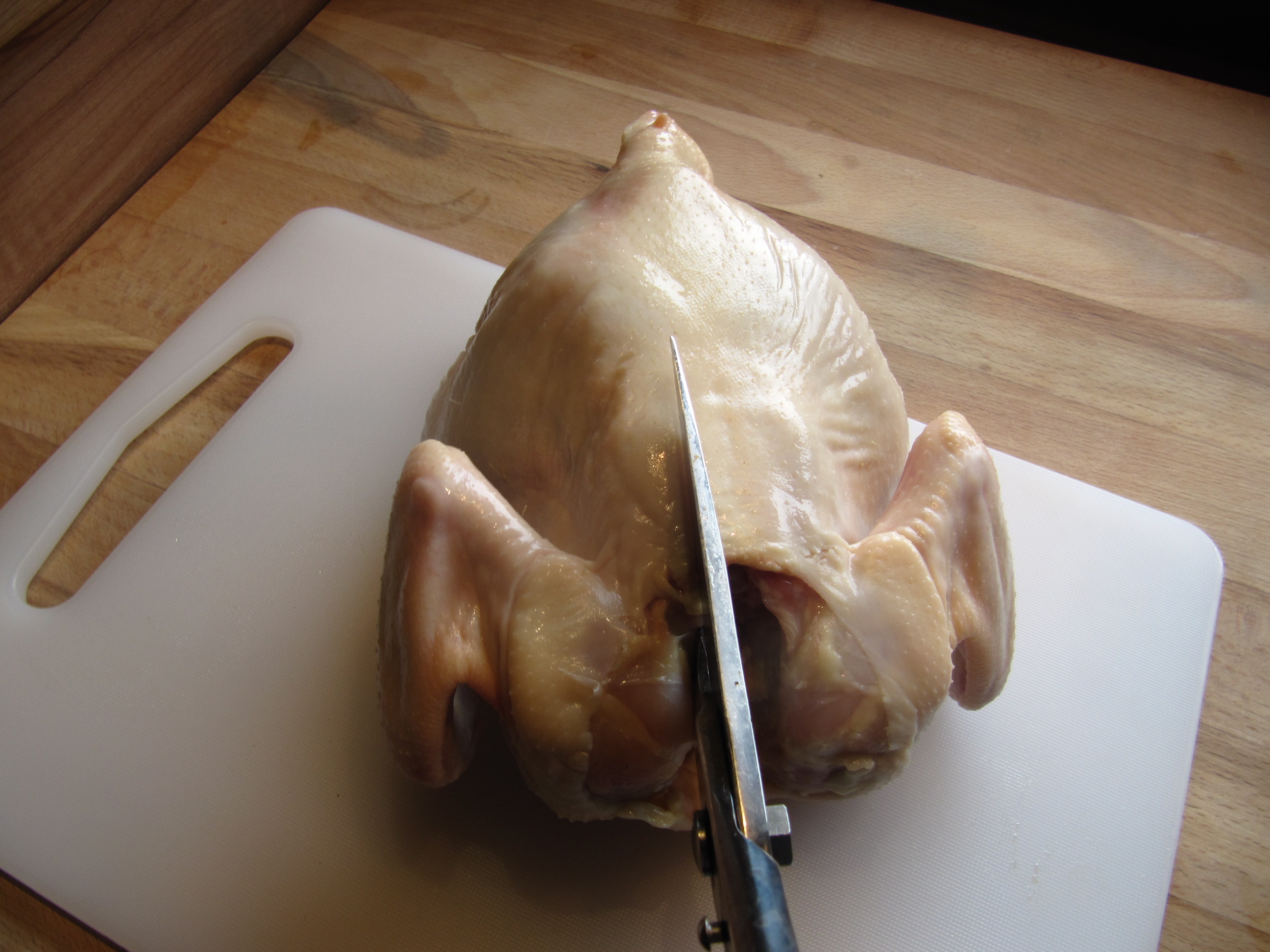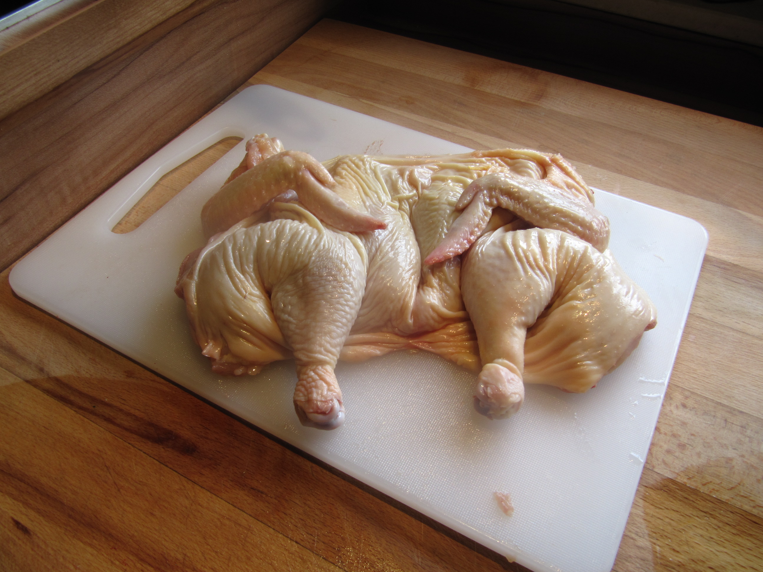 Die Zutaten für die Marinade in einer Schüssel vermischen. Das Huhn mit der Brust nach unten auf ein Schneidbrett legen. Mit Geflügelschere oder scharfem Messer vom Nacken her auf beiden Seiten des Rückgrats entlangschneiden und das Rückgrat entfernen. Jetzt sieht man das Innere des Huhns. Nun das knorpelige untere Ende des Brustbeins einschneiden, mit den Händen die Rippenenden fassen und das Huhn aufklappen. An beiden Enden des Brustbeins mit den Fingern entlangfahren und es vom Fleisch lösen. Den Knochen greifen und gemeinsam mit dem Knorpel rausziehen. Das Huhn liegt jetzt flach auf dem Schneidbrett. Das Huhn in die Marinade legen und es damit gleichmäßig überziehen. Mit Frischhaltefolie abdecken und 2 Stunden im Kühlschrank marinieren.