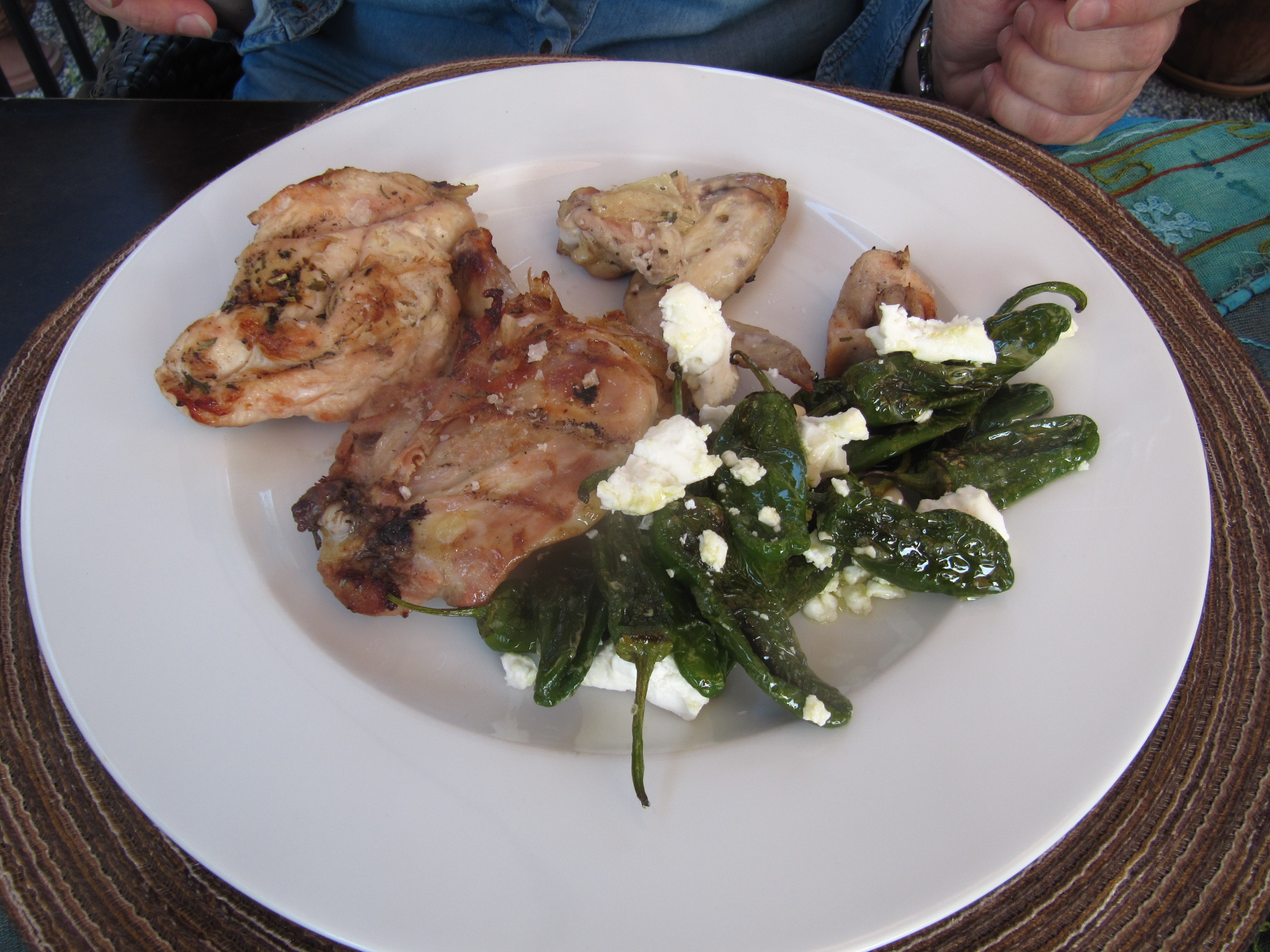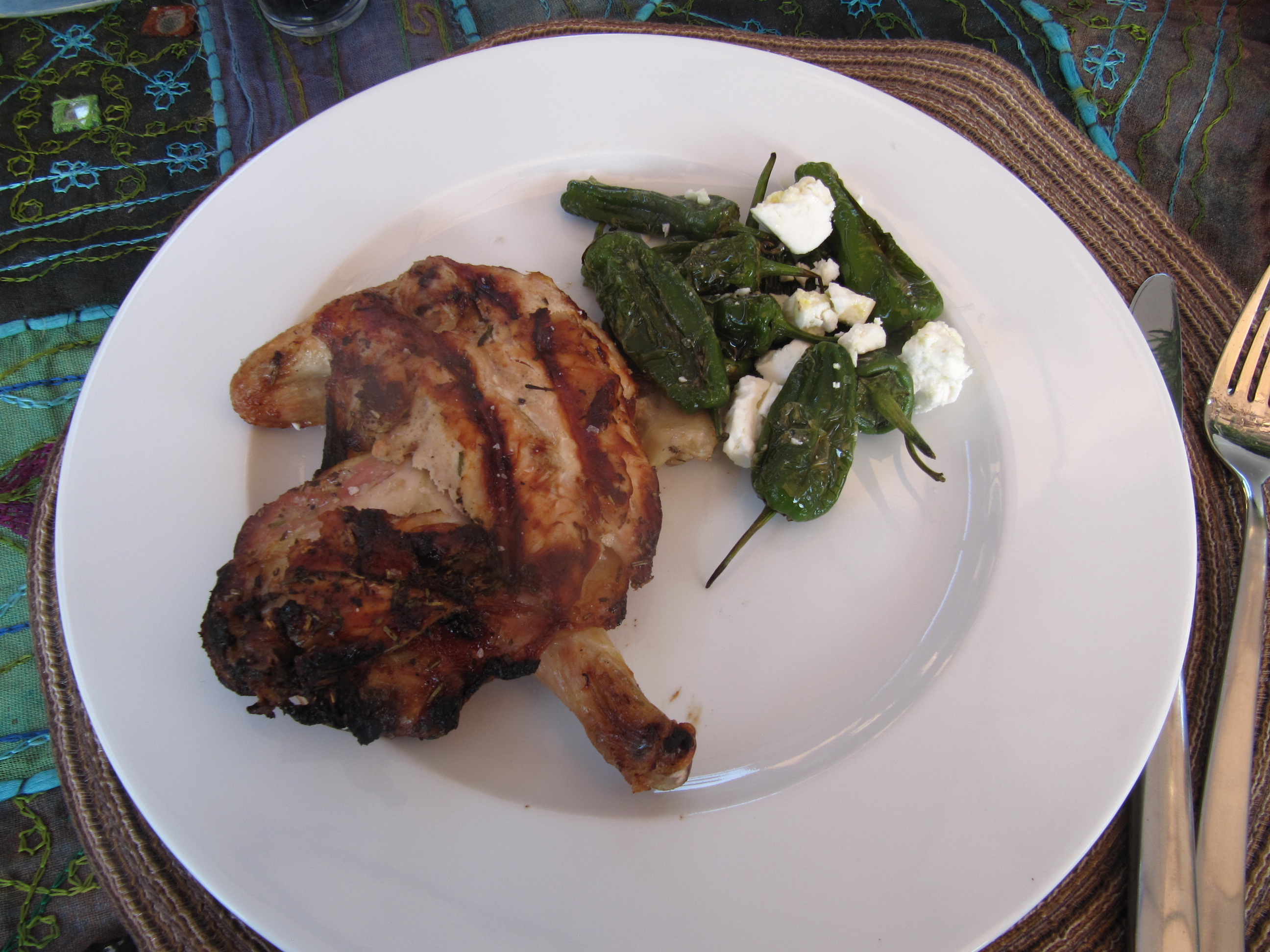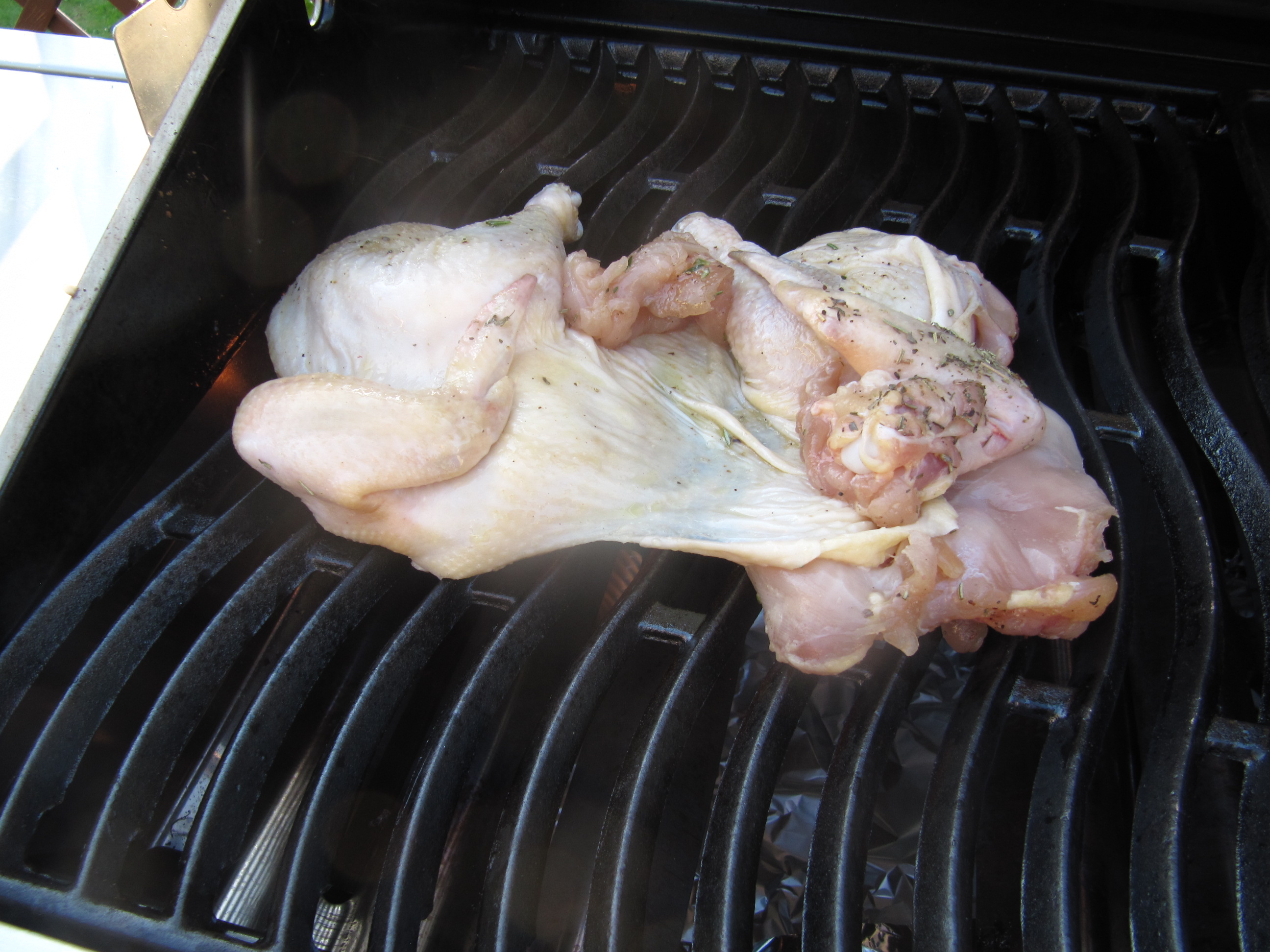 Huhn aus der Marinade nehmen und Zimmertemperatur annehmen lassen. Grillgerät für mittlere Hitze vorbereiten. Huhn mit Knochenseite nach unten über direkte Hitze (ca. 175°C) legen, mit schwerer Gußeisenpfanne beschweren (klappt auch mit 2 Ziegelsteinen, die mit Alufolie umwickelt wurden). Bei geschlossenem Deckel 30 Min. grillen, wenden, wieder beschweren und weitergrillen bis bei Einstechen klarer Fleischsaft austritt. Bei Messung der Kerntemperatur sollten 75°C erreicht werden. (Vorsicht: An dickster Stelle des Schenkels messen, ohne den Knochen zu berühren) Vom Grill nehmen, nach 3-5 Min. Ruhezeit warm servieren.
