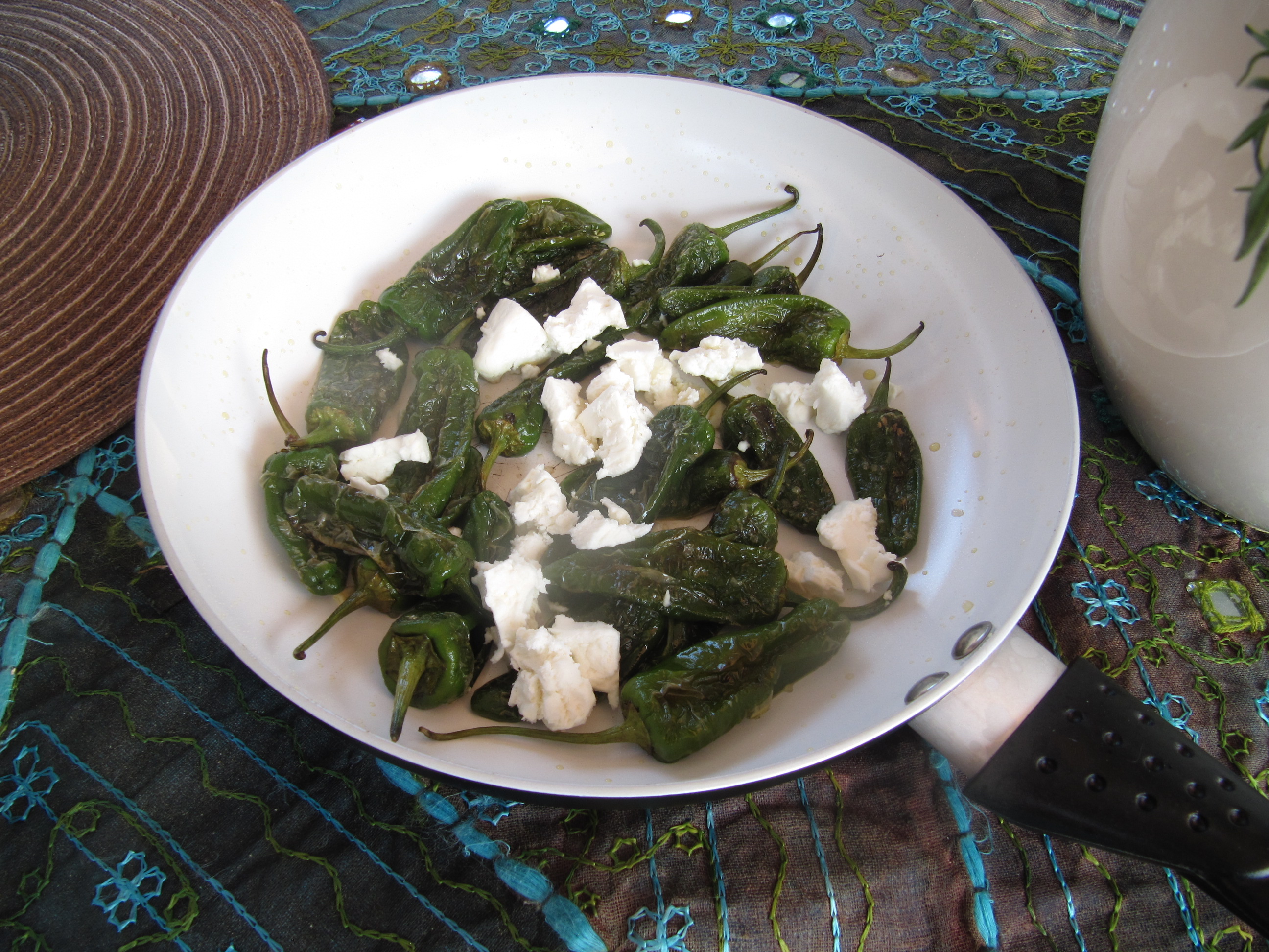 Am Seitenkocher eine Pfanne mit Olivenöl erhitzen und die Pimentos darin braten, bis sie Blasen und leicht gebräunte Stellen an der Schale bekommen. Fetakäse zugeben und durchschwenken. Servieren und mit Salz und Pfeffer würzen. Pimentos werden mit den Kernen gegessen und sind normalerweise nicht scharf. Es kann jedoch fallweise auch ein schärferer dabei sein.