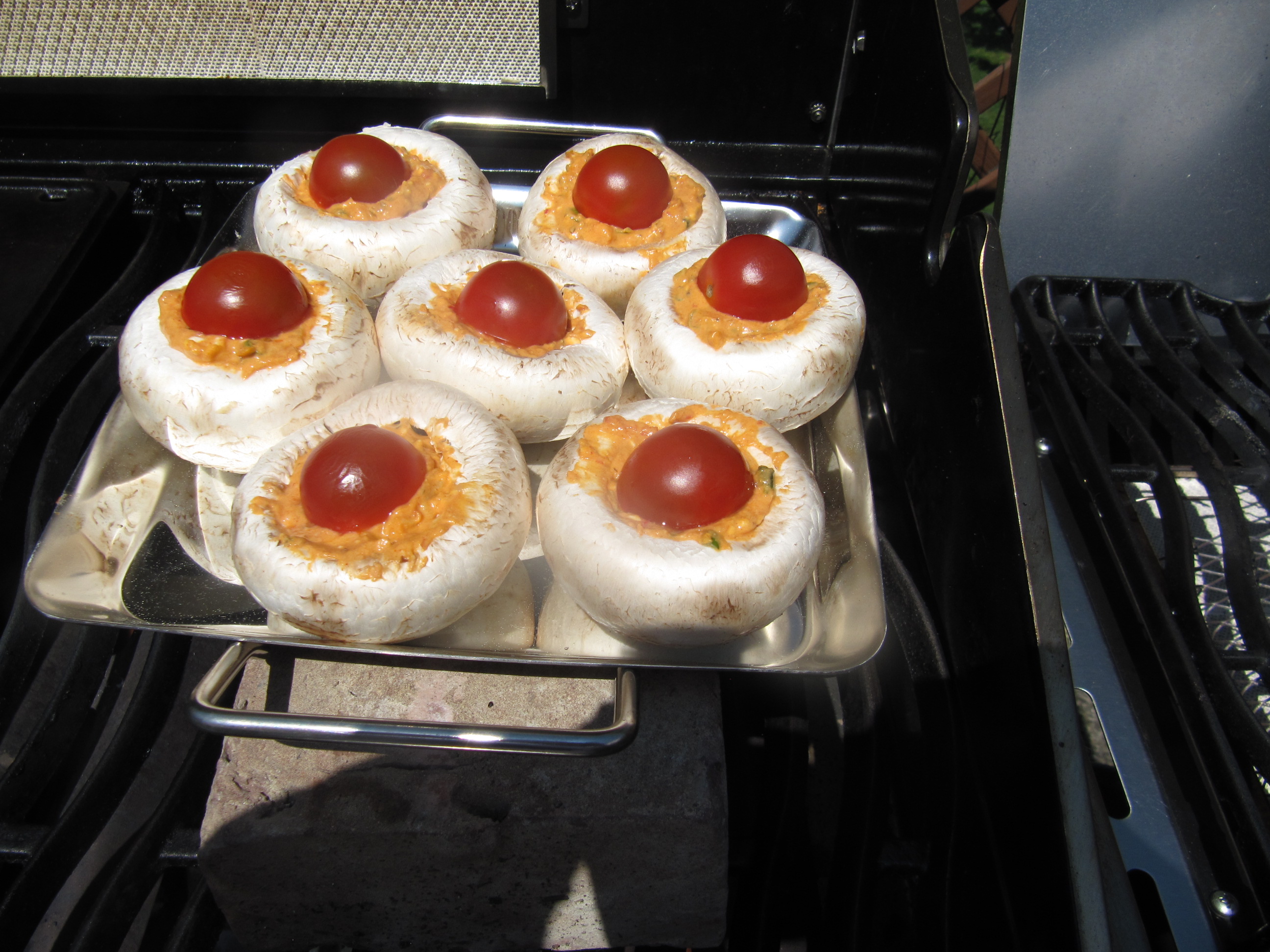 Stiele aus den Champignons rausdrehen, Füllung vermischen und in die Pilzköpfe füllen, oben drauf jeweils 1/2 Cocktailtomate setzen.