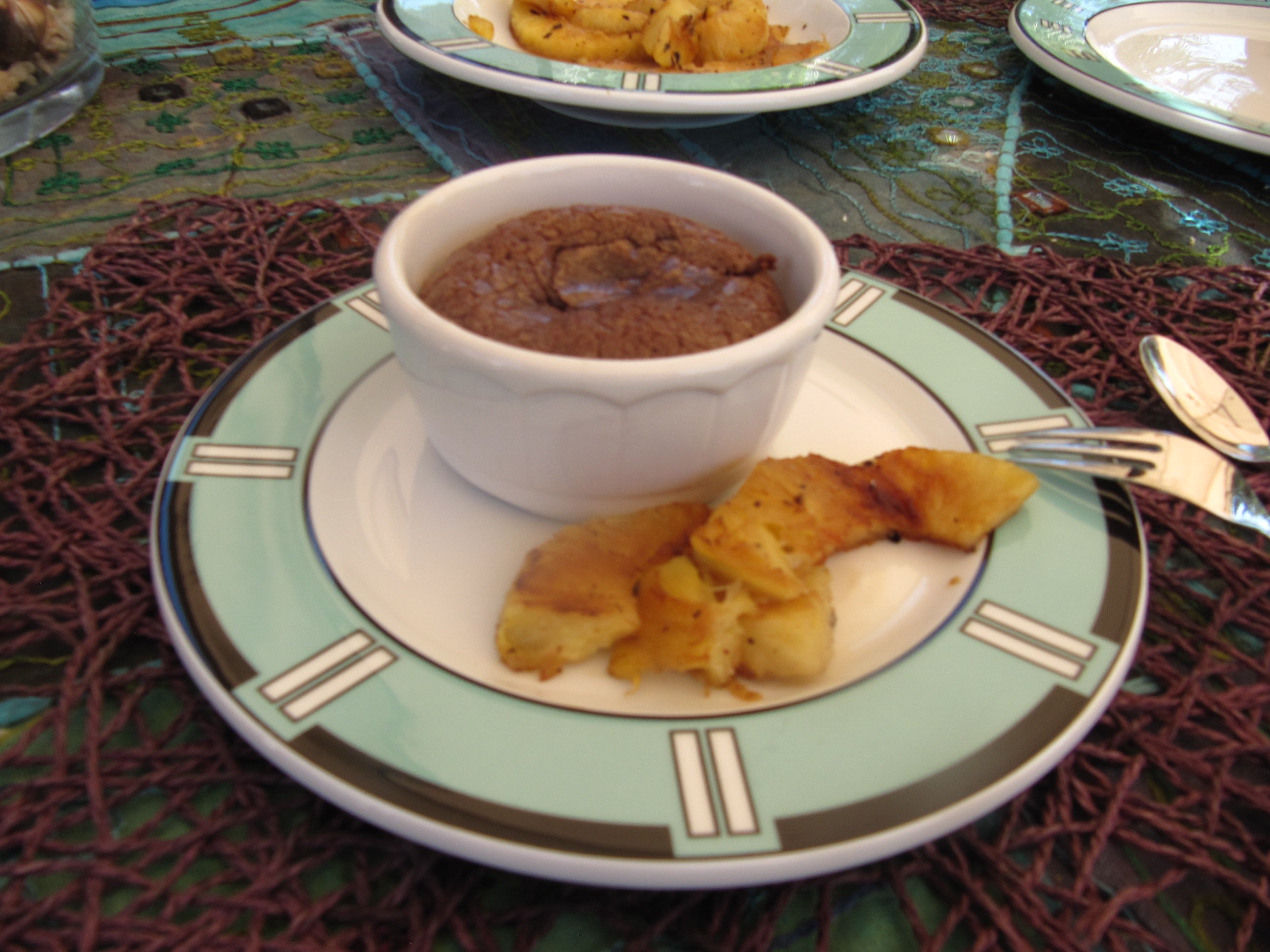 Butter und Schokolade in einem Topf bei Niedrigtemperatur schmelzen. Die Eier mit Zucker in Wasserbad mit Handrührgerät mit Rührbesen schaumig aufschlagen, bis sich das Volumen verdoppelt hat. Schokoladenbutter langsam zugießen und gut vermengen. Mehl mit Schneebesen unterheben. Die Masse bis 1 fingerbreit unter den Rand der vorbereiteten Souffléformen füllen, 6 Std. gekühlt ruhen lassen oder 3 Std.gefrieren. Backofen mit Ober-und Unterhitze auf 200°C aufheizen. Gekühlte Küchlein 12-13 Min. bzw. gefrorene 14 Min. backen. Jetzt sofort mit den gegrillten Ananasstücken servieren.