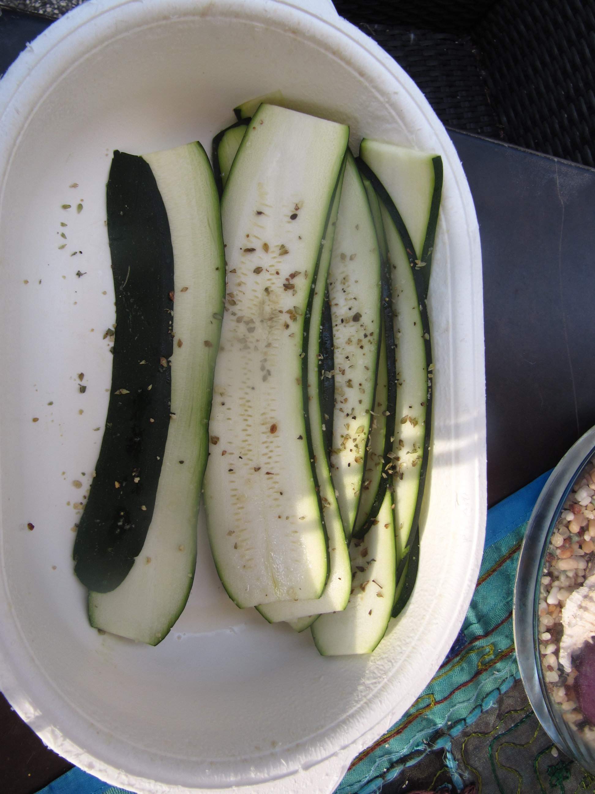 1 große Zucchini mit Sparschäler der Länge nach in feine Scheiben schneiden, mit Olivenöl einstreichen und mit 1/4 EL frisch gehacktem Rosmarin bestreuen, mit frisch gemahlenen schwarzen Pfeffer und Meersalz würzen. Bei starker direkter Hitze auf Gußplatte auf beiden Seiten grillen bis Grillmuster erkennbar ist.