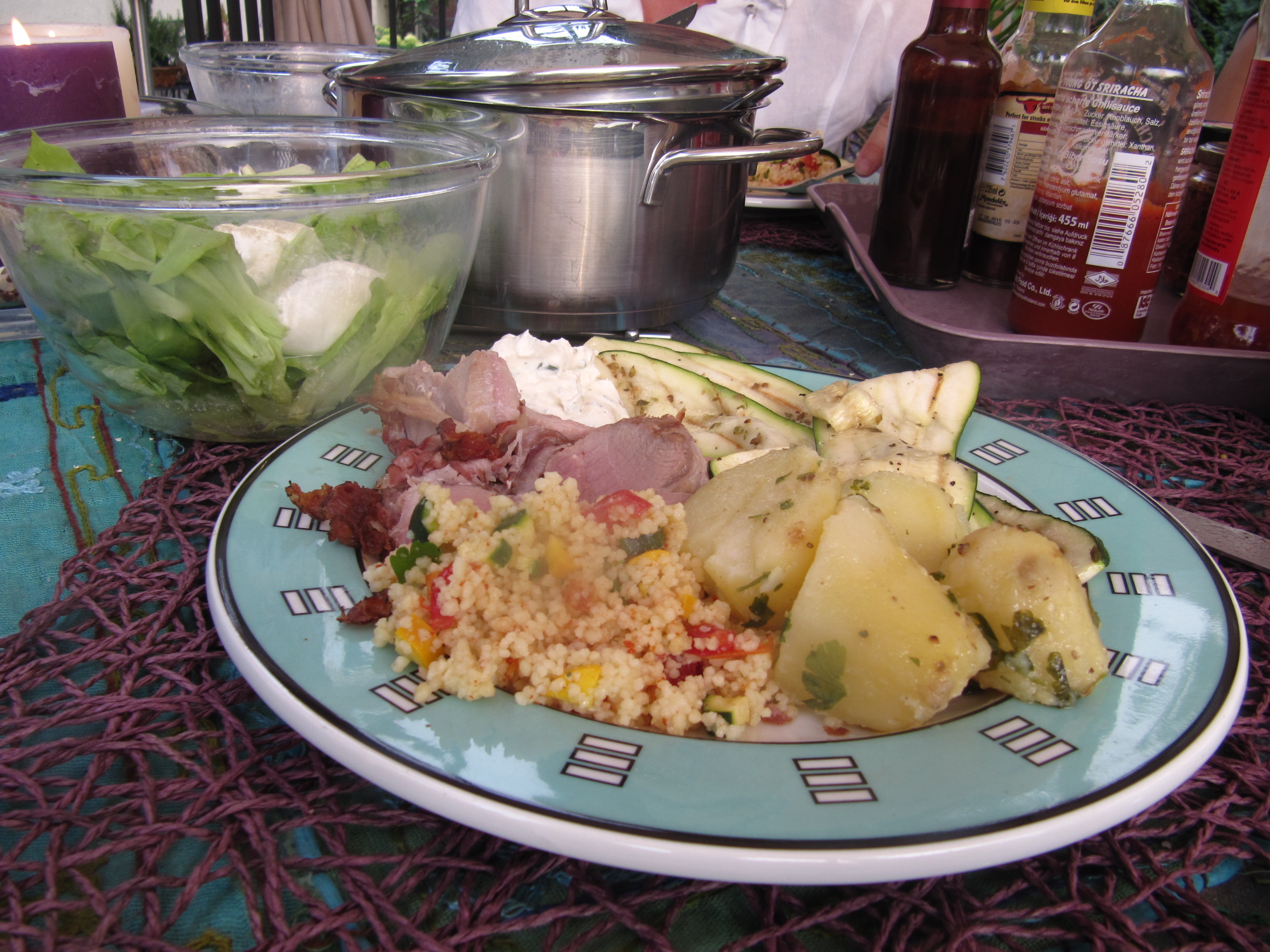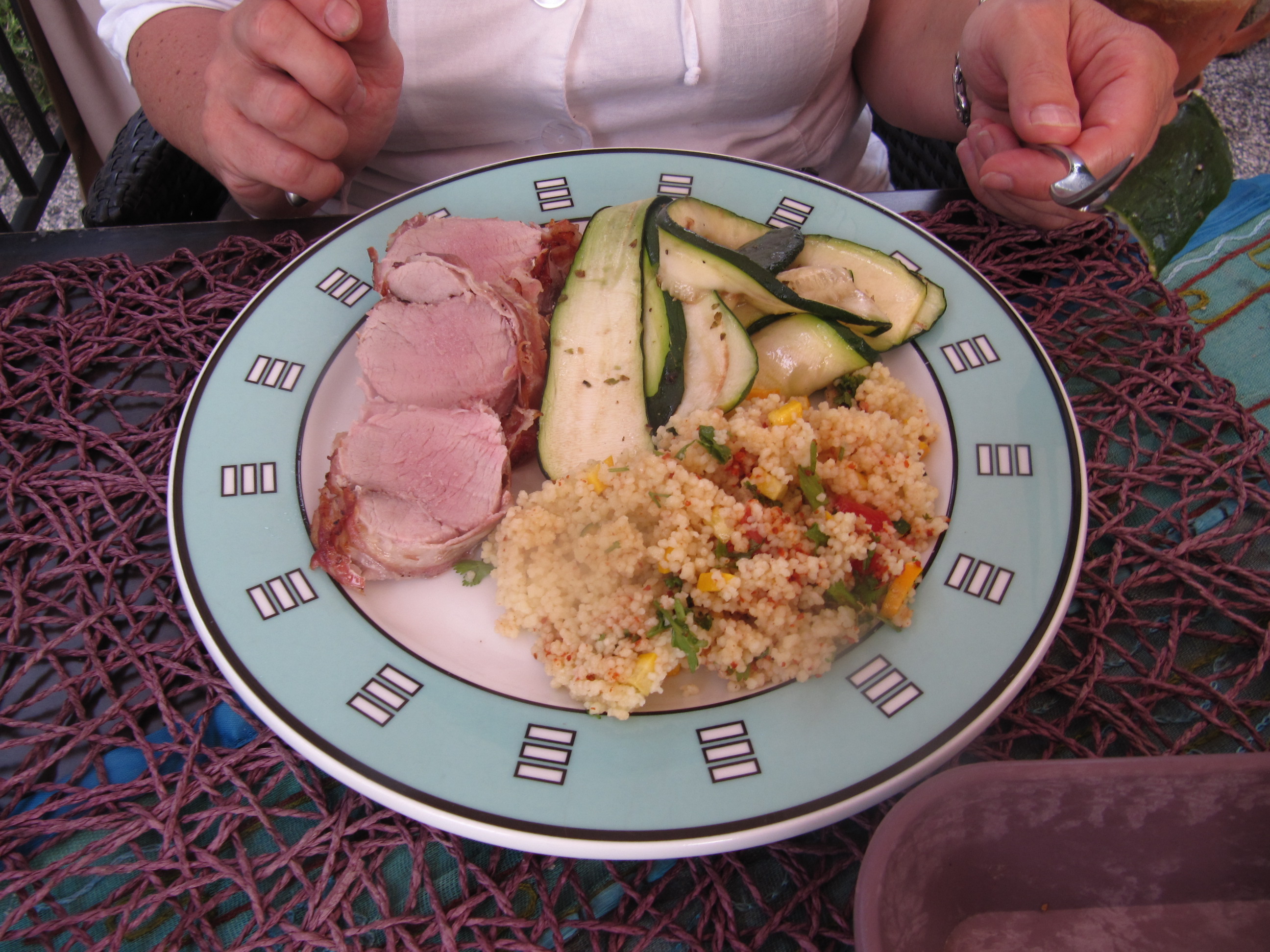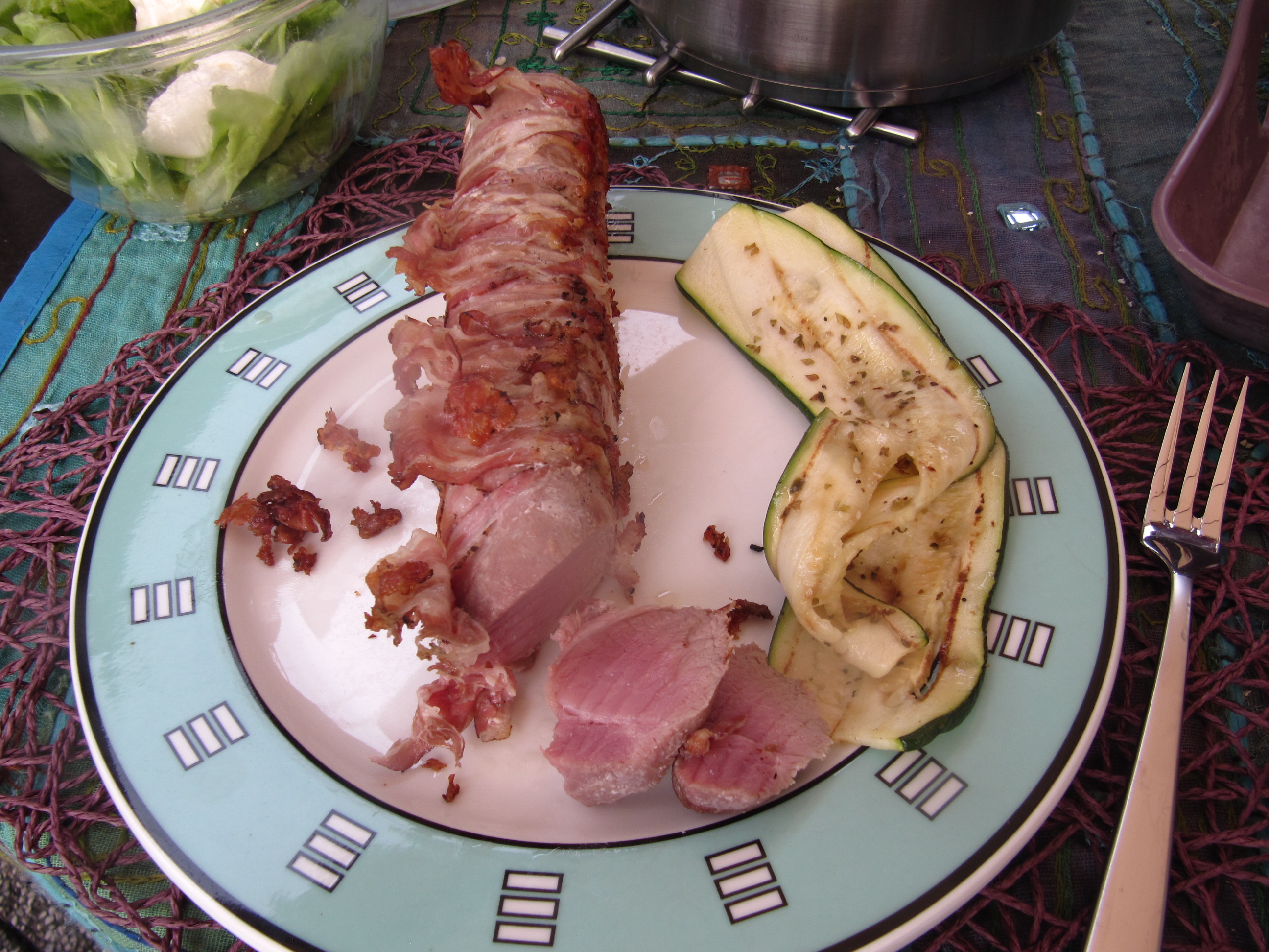 wegen dringend notwendiger Gartenarbeit hatte ich nur Zeit etwas Einfaches am Grill zuzubereiten. Das Schweinefilet im Speckmantel wurde schon fertig gekauft, die Zucchini war nur mit dem Sparschäler zu portionieren und der Couscous-Salat kann schon vorher zubereitet werden.