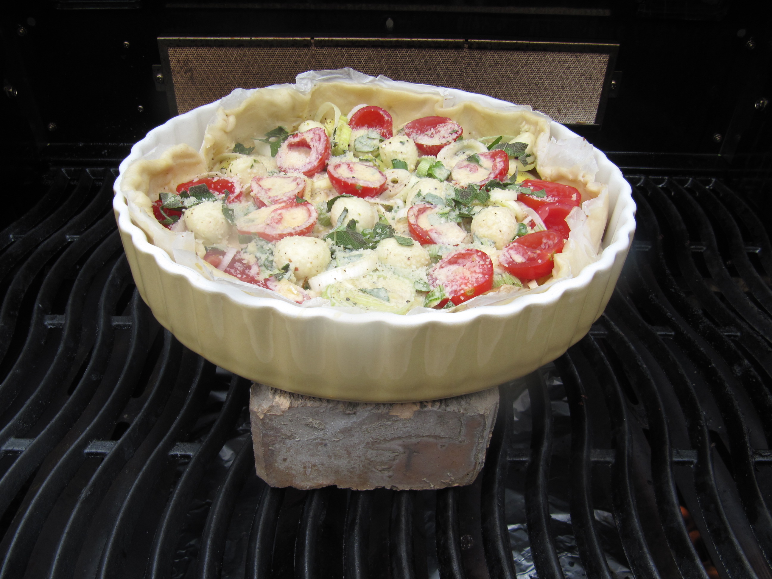 Auflaufform mit Backpapier und Tarte-Teig auslegen, mit 1 verquirlten Ei bestreichen, mit Gemüse, Salbeiblättern und Mozzarella belegen. 2 Eier mit Sauerrahm, 1/2 TL geräuchertes Paprikapulver, Meersalz und Langpfeffer gemahlen, verquirlen, über der Tarte verteilen und mit Parmesankäse bestreuen. Grill für indirekte Hitze vorbereiten, die Auflaufform mit der Tarte auf einen Ziegelstein am Rost stellen (zur Hitze-Entkoppelung) und bei 220°C ca. 45 Min. grillen. Mit den Karreesteaks servieren.