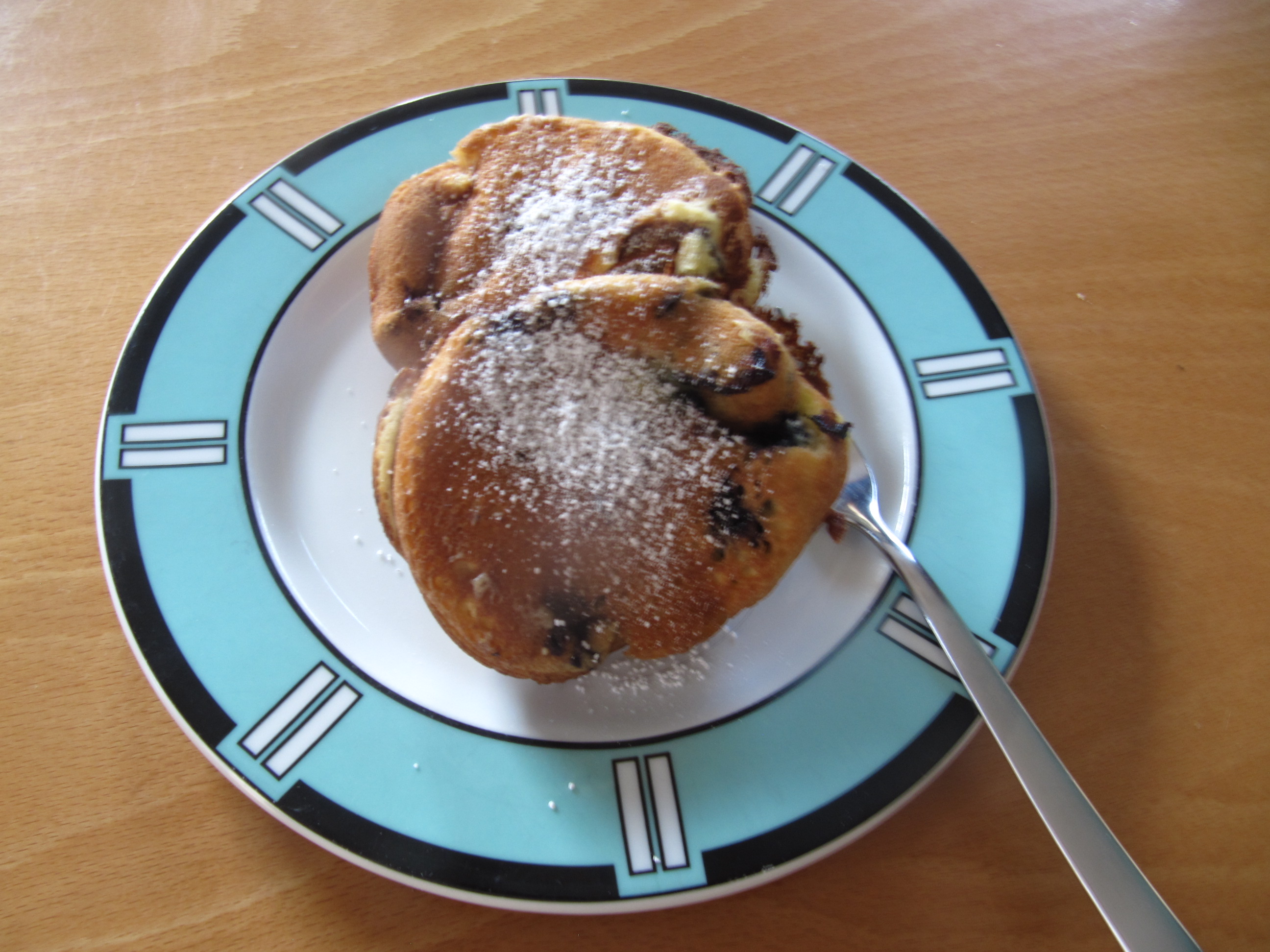 Die beiden Eier zusammen mit dem Zucker schaumig schlagen, anschließend weiche Butter, Wasser, Milch und die Prise Salz unterrühren. Nach und nach das Backpulver und das Mehl rein sieben, durchmixen und zu guter Letzt die Heidelbeeren hinzugeben. Den Teig für ca. 30 Minuten im Kühlschrank ruhen lassen.