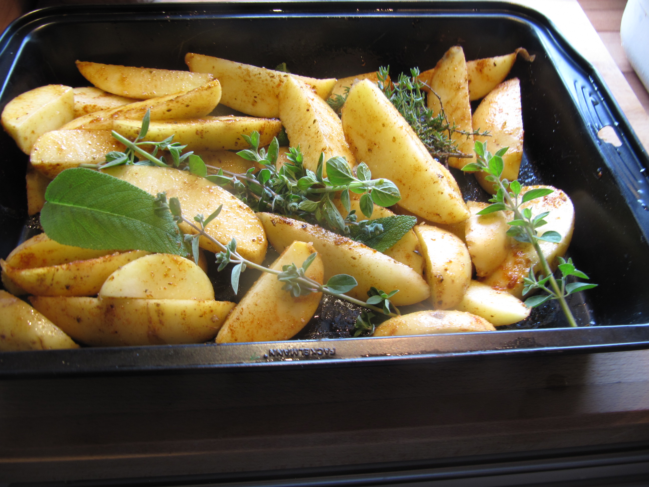 Wasser, Öl und Gewürze gut miteinander verrühren. Die Kartoffeln waschen, vierteln und mit der Mischung marinieren. Die Kartoffelspalten mit den Schnittflächen nach oben auf ein Backblech setzen, Kräuter zugeben und im vorgeheizten Backofen bei 220°C ca. 25 Minuten backen. Heiß servieren.