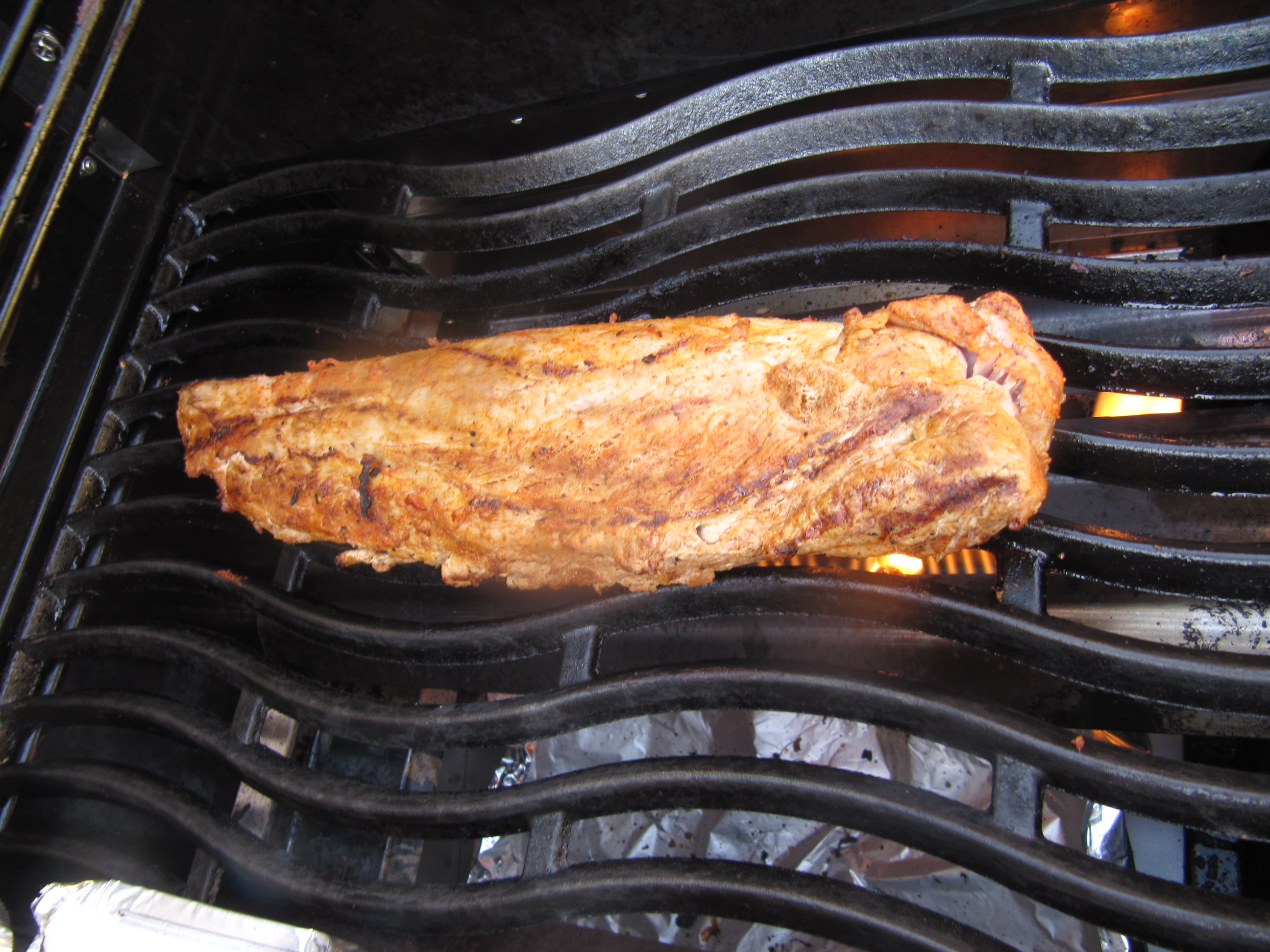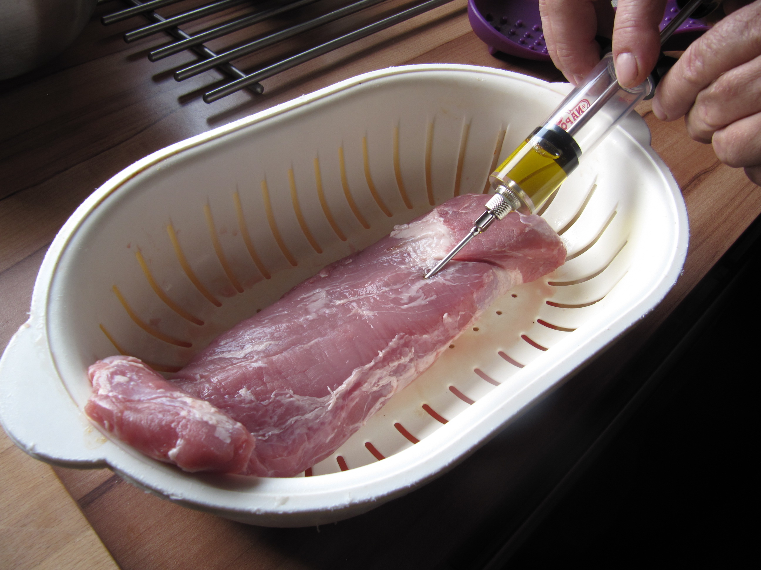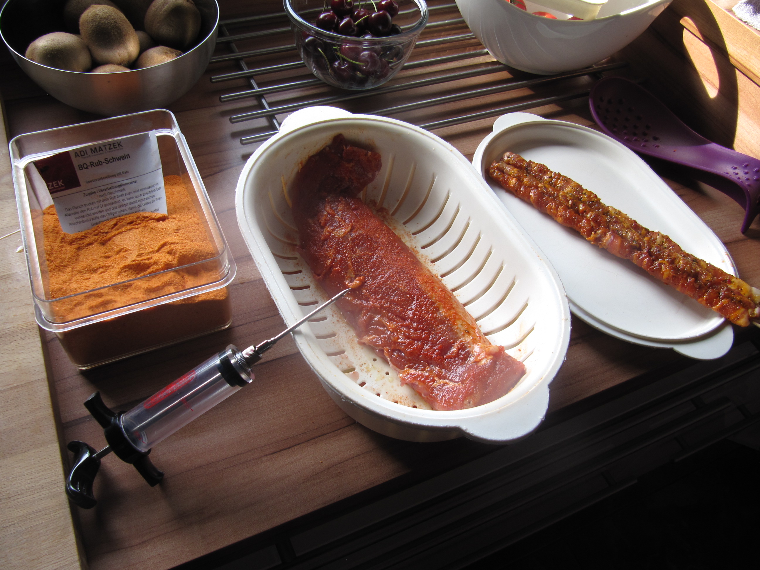 Essig und Öl mit Marinierspritze an mehreren Stellen ins Fleisch spritzen, Filet mit Rub und Paprikapulver würzen und 1/2 Stunde in Frischhaltefolie kühl stellen. Danach Raumtemperatur annehmen lassen, Schweinefilet auf allen Seiten bei direkter starker Hitze angrillen bis Grillmuster zu sehen ist. Danach bei indirekter Hitze (130°C) 25 Min. fertiggaren und abgedeckt bei Raumtemperatur 10 Min. ruhen lassen. Kann danach aufgeschnittn und serviert werden.