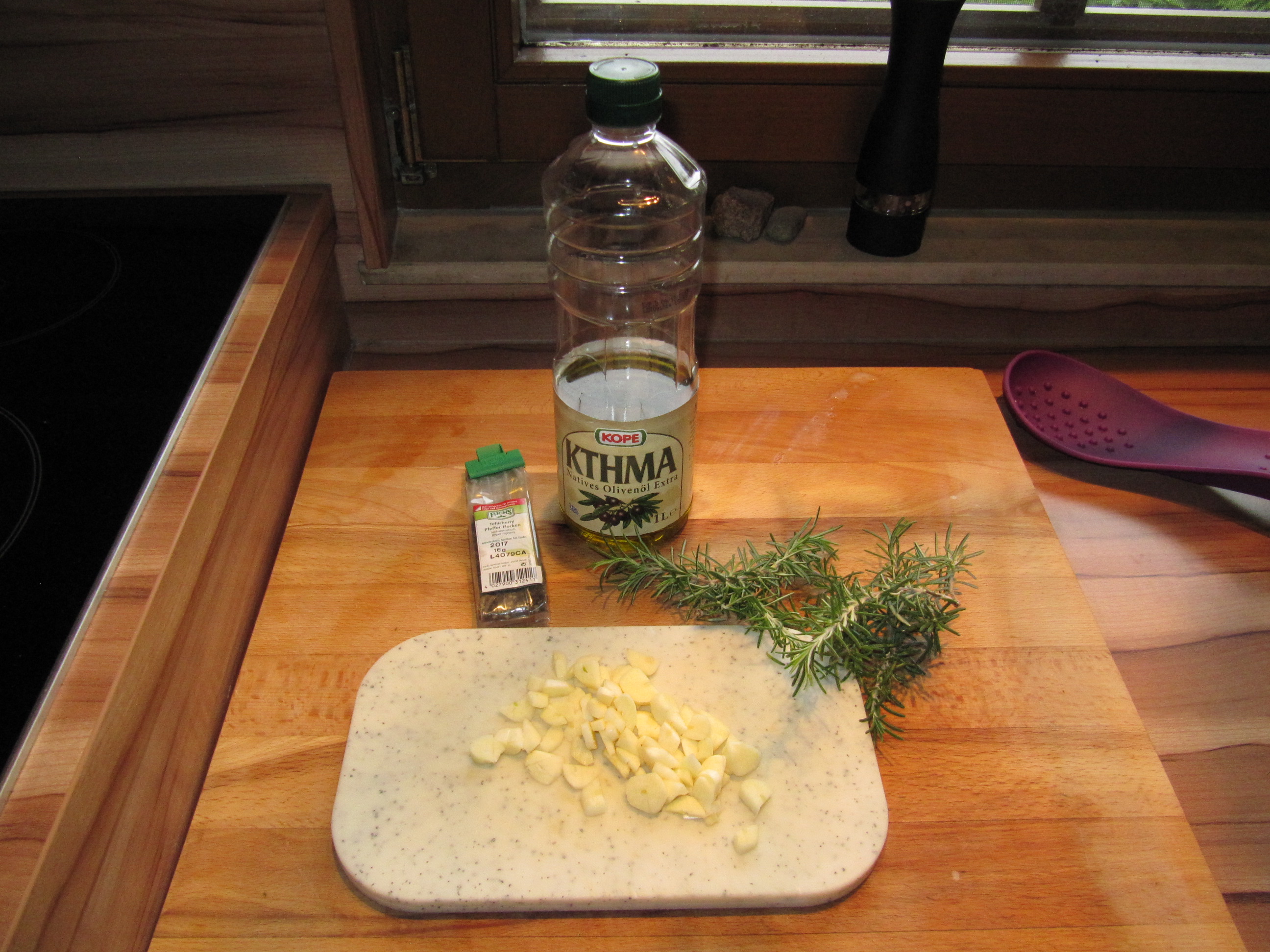 hier das Rezept für Rosmarinöl : 0,75 L Olivenöl, 4 Rosmarinzweige, 4 Knoblauchzehen in Scheiben geschnitten, 1 TL Tellicherry Pfeffer-Flocken in einem Topf auf 70°C erhitzen und 20 Min. leicht simmern lassen. Abkühlen, über Nacht ziehen lassen, abseihen und in Glasflasche füllen.