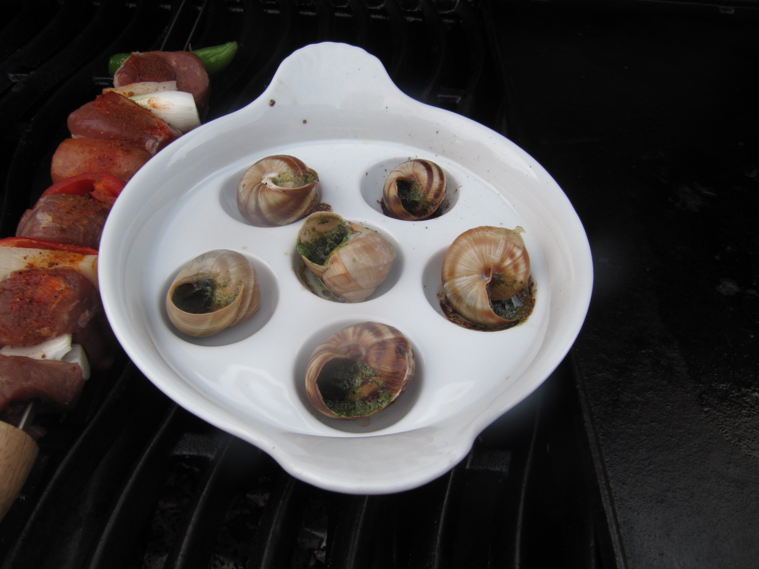 In einem Schneckenförmchen in der Indirekten Zone bei 130°C grillen, bis Kräuterbutter geschmolzen und Schnecken weich sind. Mit Baguette Kräuterbutter raustunken und mit Hilfe eines Schneckenbestecks die Schnecken aus dem Gehäuse rausziehen und essen.
