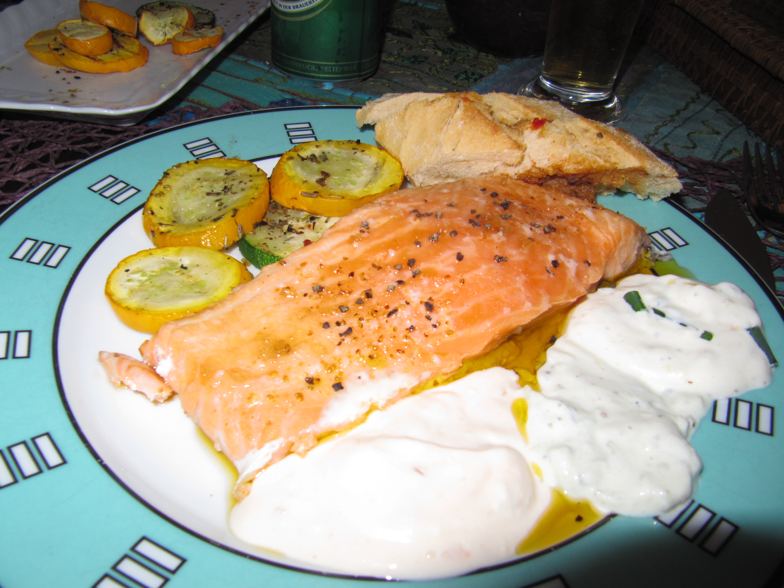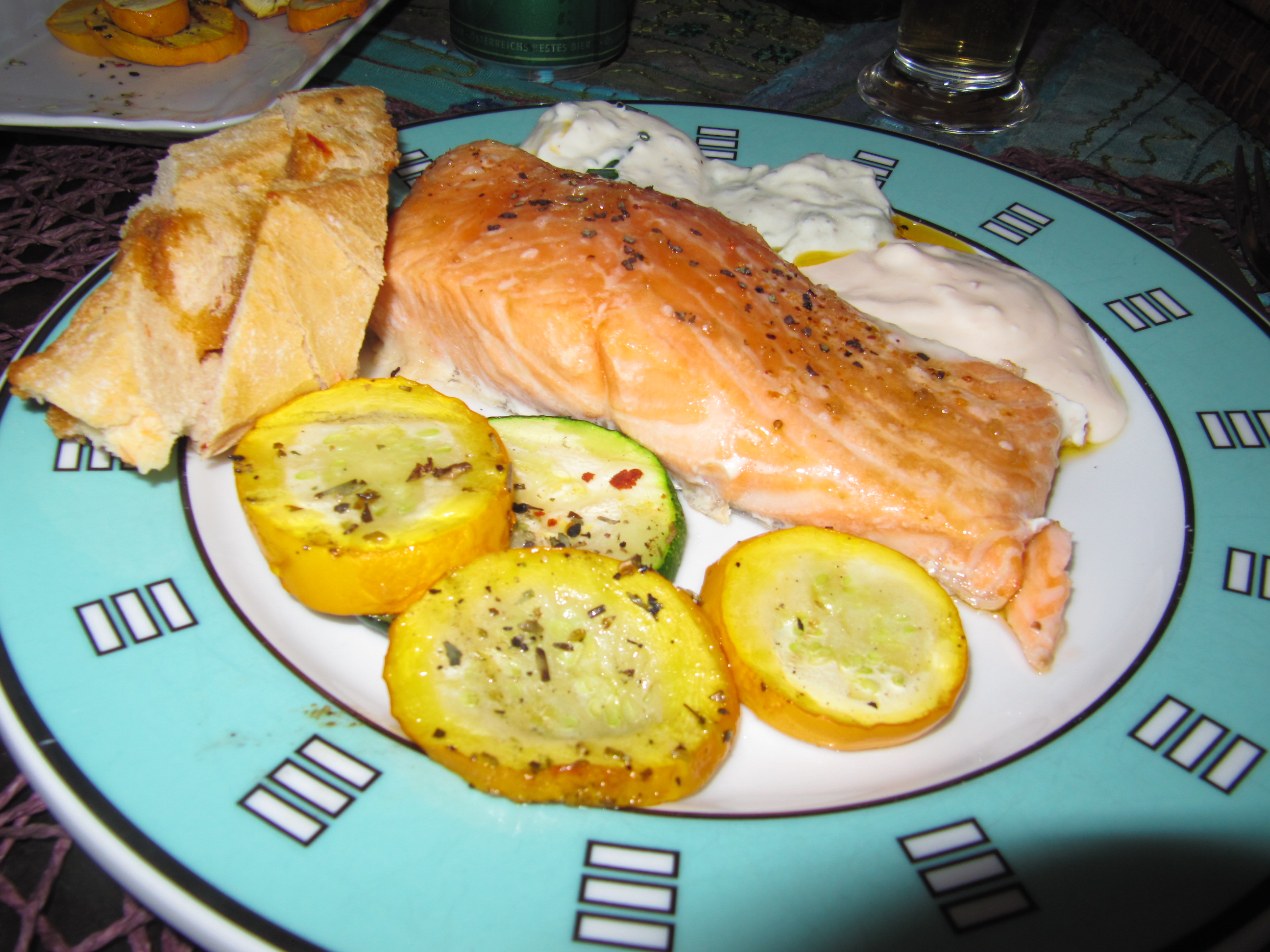 Da uns dieses Gericht so gut schmeckt und ich zufälligerweise auch ein Stück Lachs zu Hause hatte, machte ich wieder einmal Lachs auf der Zedernplanke. Ist ein leichtes Gericht für die heißen Tage.