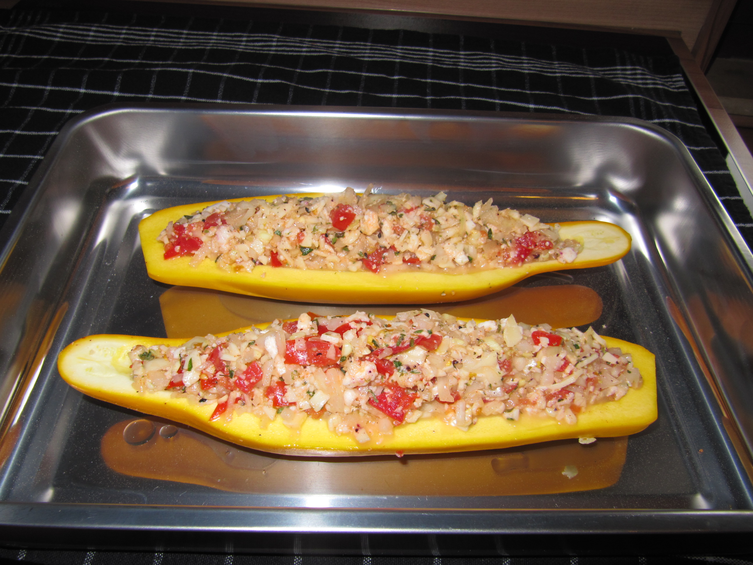 1 mittlere Zucchini der Länge nach durchschneiden und aushöhlen, daß eine Mulde entsteht.