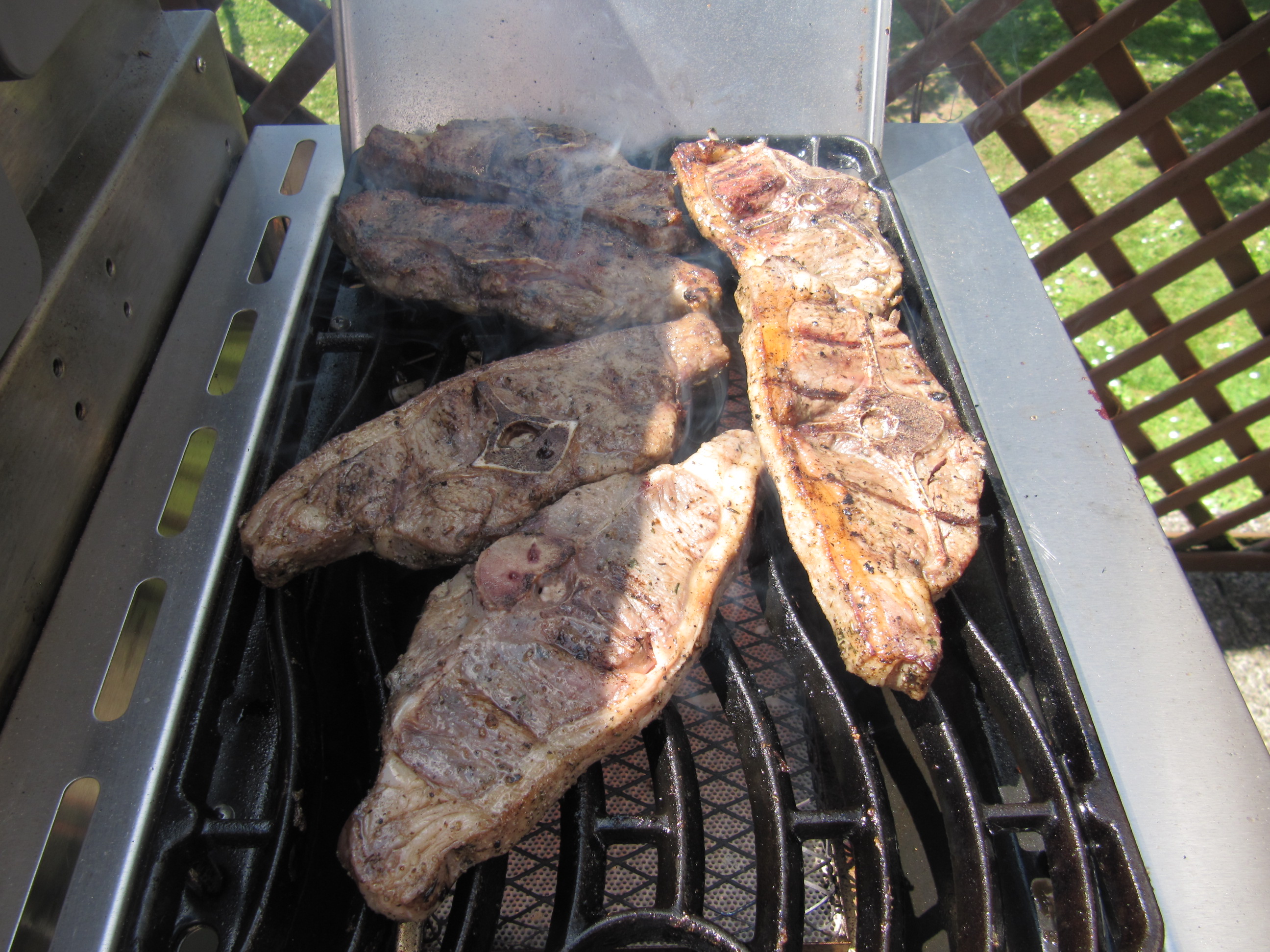 Danach aus dem Kühlschrank nehmen und Zimmertemperatur annehmen lassen. Auf der Sizzlezone je 1,5 Minuten bei starker Hitze auf beiden Seiten grillen. Nun mit je 1 Rosmarinzweig in Alufolie ( glänzende Seite nach innen ) wickeln und bei indirekter niedriger Hitze 5 Minuten rasten lassen.