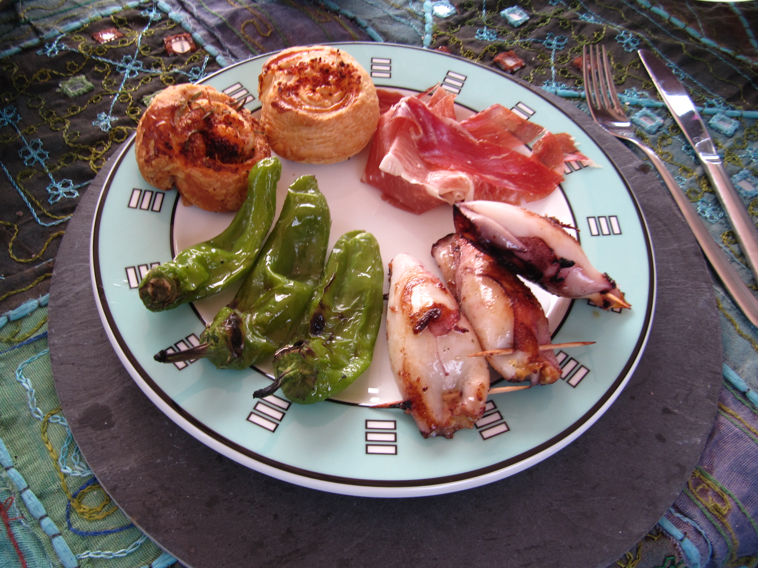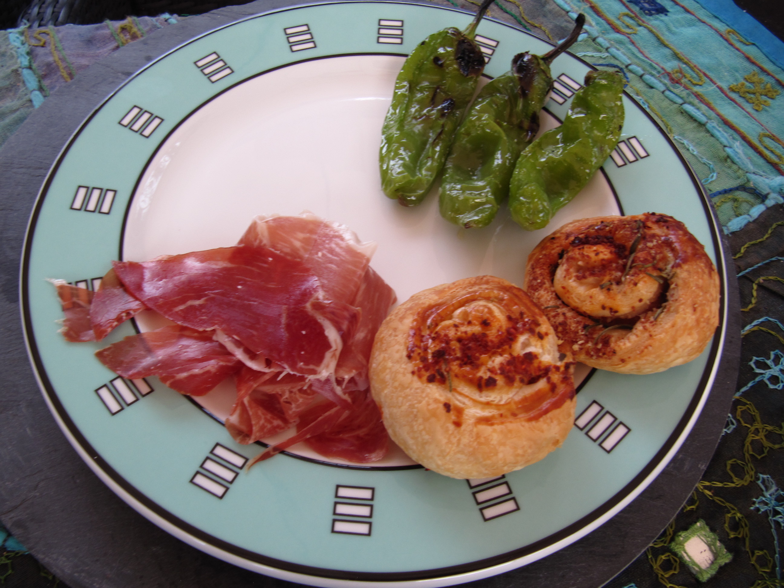 Als Beilage wurden Pimentos ( Spanische Bratpaprika ) in etwas Olivenöl in der Gußpfanne bei mittlerer Hitze gebraten. Der Prosciutto Pata Negra ist ein fertig aufgeschnittenes Produkt gewesen.