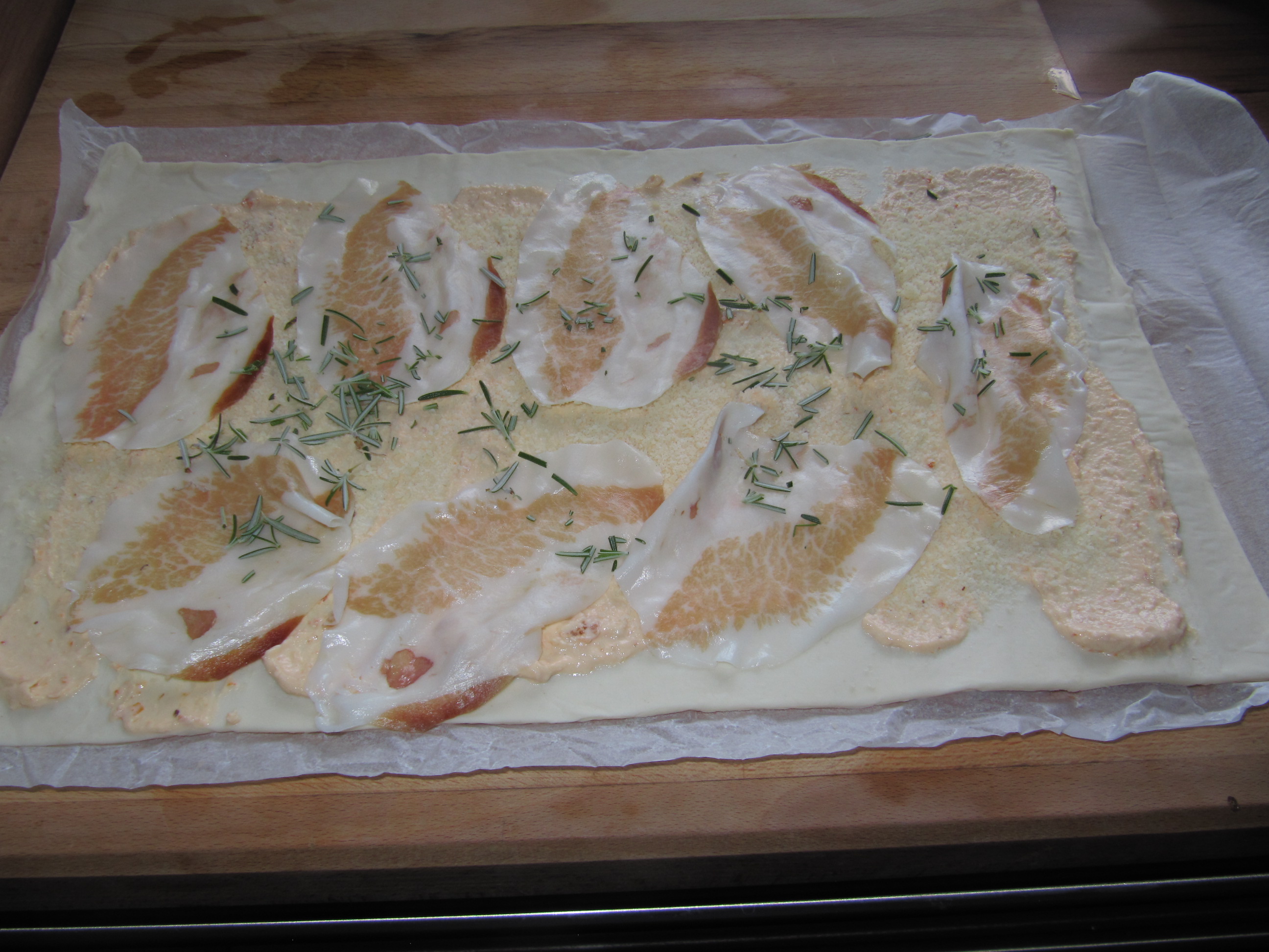 1 Pkg. Croissant-Teig ausrollen und mit 1/2 Becher Philadelphia getrocknete Tomate bestreichen, mit 4 EL Parmesankäse und 2 EL frisch gehacktem Rosmarin bestreuen und mit 8 Scheiben Bauchspeck belegen. Teig der Länge nach einrollen und in 2 cm dicke Scheiben schneiden. Backblech mit Backpapier oder Dauerbackfolie belegen, Scheiben draufgeben mit Ei bestreichen und 20 Minuten bei Ober- und Unterhitze auf mittlerer Schiene bei 190°C im Backrohr backen. Alles gemeinsam servieren.