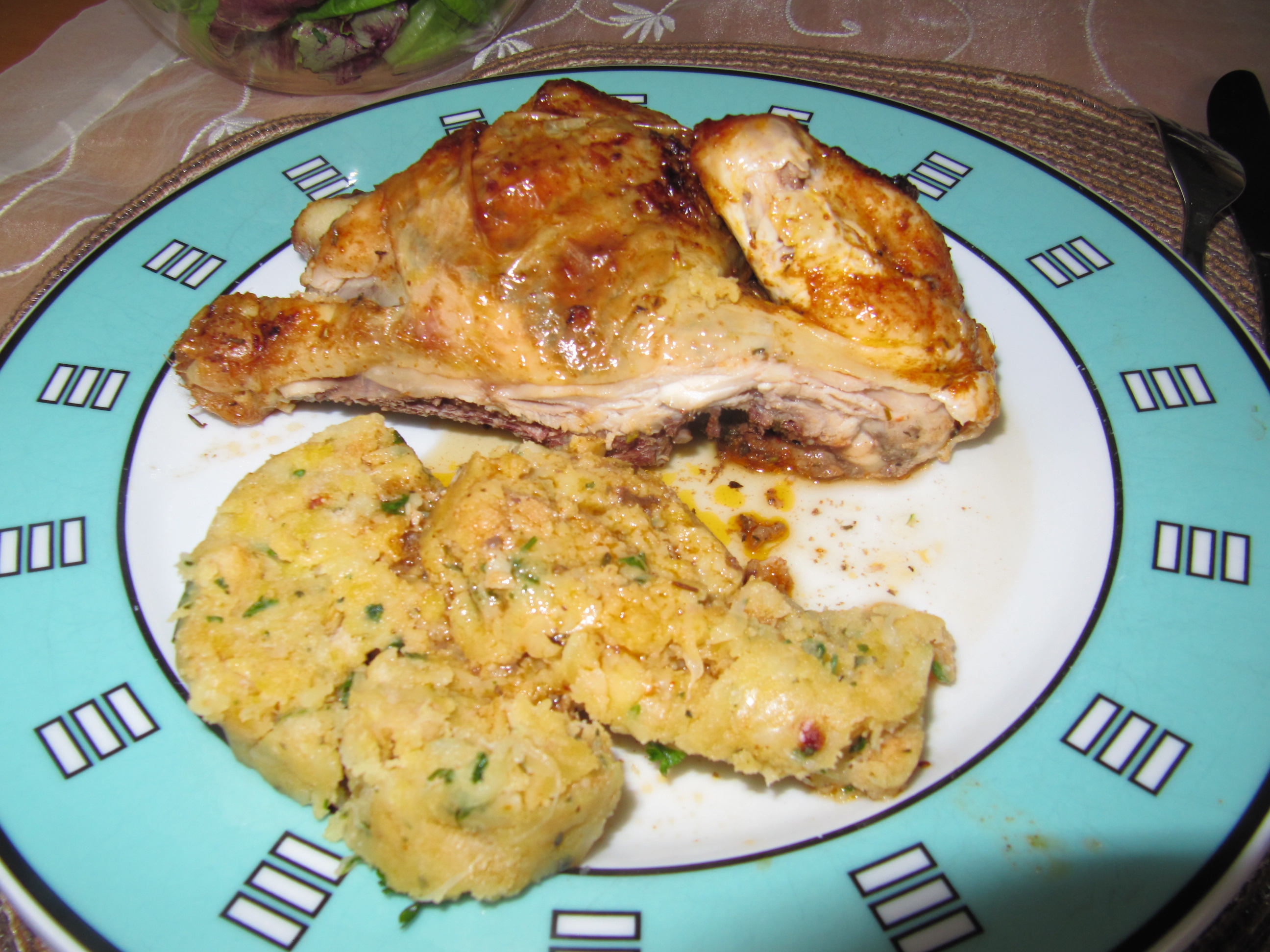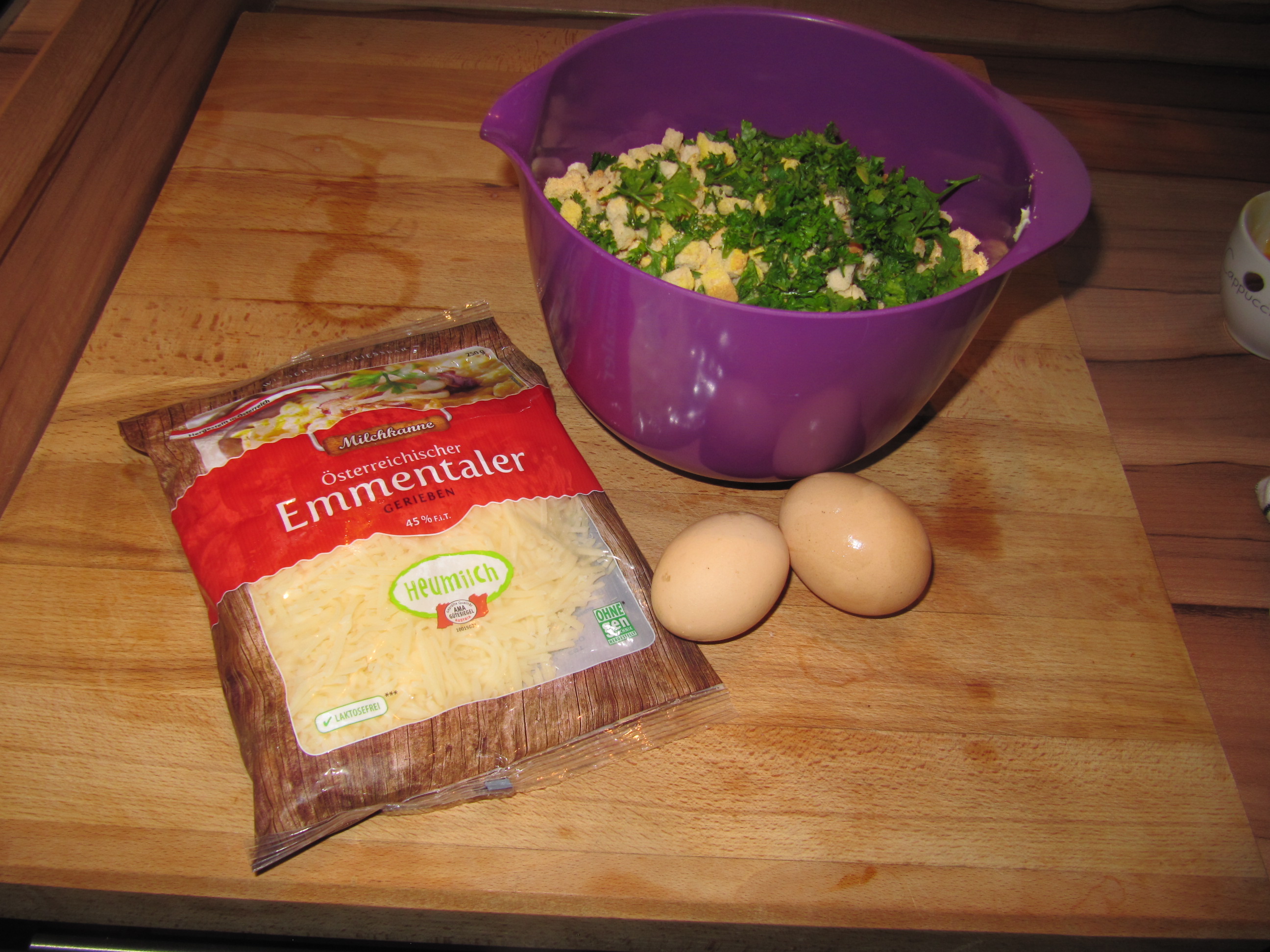250 g Emmentalerkäse gerieben, 250 g Semmeln vom Vortag in Würfel geschnitten, 125 ml Milch, 2 Eier, 1 Zwiebel gehackt, 50 g Butter, Petersilie gehackt, 1/2 TL Kümmel, 30 g Mehl, Sonnenblumenöl, frisch geriebener Parmesankäse, zerlassene Butter.