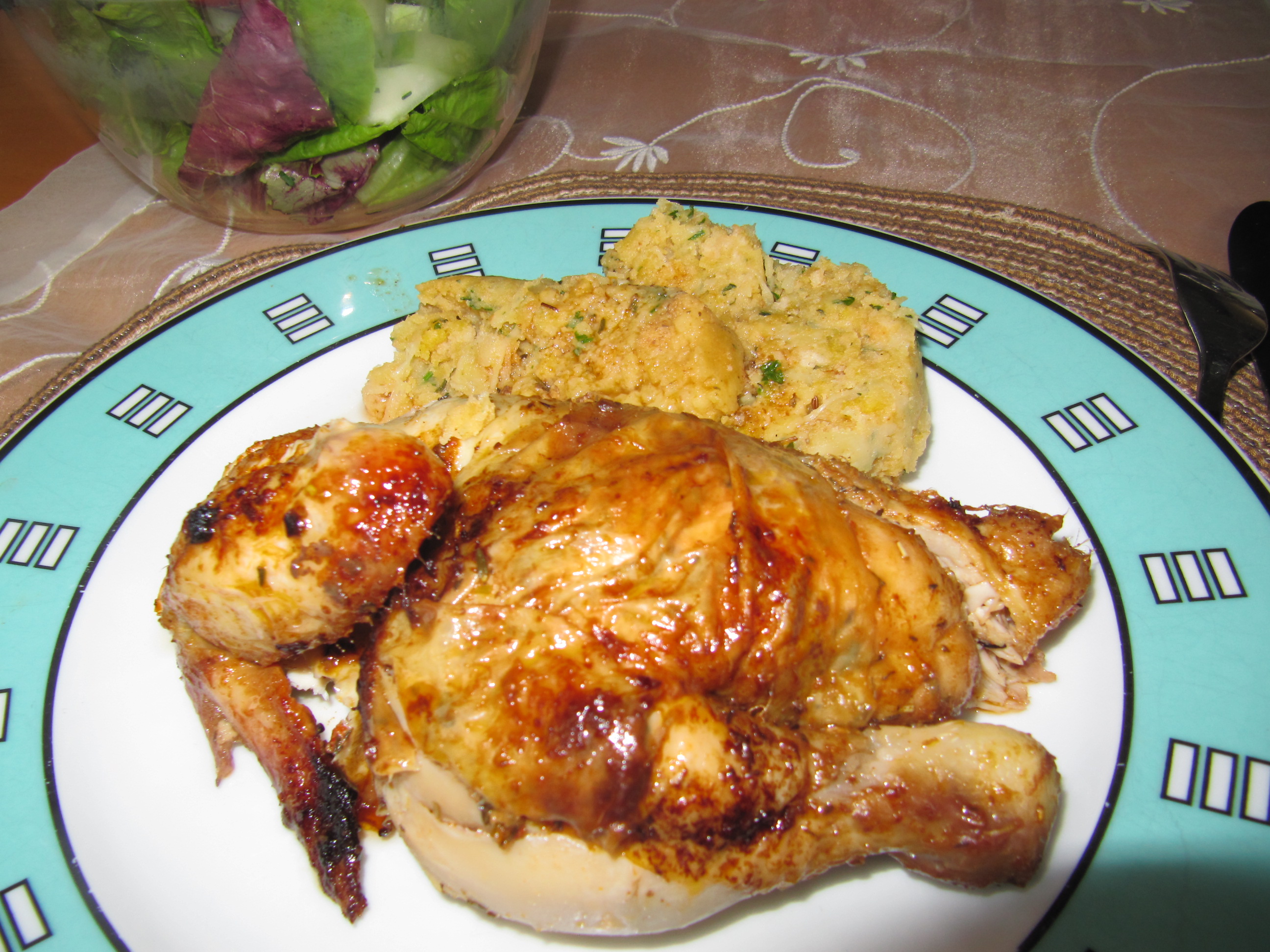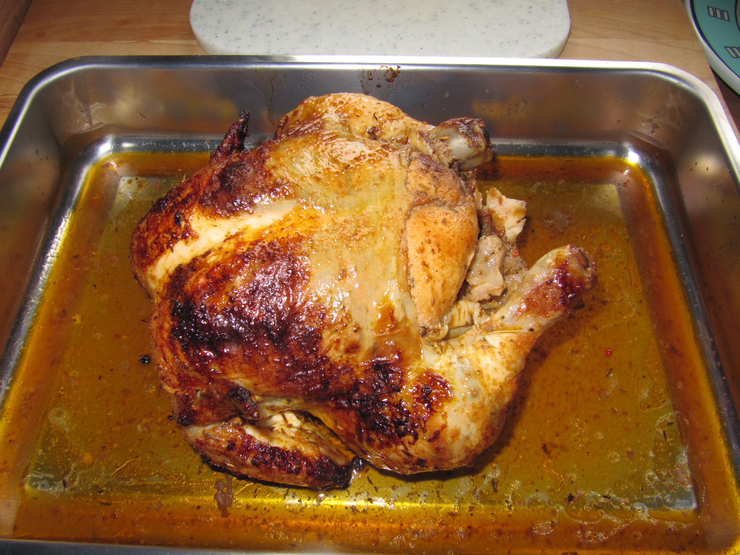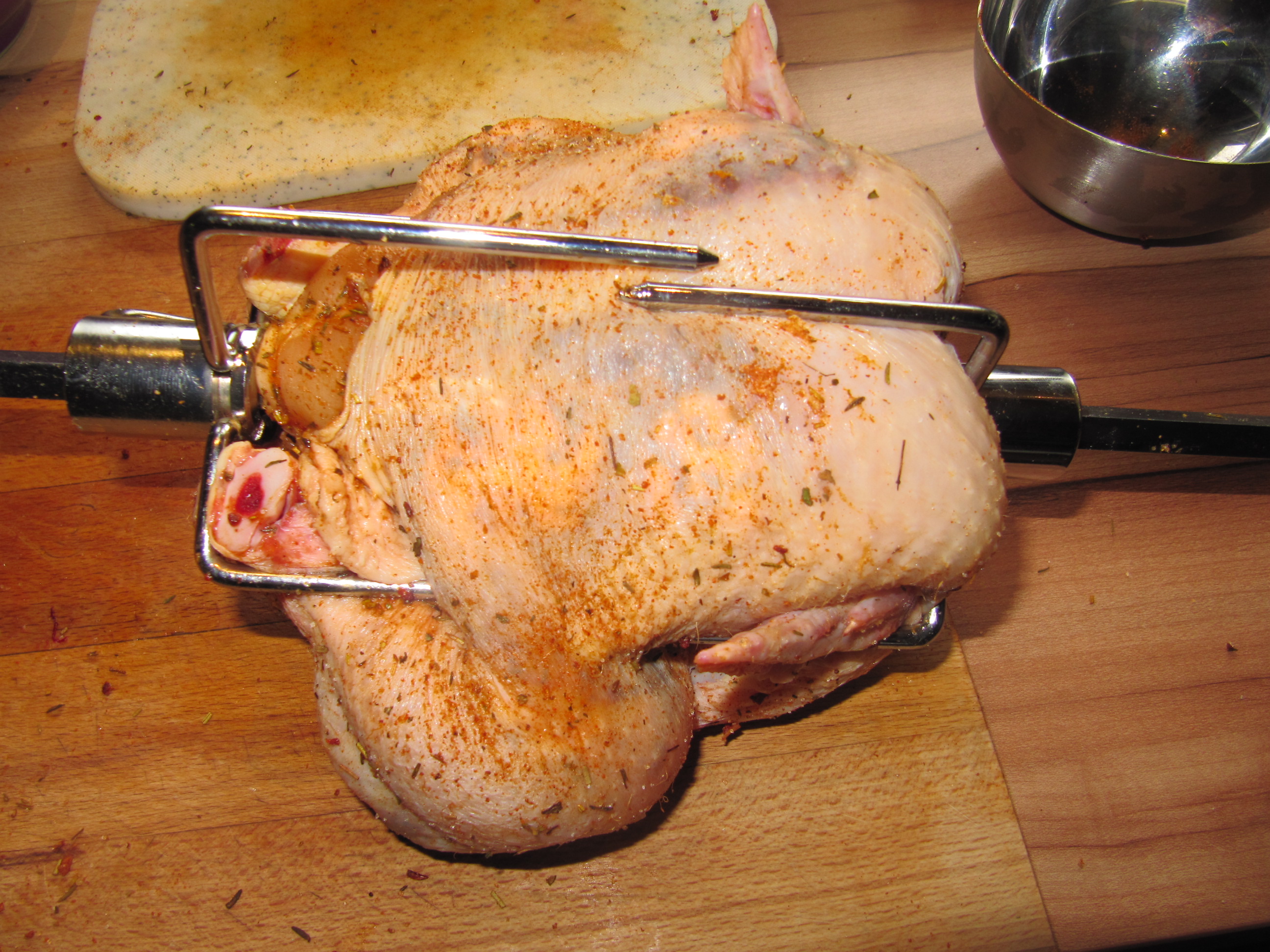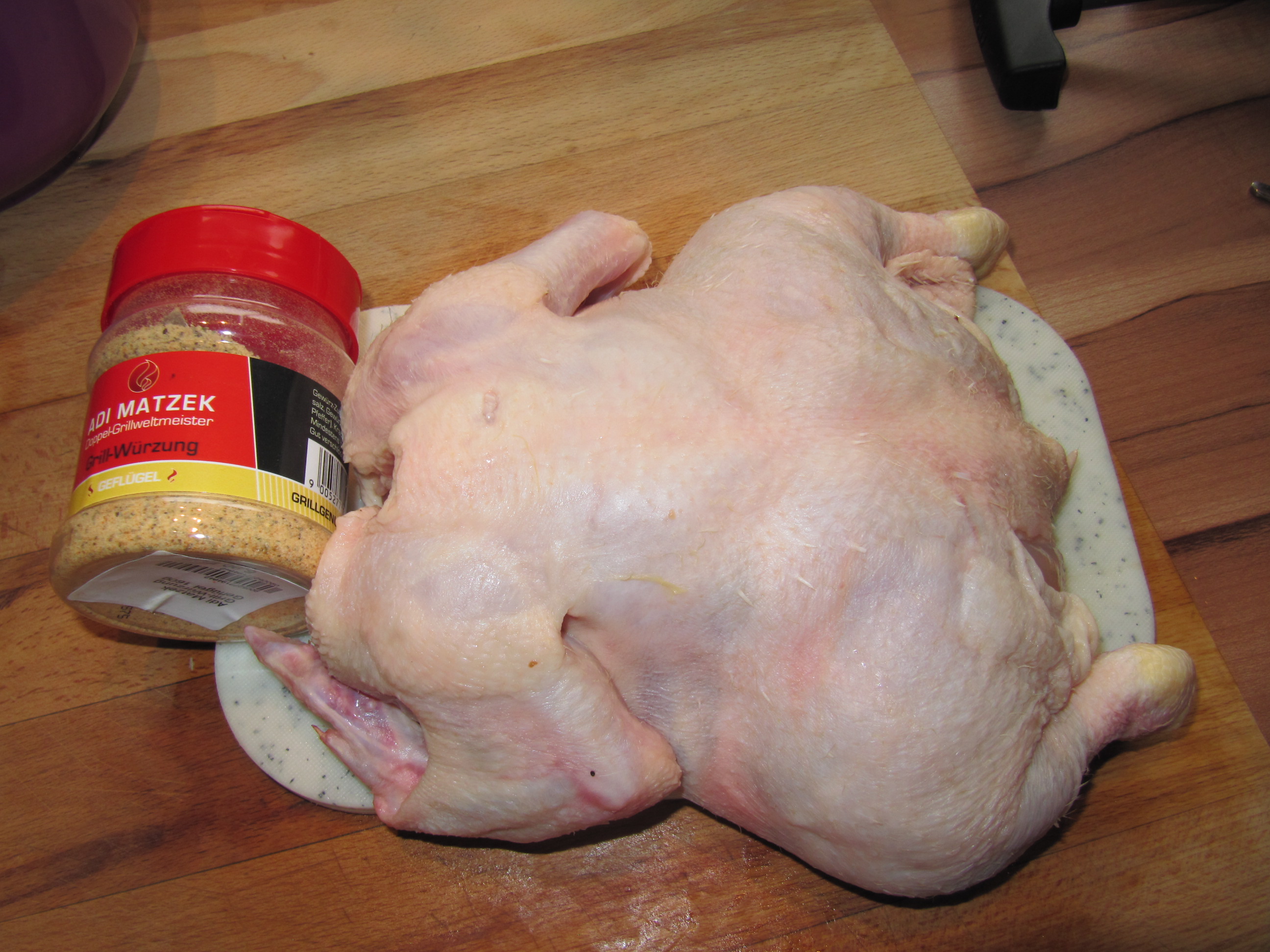 1 küchenfertiges Huhn ca. 1,5 kg, mit 1 EL Butter und 1 EL Adi´s Geflügelgewürz vermischt, würzen. Dazu vom hinteren Ende her mit den Fingern vorsichtig unter die Haut der Brust fahren. Um die Haut an den Oberschenkeln zu lösen, benutzt man einen einzelnen Finger. Die gewürzte Butter auf das Brustfleisch und auf die Oberschenkel streichen ohne die Haut zu verletzen. Restliche Butter gleichmäßig über der Außenseite des Huhns verteilen. Dieser Aufwand wird durch besseren Geschmack und Saftigkeit belohnt ! Das Huhn auf den Drehspieß aufspannen, falls die Keulen und Flügel nicht fixiert werden können, mit Küchengarn festbinden. Den Grill für indirekte mittlere Hitze ( ca. 190°C ) vorbereiten. Eine Pfanne bzw. Aluschale mit 250 ml lauwarmen Wasser unterstellen. Das Huhn bei eingeschaltenem Drehspießmotor bei geschlossenem Deckel 1 Std. grillen und immer wieder mit abgetropften Saft bestreichen. Am Ende der Grillzeit den Infrarotbrenner für einige Minuten zuschalten, um eine knusprige Haut zu bekommen. Wenn die Kerntemperatur von 75°C am dicksten Teil des Schenkels, ohne den Knochen zu berühren gemessen wird, ist das Huhn fertig. Haltezinken lösen und das Huhn senkrecht in die Saftschale gleiten lassen, damit Saft aus dem Inneren abtropfen kann. Nach 10 Min. Ruhezeit kann tranchiert und serviert werden.