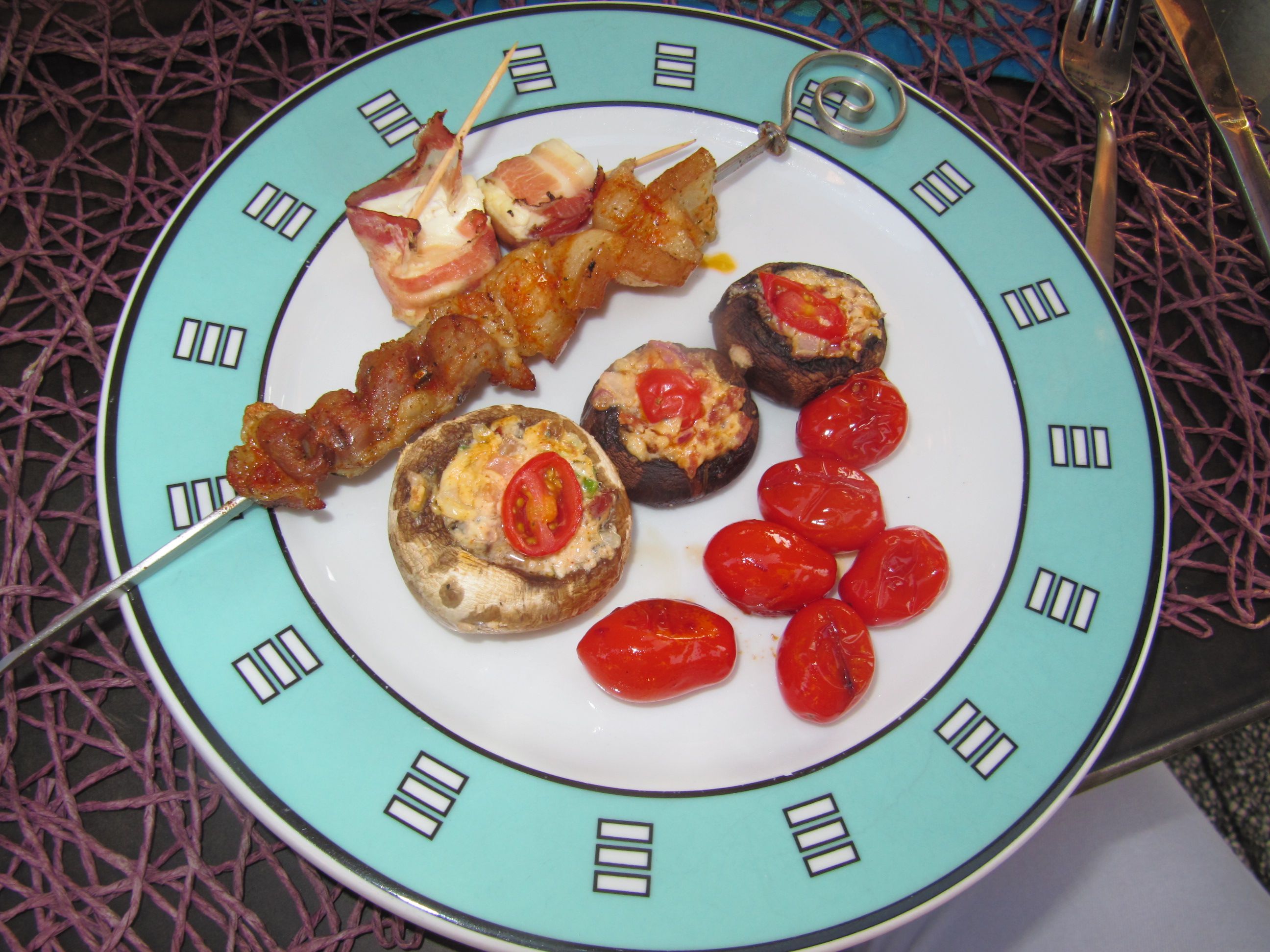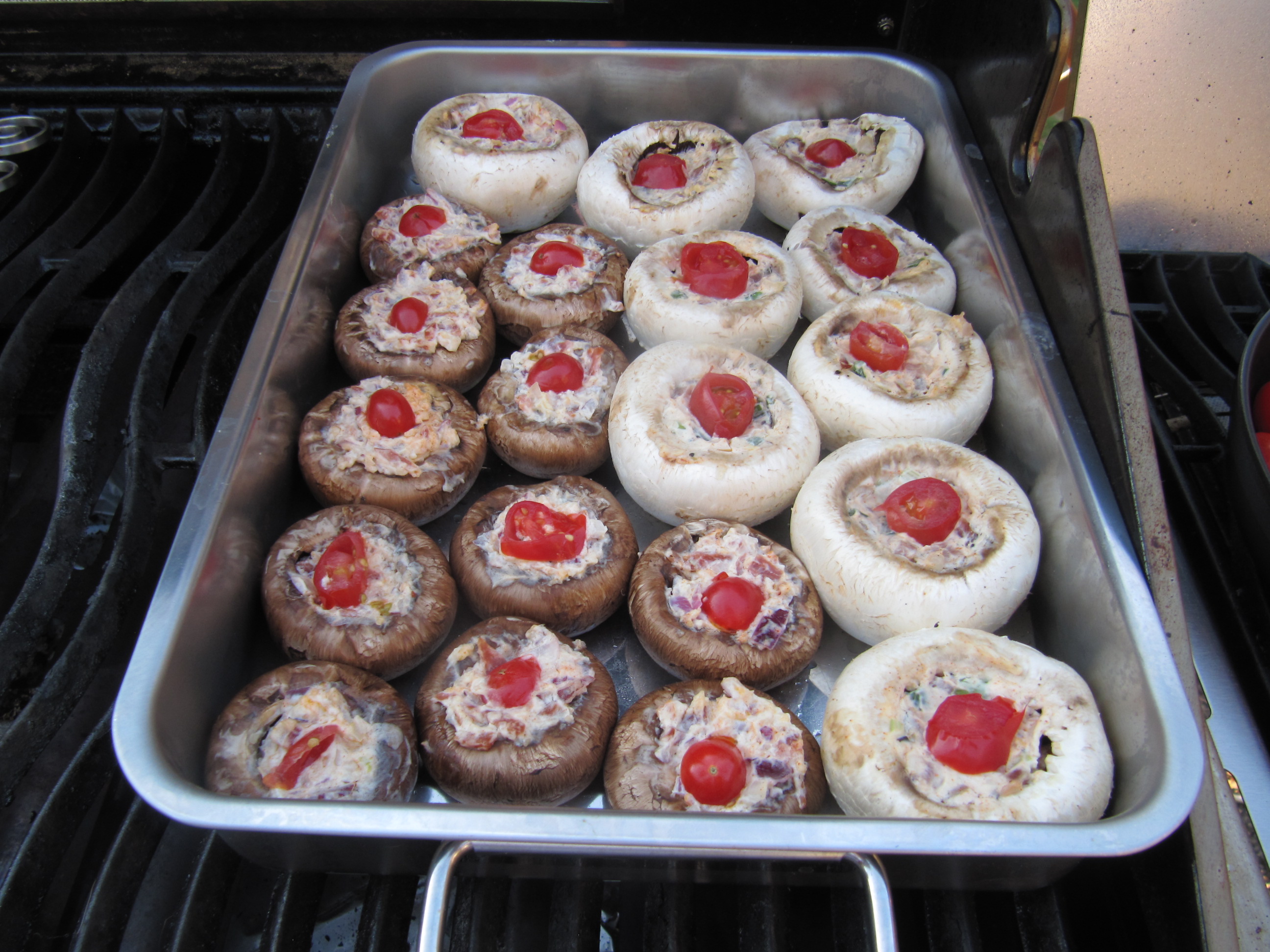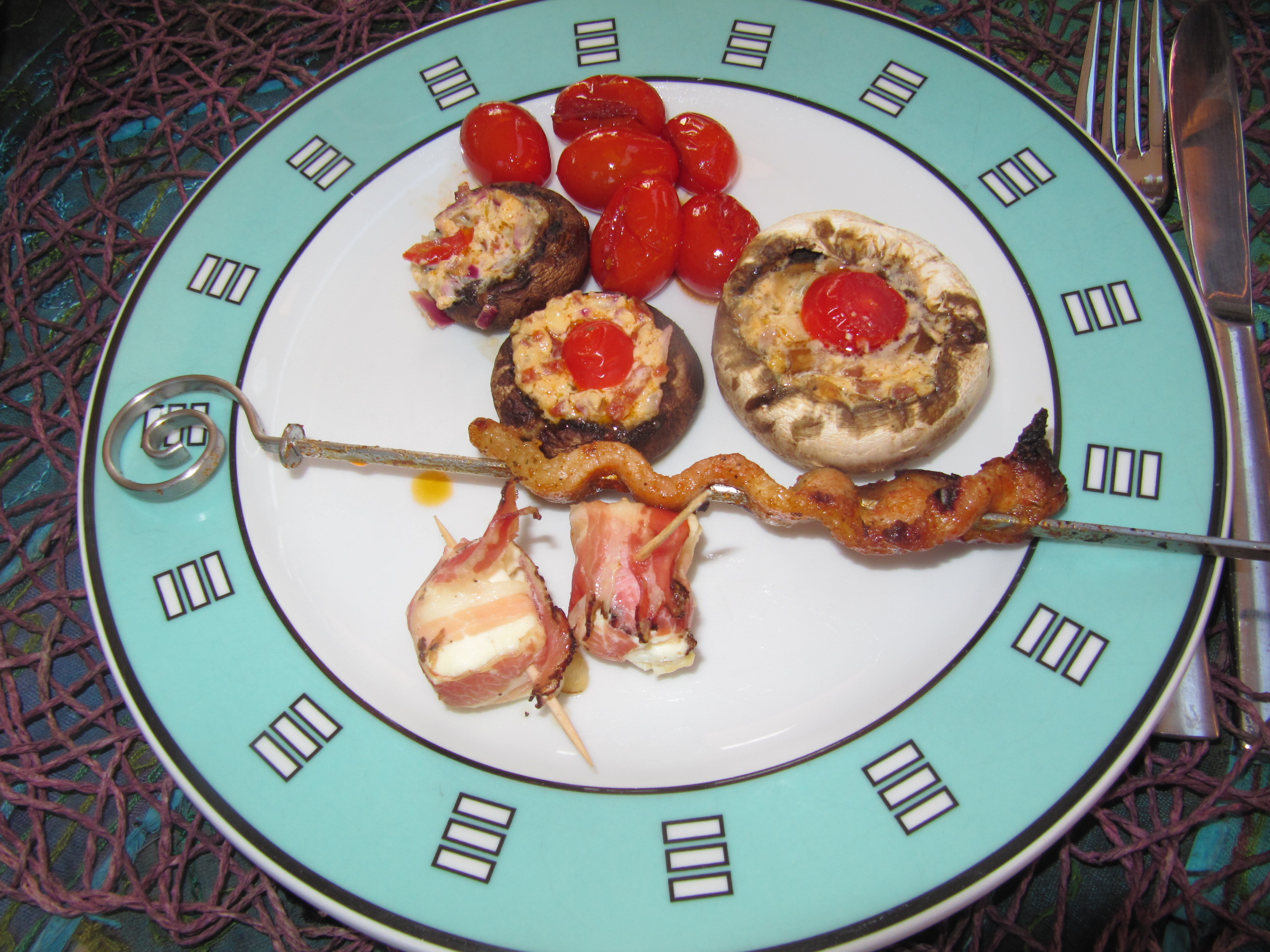 Von 10 Stk. weissen Portobello und 10 Stk. braunen Champignons, Stiele entfernen, Kopf wegen besserem Standvermögen abflachen und in eine eingeölte Pfanne stellen. Für die Füllung der Portobello-Köpfe eine Mischung aus 1/2 Pkg. Speckwürfel, 1/4 Pkg. Kräuter-Frischkäse, 1 kleingehackten Frühlingszwiebel, 1 gepressten Knoblauchzehe, 1 kleingeschnittenem Mozzarellabällchen, 1 TL geräuchertem Paprikapulver, Pfeffer, Salz und 2 TL Olivenöl anrühren und einfüllen. Für die Füllung der braunen Champignon-Köpfe 4 dünne Schnitten Chorizo kleingehackt, 1/4 Pkg. Kräuterfrischkäse, 1 kleine rote Zwiebel fein gehackt, 1 Knoblauchzehe gepresst, 1 EL Parmesankäse gerieben, 1 TL Paprikaflocken „Pul Biber“, Pfeffer, Salz und 2 TL Olivenöl anrühren und die Champignons damit füllen. Oben drauf jeweils eine geviertelte Cocktailtomate setzen. Bei indirekter mittlerer Hitze grillen bis die Champignons weich sind. Alle Vorspeisen gemeinsam servieren.