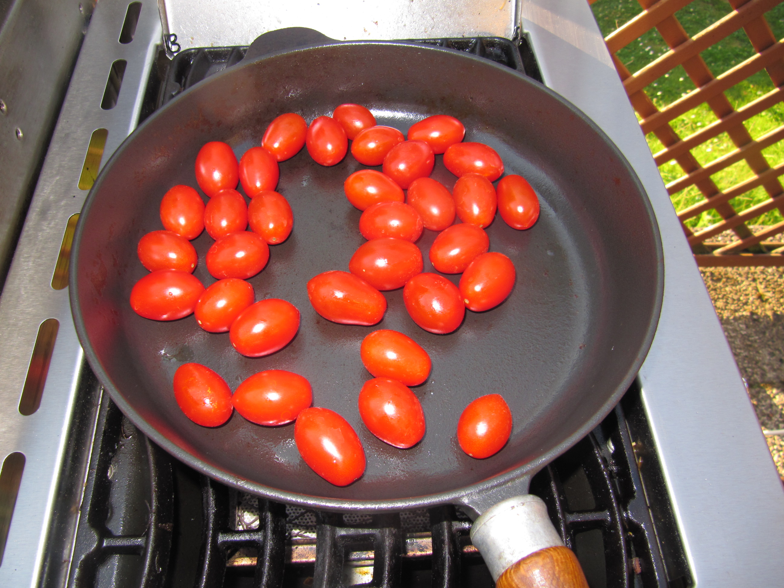 32 Stk. Cocktailtomaten mit 1 EL Olivenöl in einer Gußpfanne am Seitenkocher braten bis sie platzen und karamellisieren.