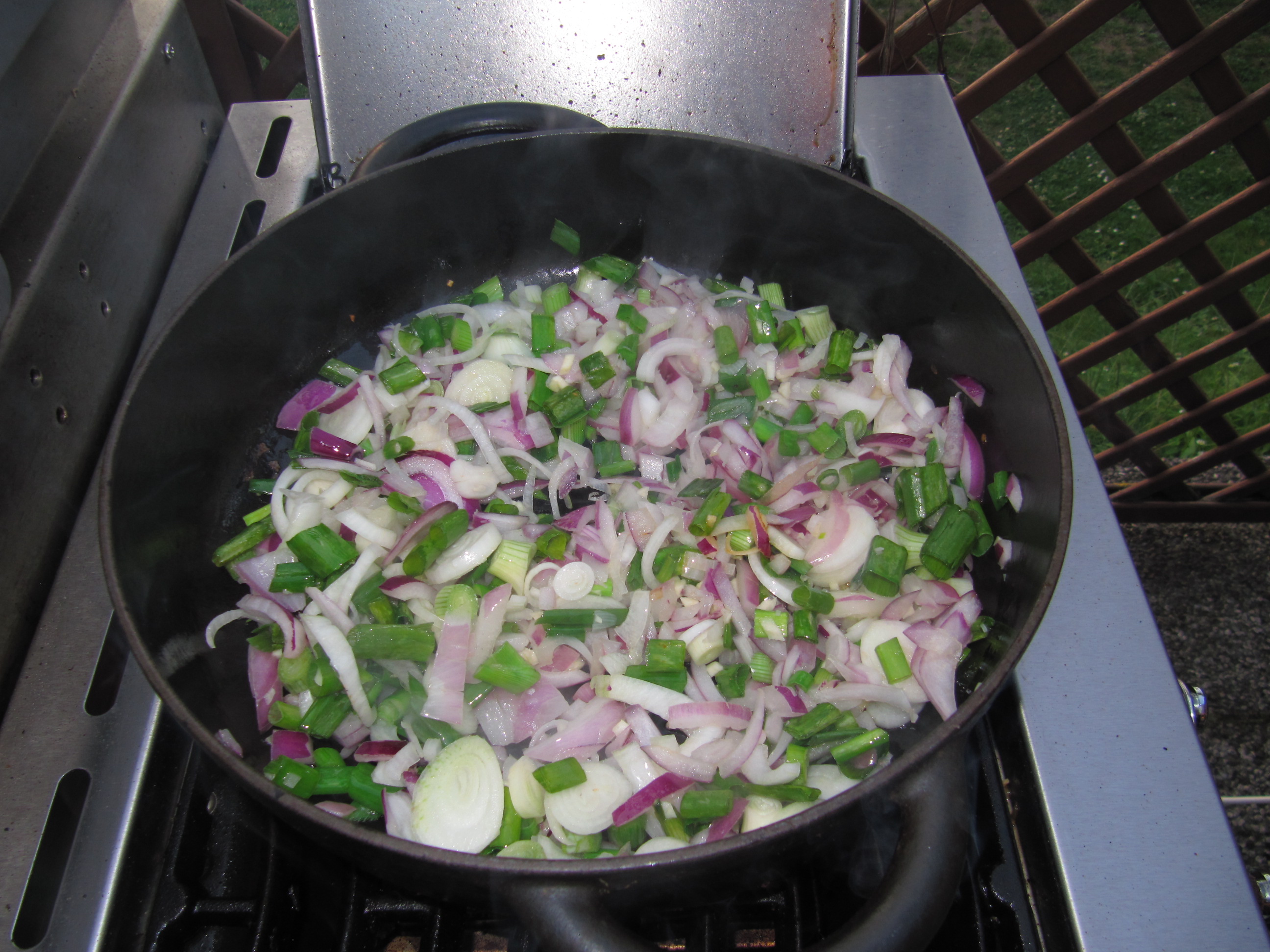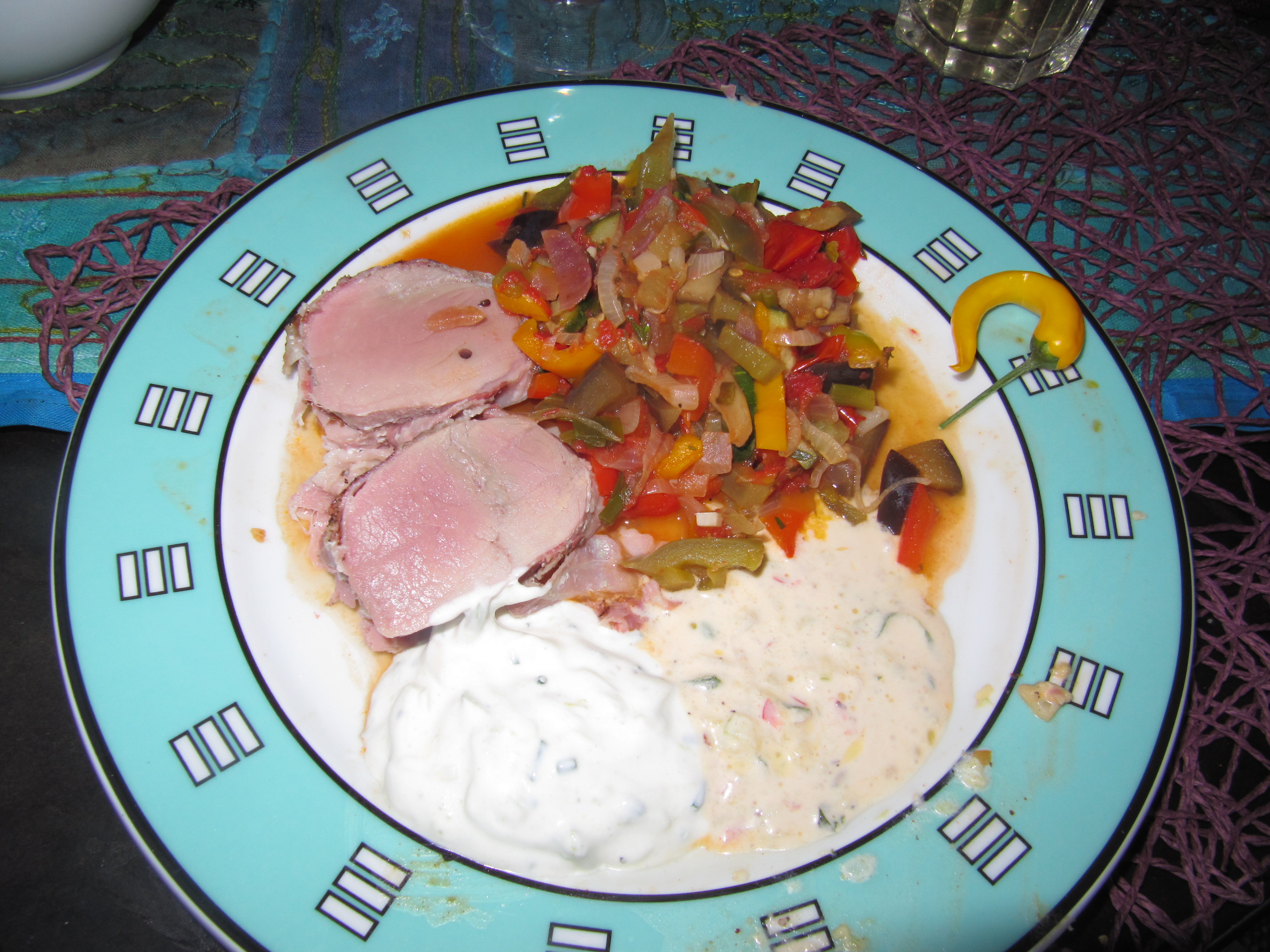 In einer Gußeisenpfanne auf dem Seitenkocher Zwiebel und Knoblauch mit 2 EL Olivenöl anschwitzen. Dann Zucchini, Melanzani, Paprika und Champignons zugeben und zum Schluß Tomaten und frische gehackte Kräuter ( Zitronenthymian, Rosmarin, Oregano ) mitziehen lassen. Mit Salz, Pfeffer, geräuchertem Paprika- und Chilipulver abschmecken. Mit dem Schweinefilet servieren. Dazu passt : Türkisches Fladenbrot, Tsatziki und andere Saucen.