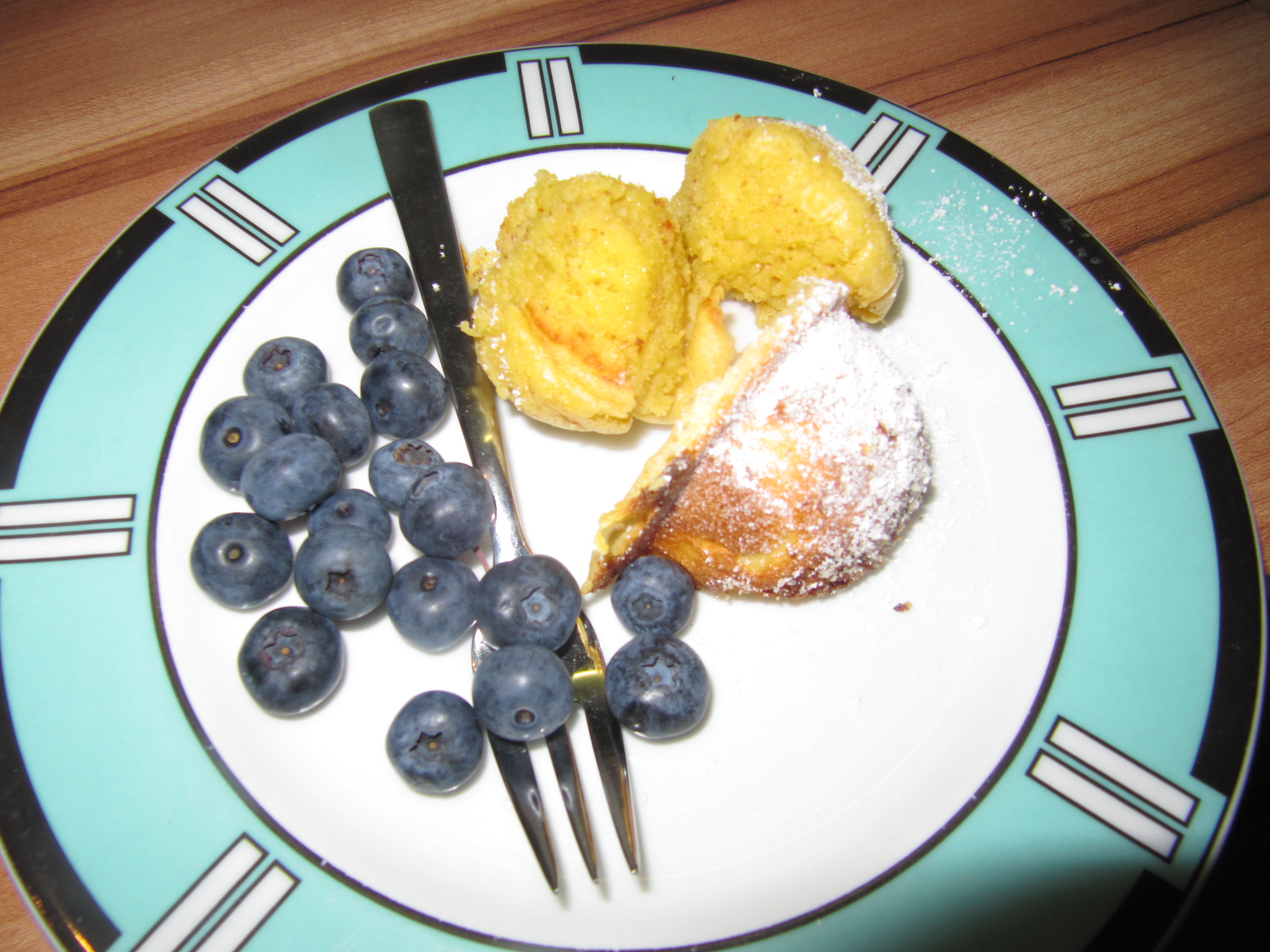 In einer Schüssel Mehl, Zucker und Backpulver vermischen. In einer zweiten Schüssel Milch, 6 Eigelb, 10 dag Rapsöl oder 100 g geschmolzene Butter verquirlen und das Mehlgemisch zugeben. Eiweiß steif schlagen und vorsichtig unter die Masse heben.