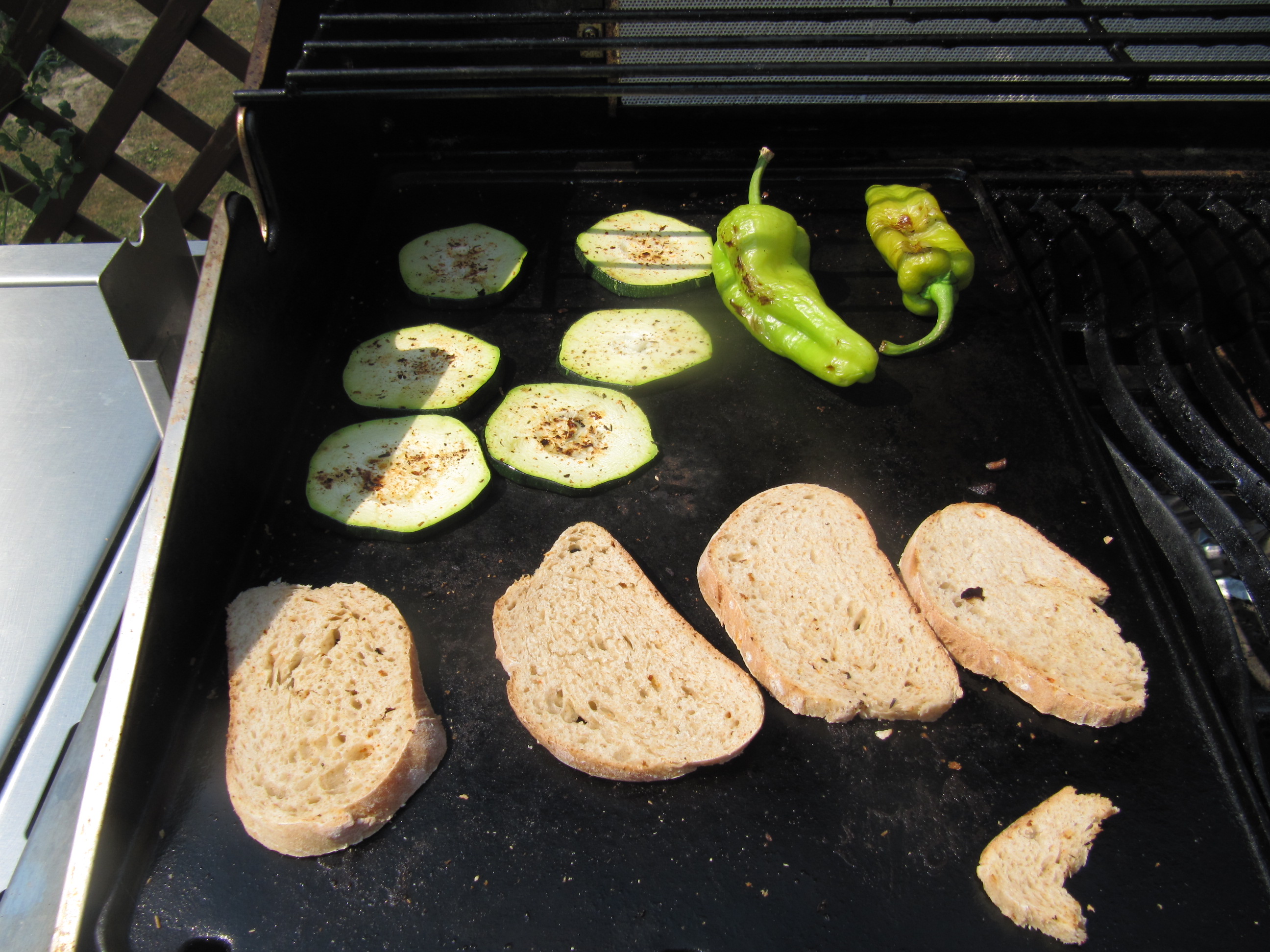 Zutaten und Zubereitung Zucchinischeiben, Pimentos und geröstetes Brot :