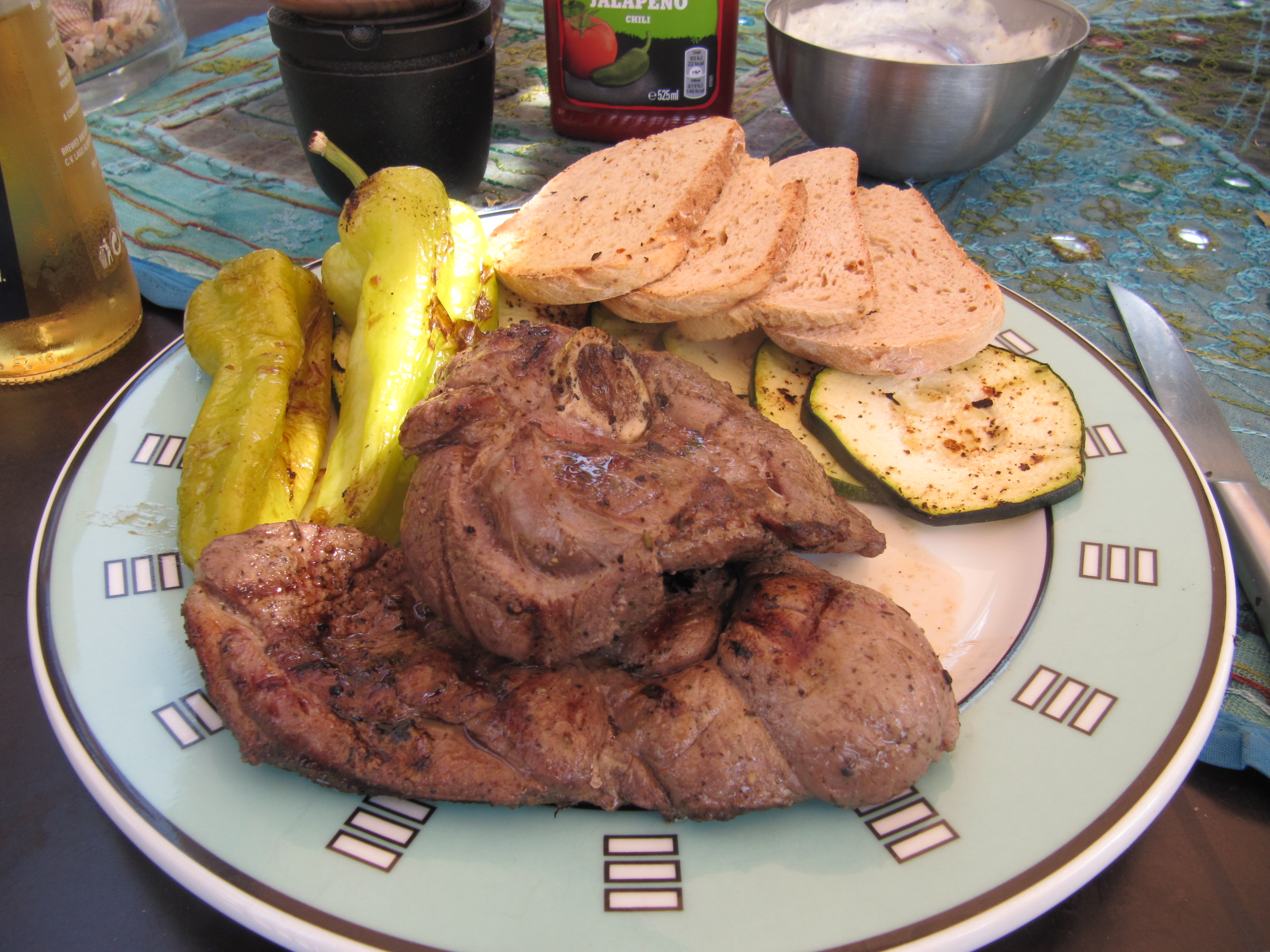 6 Zucchinischeiben mit 1 TL Adis Kräutergewürz beidseitig bestreuen, salzen und mit Olivenöl einstreichen. 2 Stk. Pimentos mit Olivenöl einstreichen. 4 Scheiben Weißbrot mit Kräuterbutter dünn einstreichen. Alles auf der Gußplatte bei mittlerer direkter Hitze, unter einmaligem Wenden, grillen bis Zucchinischeiben weich, Pimentos gebräunt und Weißbrot knusprig ist. Mit Lammkeulensteaks servieren.