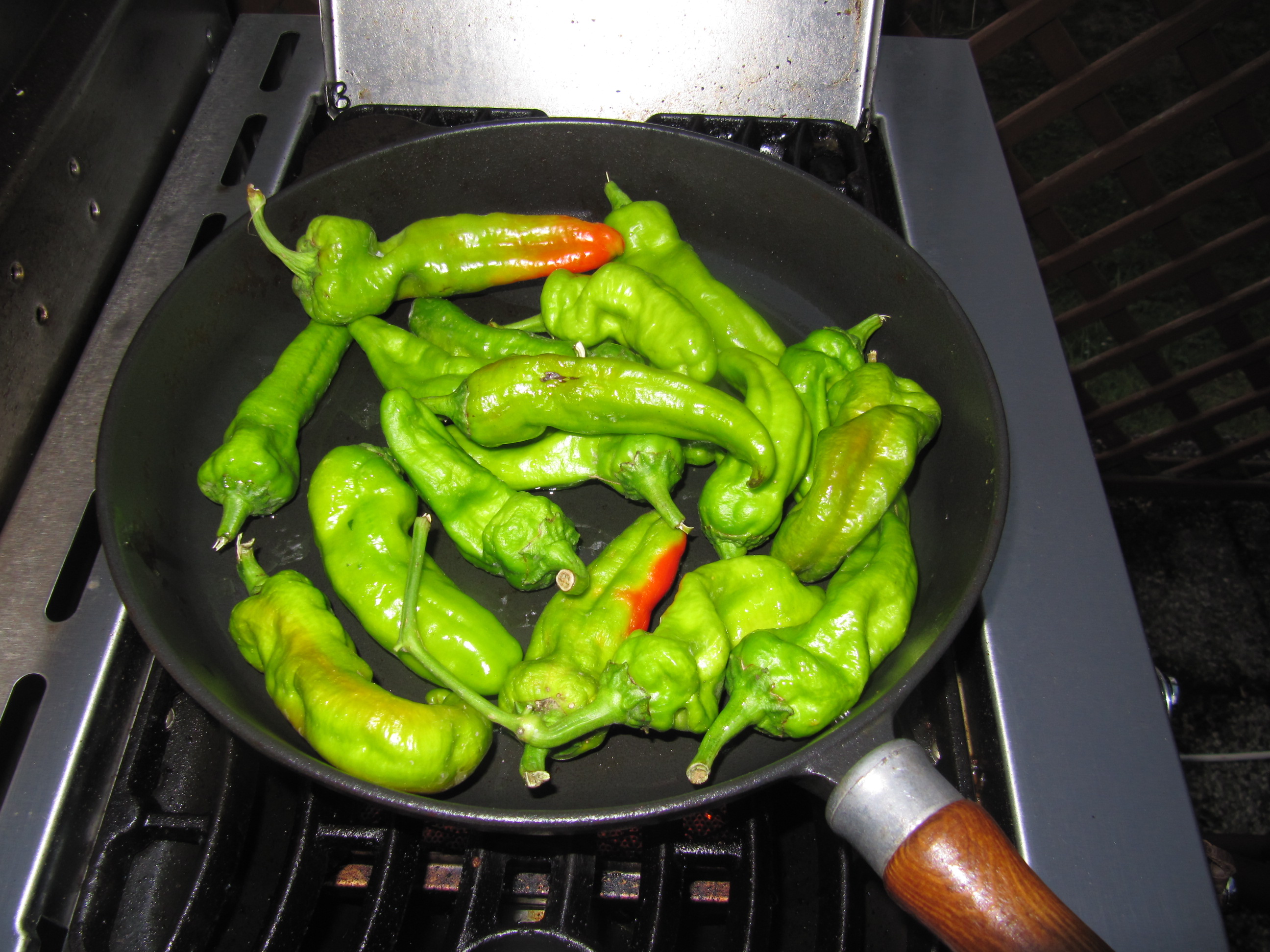 1 Pkg. Pimentos mit 1 EL Olivenöl bei starker Hitze, in einer Gußeisenpfanne am Seitenkocher, braten bis sie gebräunt sind.