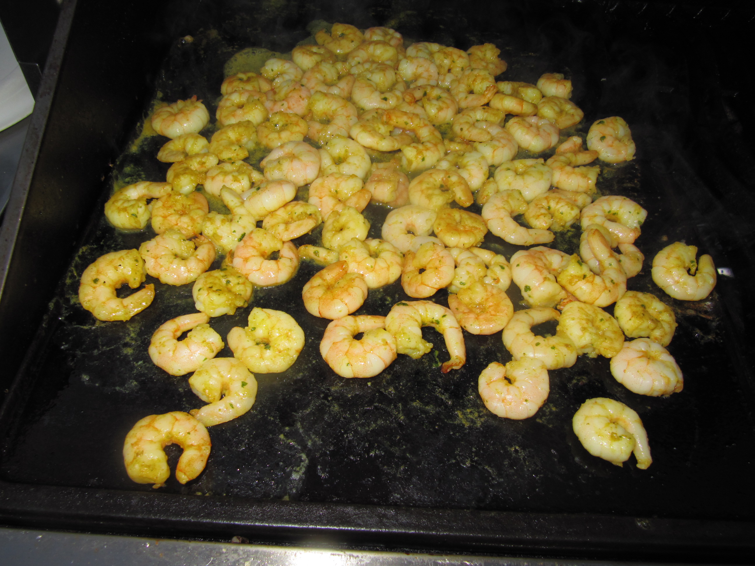 3 Pkg. Riesengarnelen je 250 g, mit Thai-Curry Marinade, auftauen und auf der Gußplatte bei direkter starker Hitze scharf angrillen, Temperatur auf mittlere Hitze reduzieren und weitergrillen bis Flüssigkeit verdampft ist.
