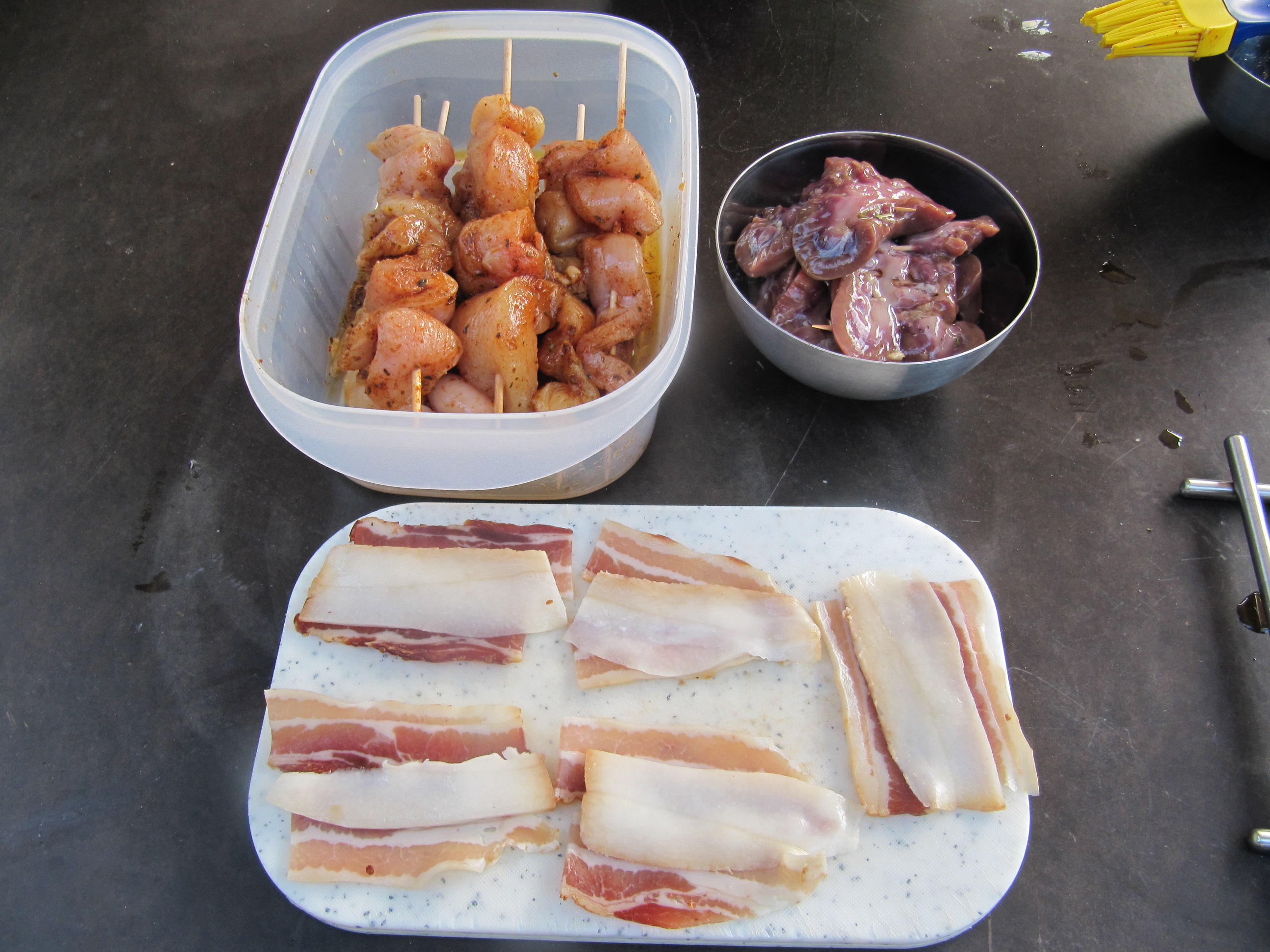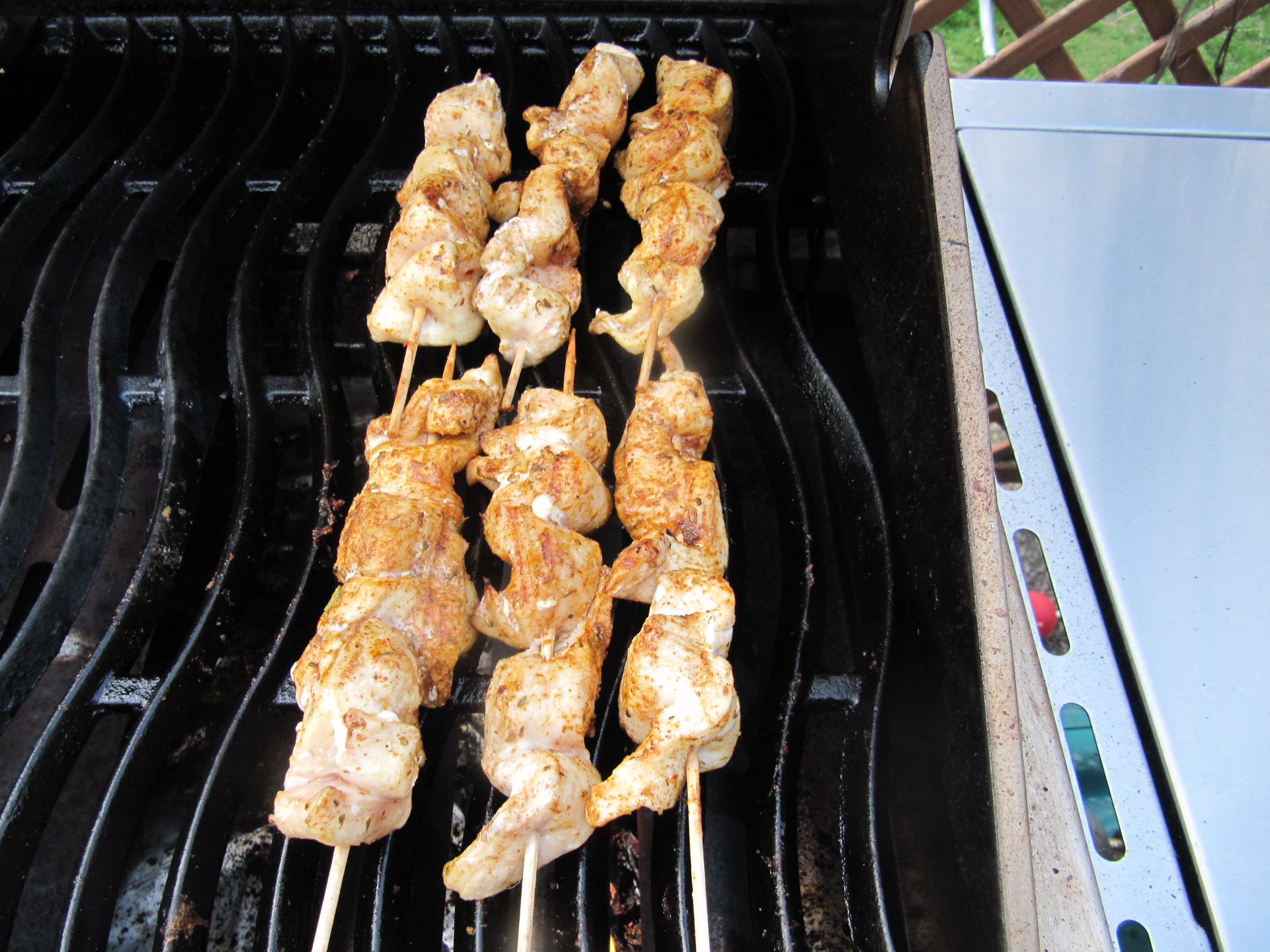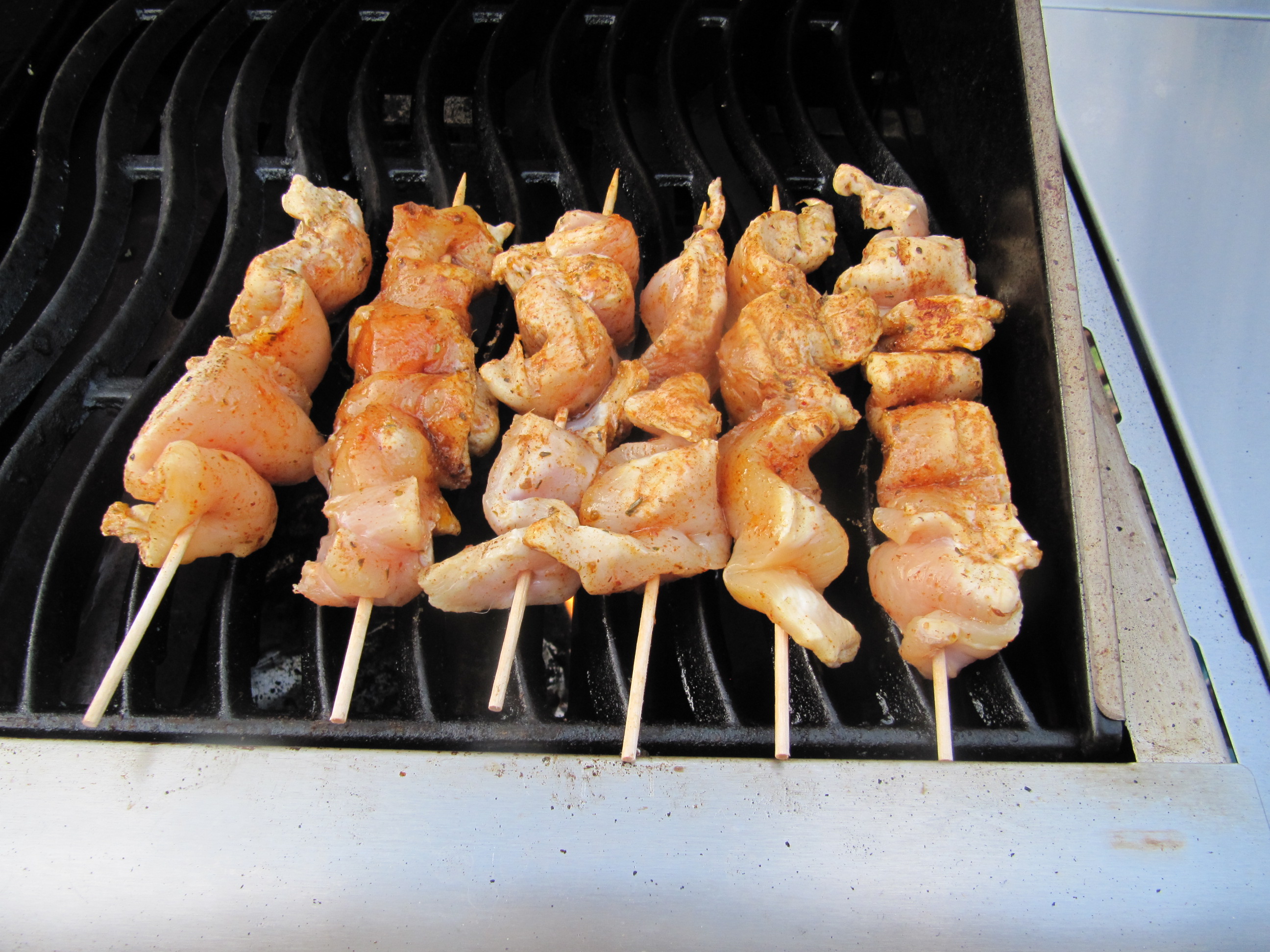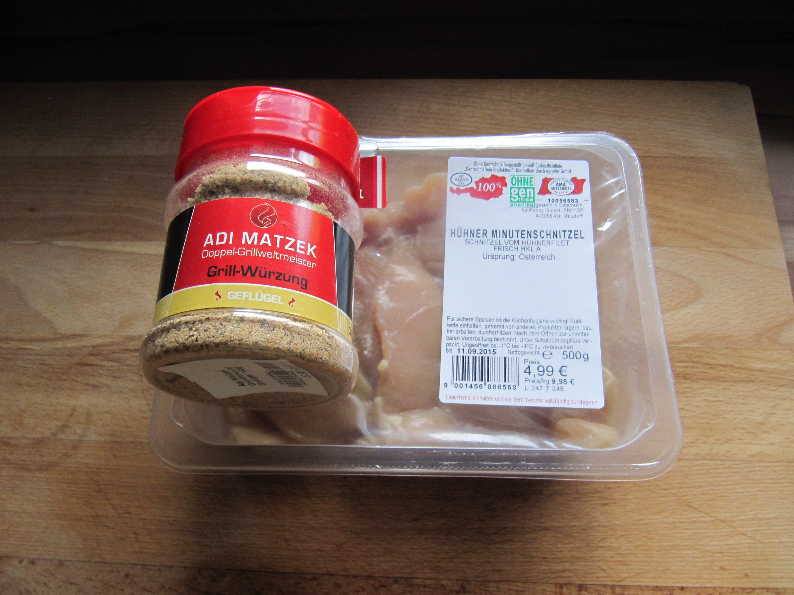 500 g Hühner-Minutenschnitzel in Streifen geschnitten, auf 6 gewässerte Holz-Schaschlikspiesse stecken, mit 6 TL Adi´s Geflügelgewürz würzen und mit dem Marinadeöl der Lammnieren bestreichen. 20 Min. im Kühlschrank marinieren, rausnehmen, Zimmertemperatur annehmen lassen, bei direkter starker Hitze auf dem Grillrost unter mehrmaligem Wenden 6 Min. grillen.