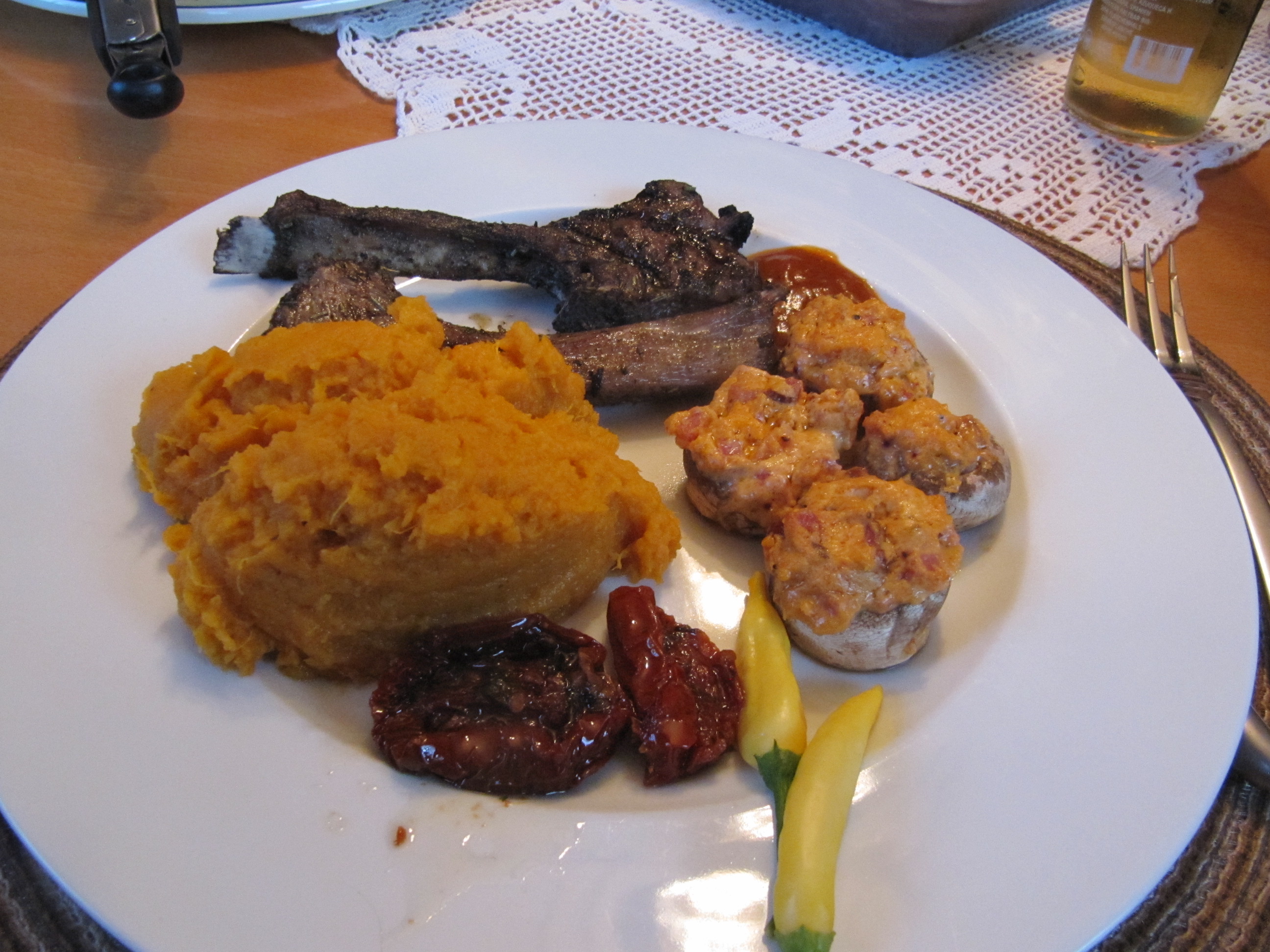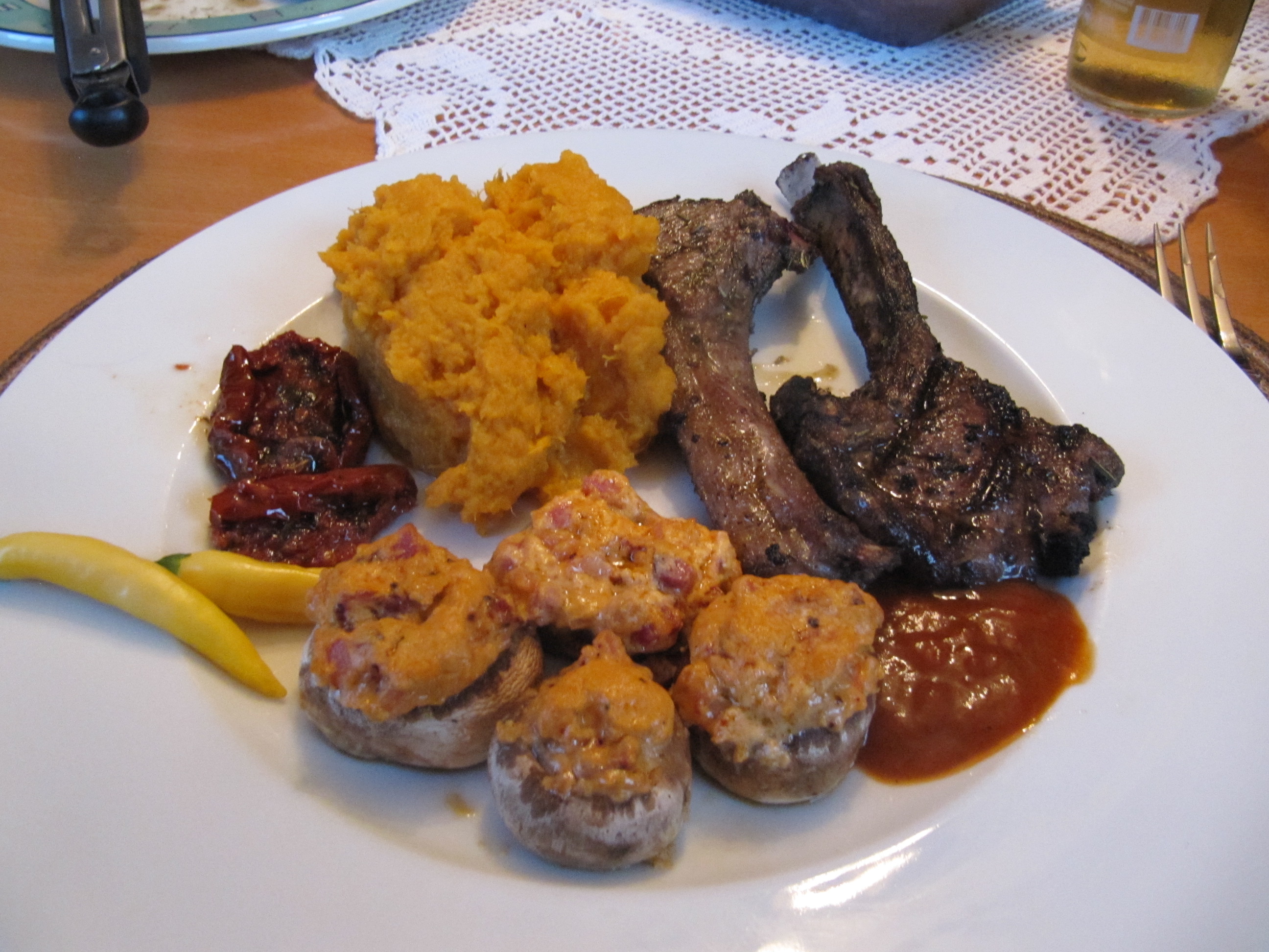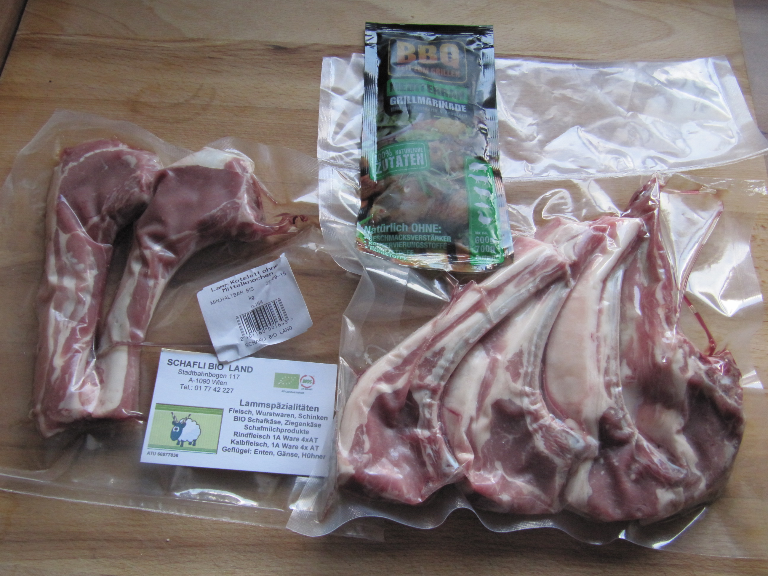 es ist warm, die Sonne scheint, grillen ist Pflicht ! Heute gibt´s Lammkotelett in hervorragender Qualität von „Schafli Bio Land“, Stadtbahnbogen 117, 1090 Wien. Als Beilage waren noch ein Paar Süßkartoffel und eine Packung Champignons da. Perfekt für ein ausgezeichnetes Grillmenü !
