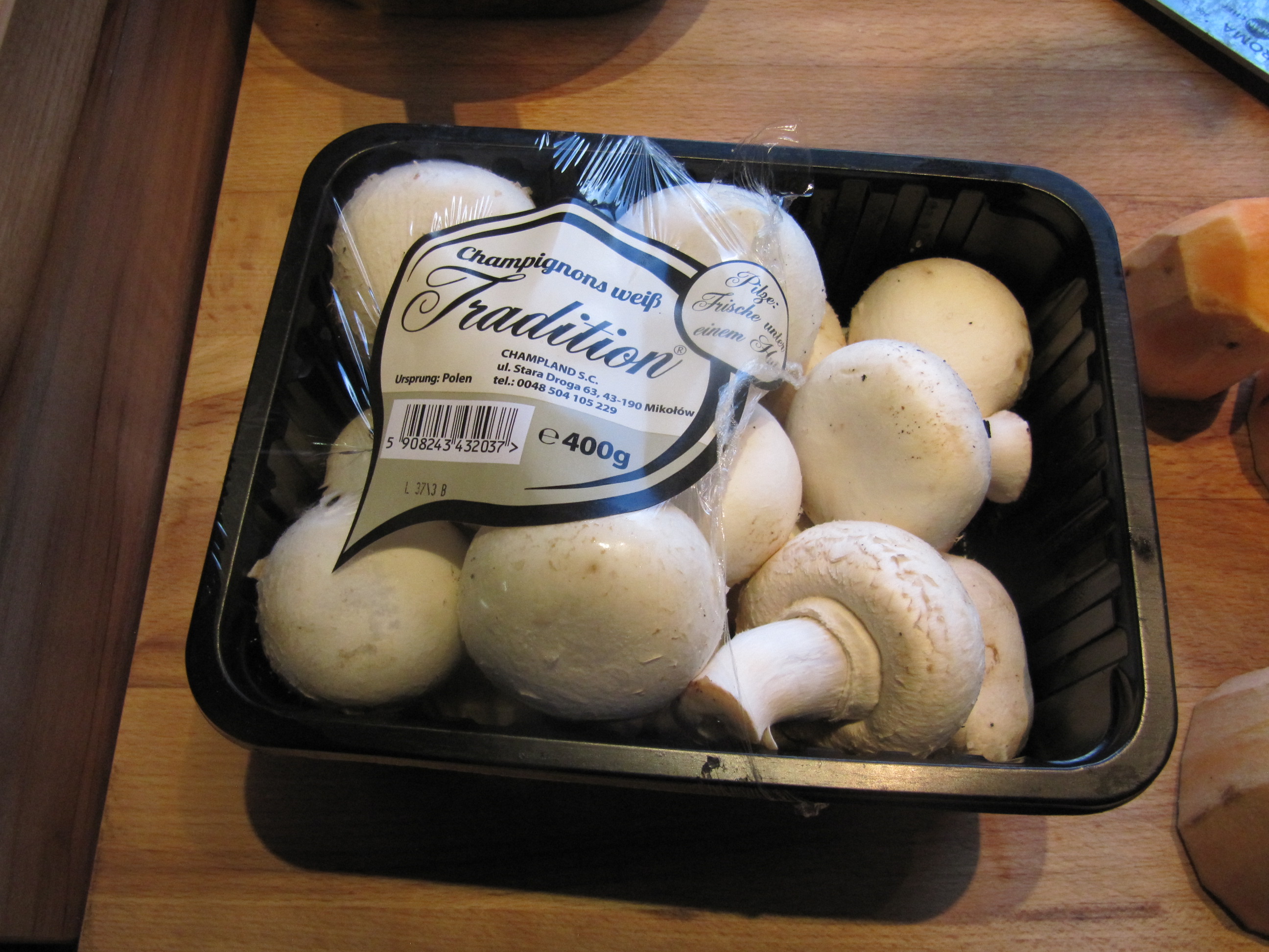 1 Pkg. Champignons, Stiele entfernen und Hut wegen Standvermögen flach anschneiden, in eine, mit 4 TL Rapsöl eingefettete, Pfanne stellen.