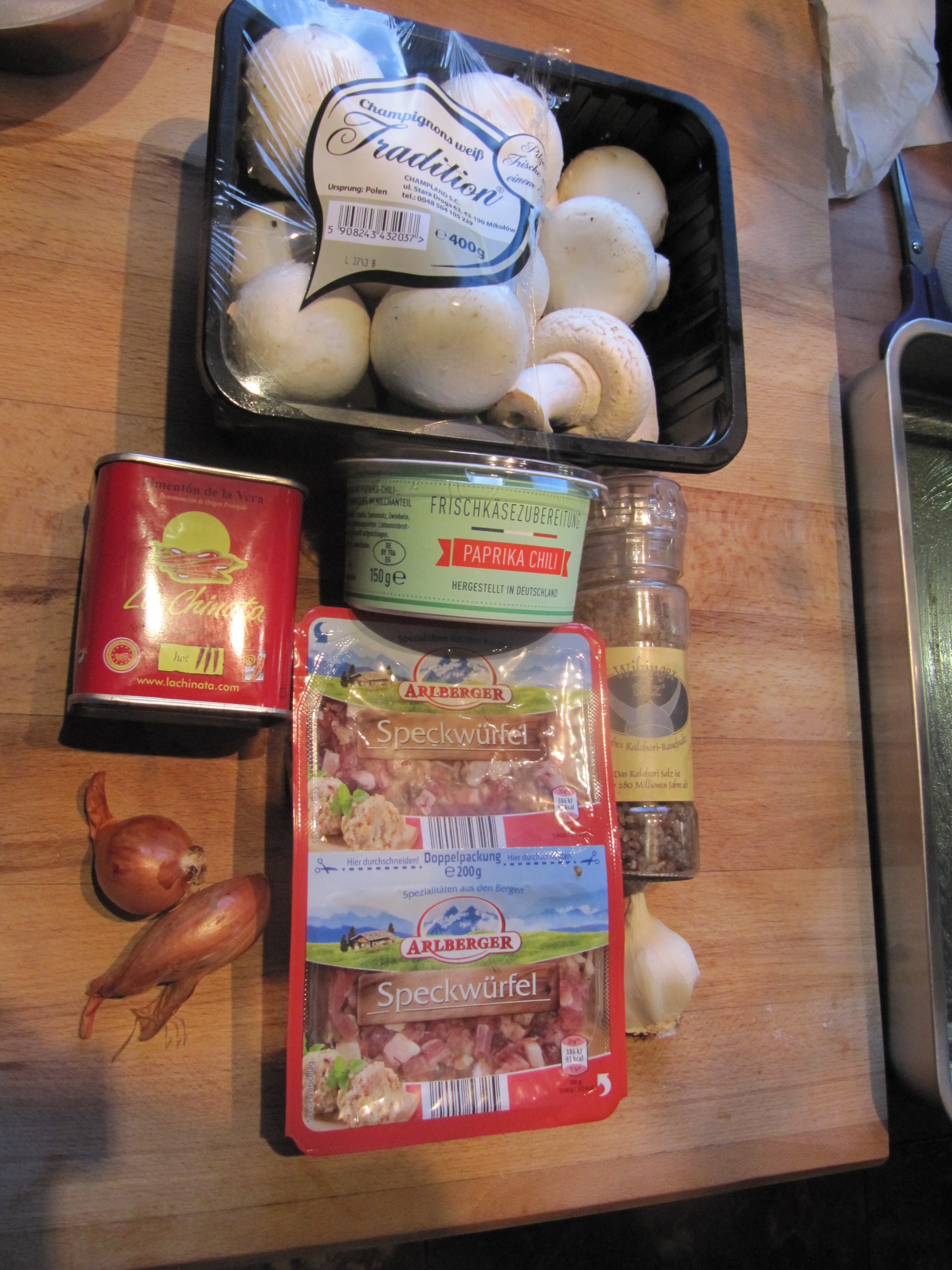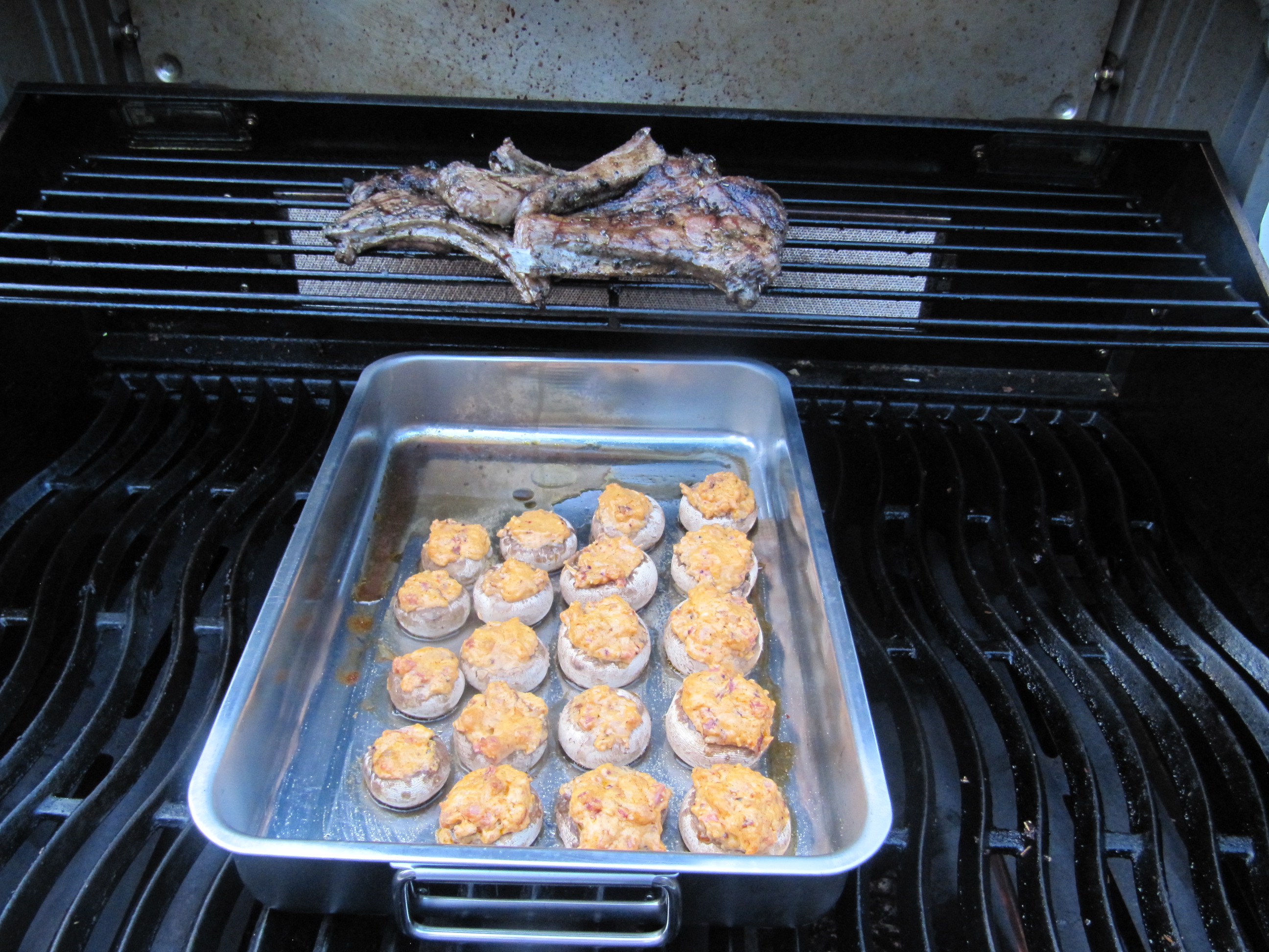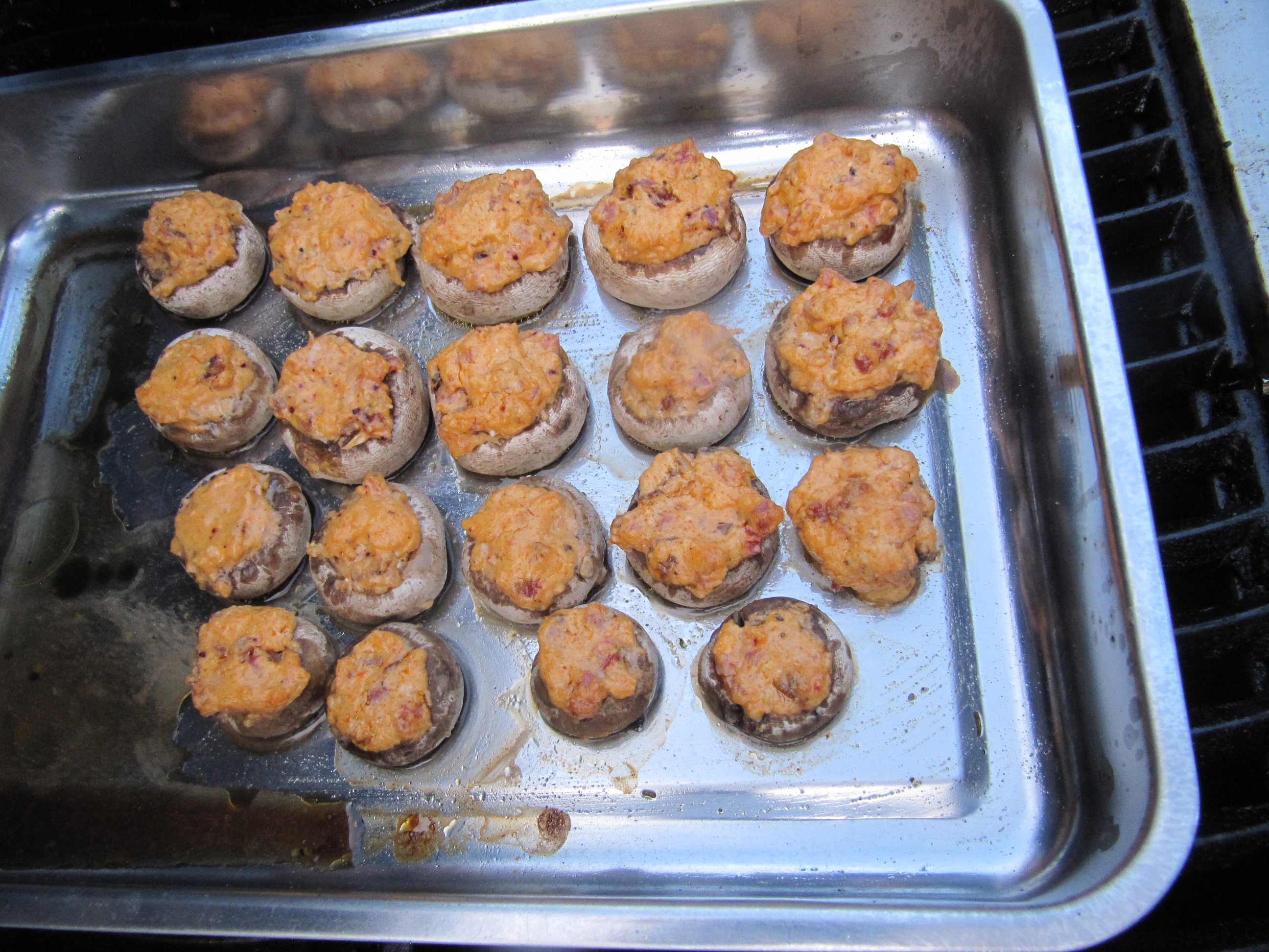 Füllung : 75 g Paprika Chili Frischkäse, 2 Schalotten fein gehackt, 3 Knoblauchzehen gepresst, 50 g Speckwürfel, 2 EL Parmesankäse gerieben, 2 EL Chiliöl ( wer´s nicht so scharf mag sollte Olivenöl verwenden ! ), 2 TL geräuchertes Paprikapulver, geräuchertes Kalaharisalz und tasmanischer Bergpfeffer frisch gemahlen, 1 Msp. „End of Sanity“ Sauce von Fireland Food, vermischen und die Pilzhüte damit füllen. Die Pilze bei mittlerer indirekter Hitze braten bis Pilzhüte weich sind.