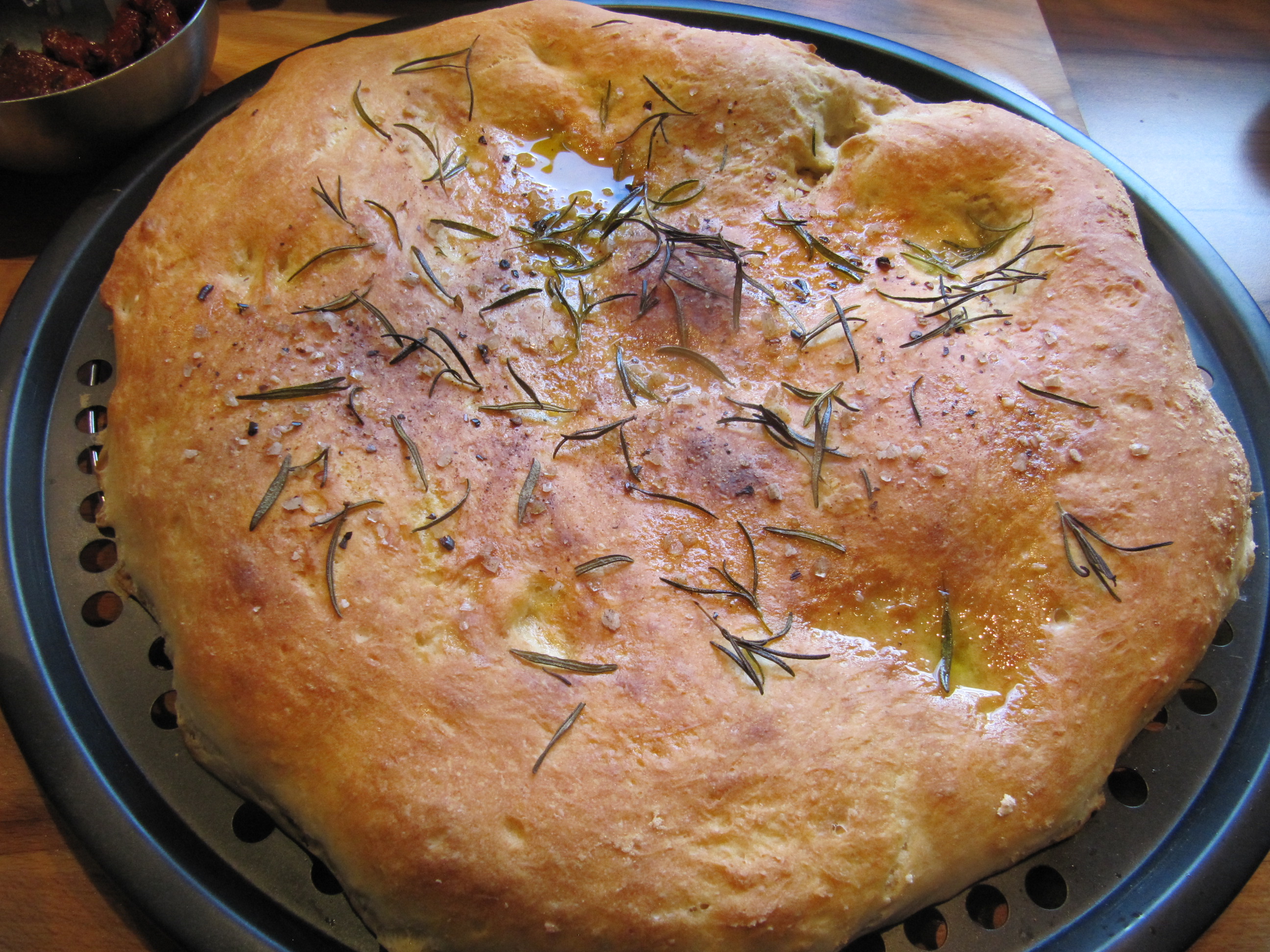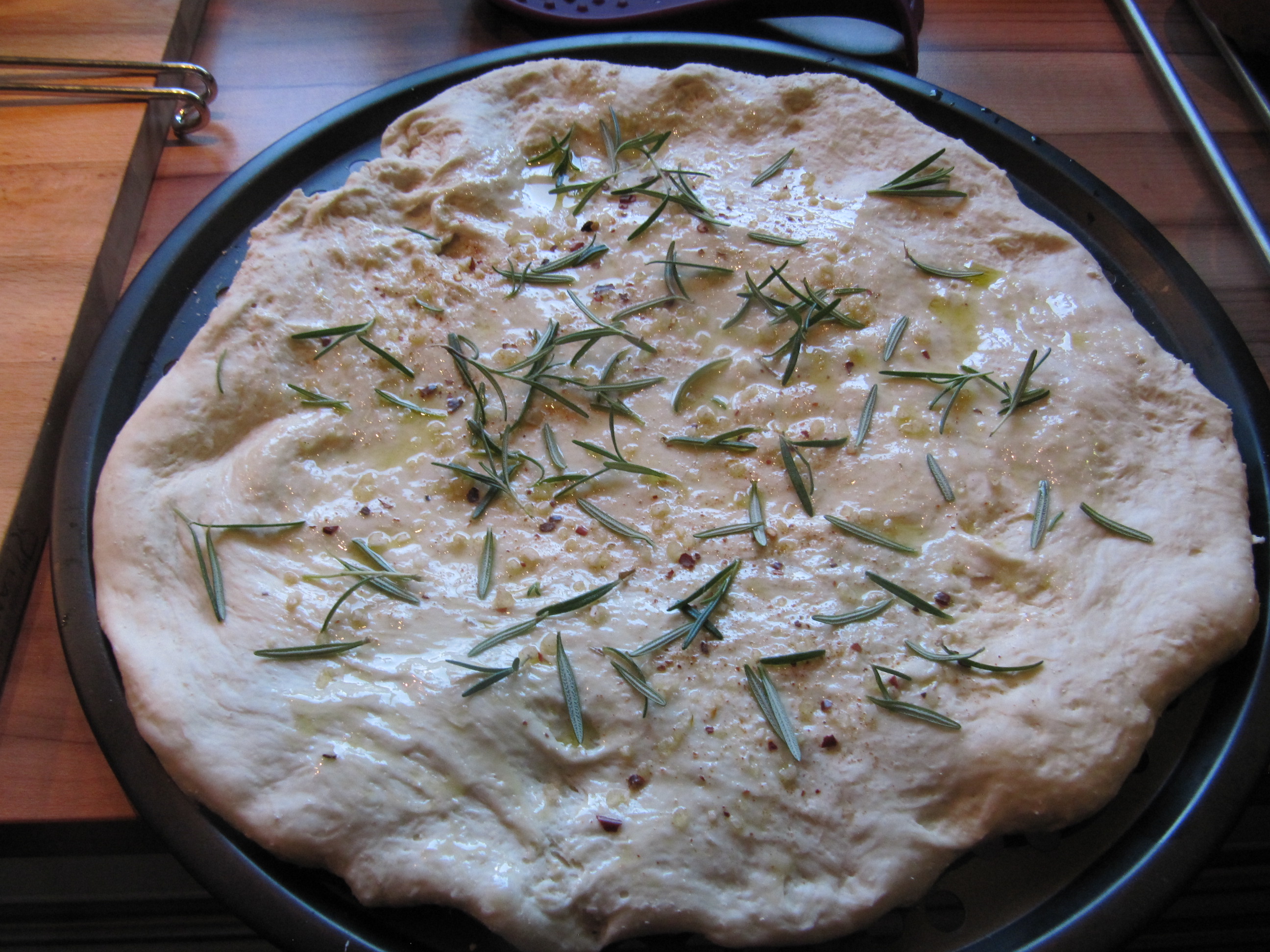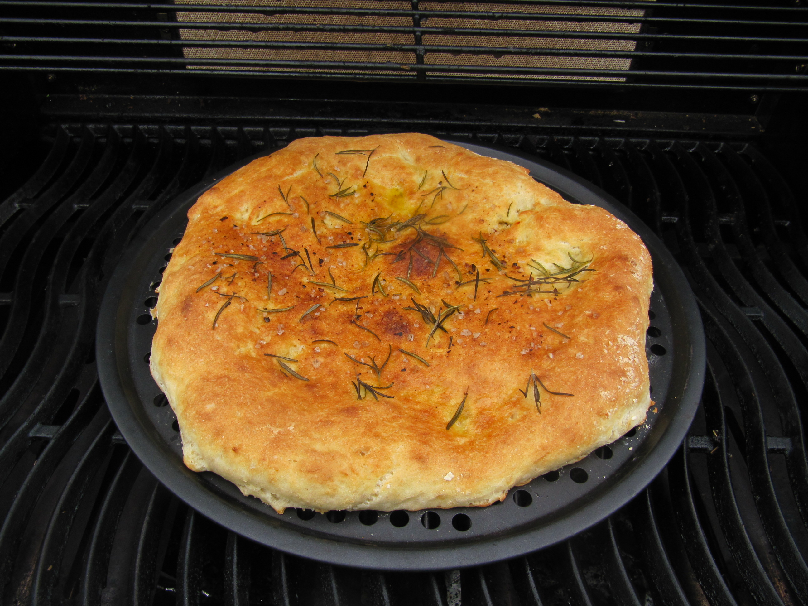 Zutaten zusammenmischen, kneten, 1 Std. an warmen Ort gehen lassen, danach wieder kneten und nochmals 1/2 Std. gehen lassen. zu einem Fladen ausrollen, auf gelochte Pizzaplatte oder Pizzastein geben, mit Olivenöl bestreichen, Rosmarinnadeln und grobem Meersalz bestreuen und bei 300° C indirekter Hitze 12 Minuten backen. Nach Abkühlen servieren.
