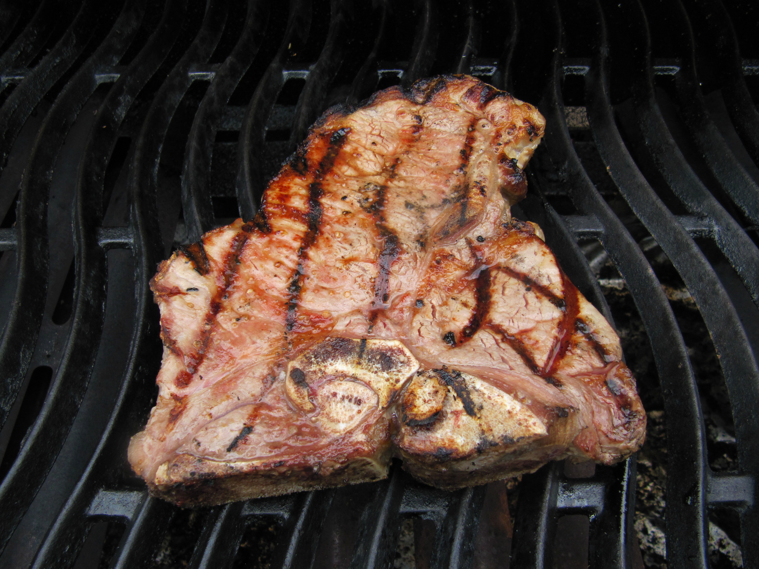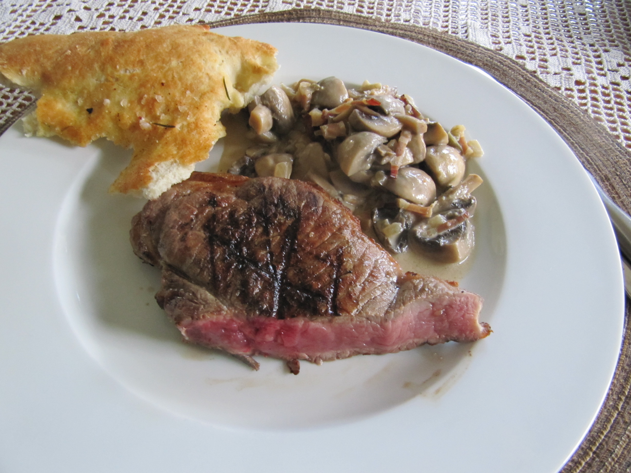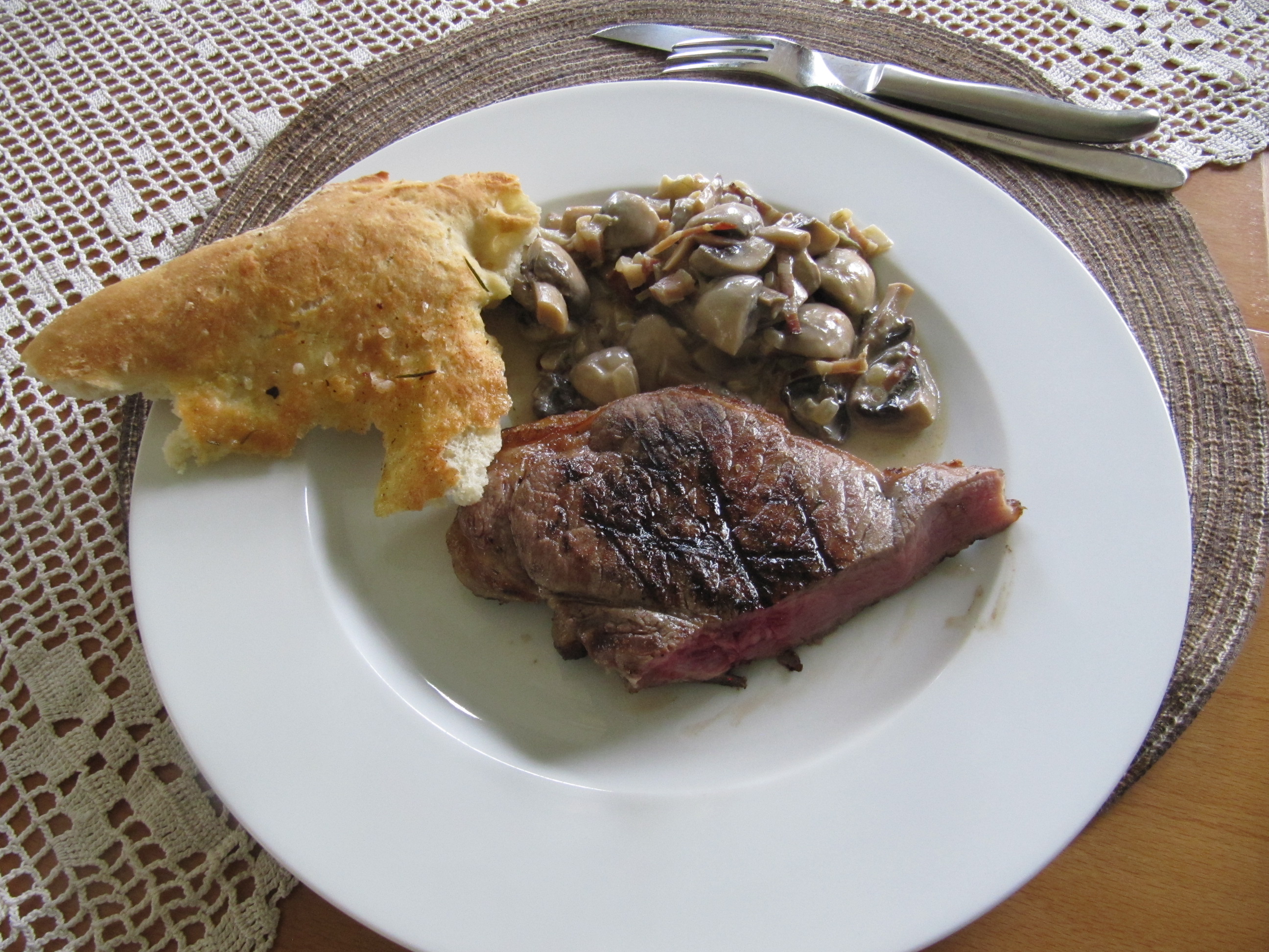 heute gibt´s schnelle Küche : Ein T-Bonesteak ( auf Grund der Größe ausreichend für meine Gattin und mich ) mit Champignonsauce und selbstgebackenem Fladenbrot mit Rosmarin .