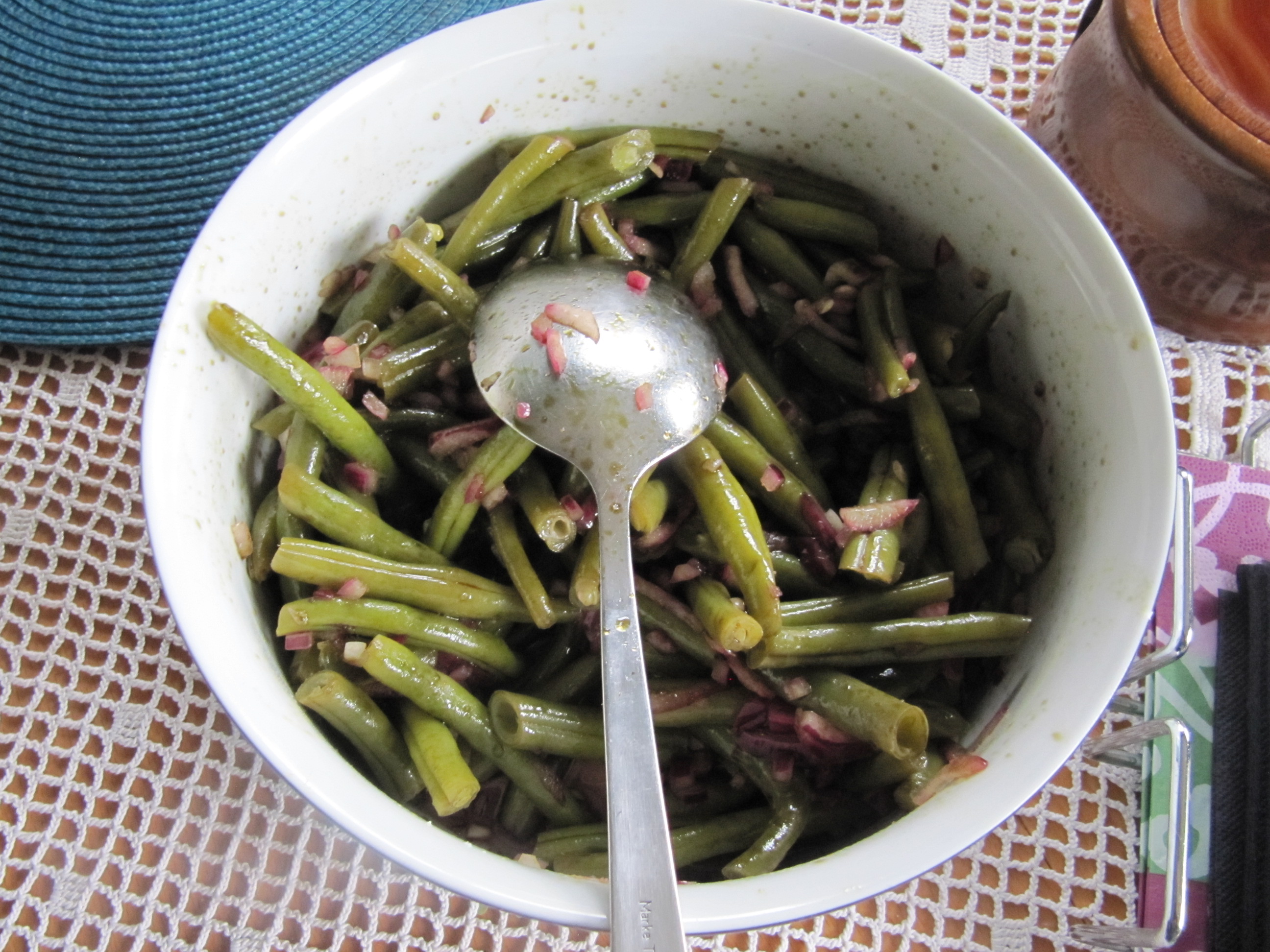400 g Fisolen putzen und im Dampfgarer mit dem Programm : „Grüne Bohnen“ weichgaren. Mit einer gehackten roten Zwiebel, Essig, Öl, frisch gemahlenem Salz und Pfeffer vermischen. Als Salatbeilage zum Fisch servieren.