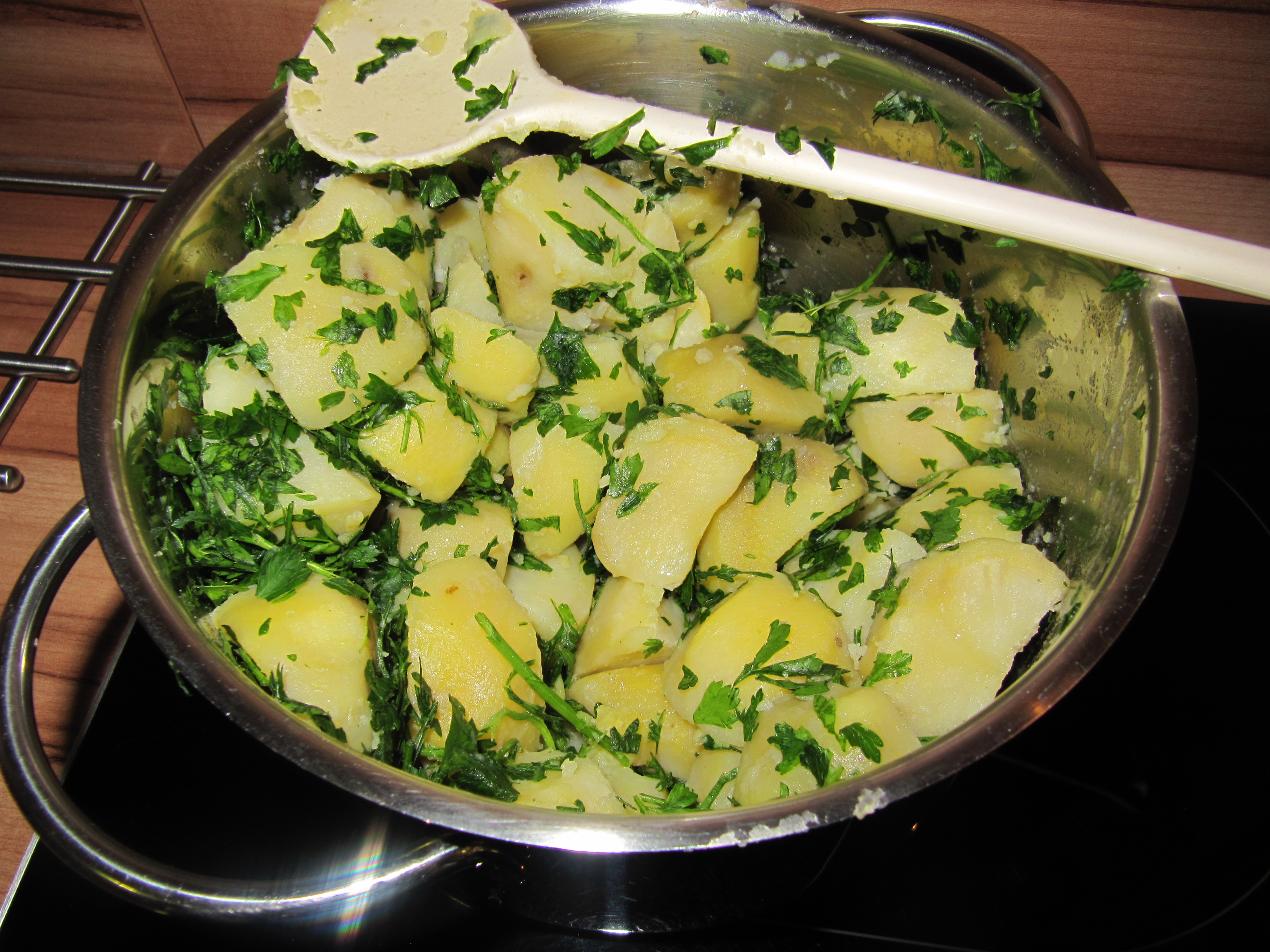 1 kg festkochende Kartoffeln kochen, bis sie weich sind, schälen und in Stücke scnneiden. Mit 1 EL Butter braten, salzen und mit 1 Bund gehackter Petersilie bestreuen. Als Beilage zum Fisch reichen.
