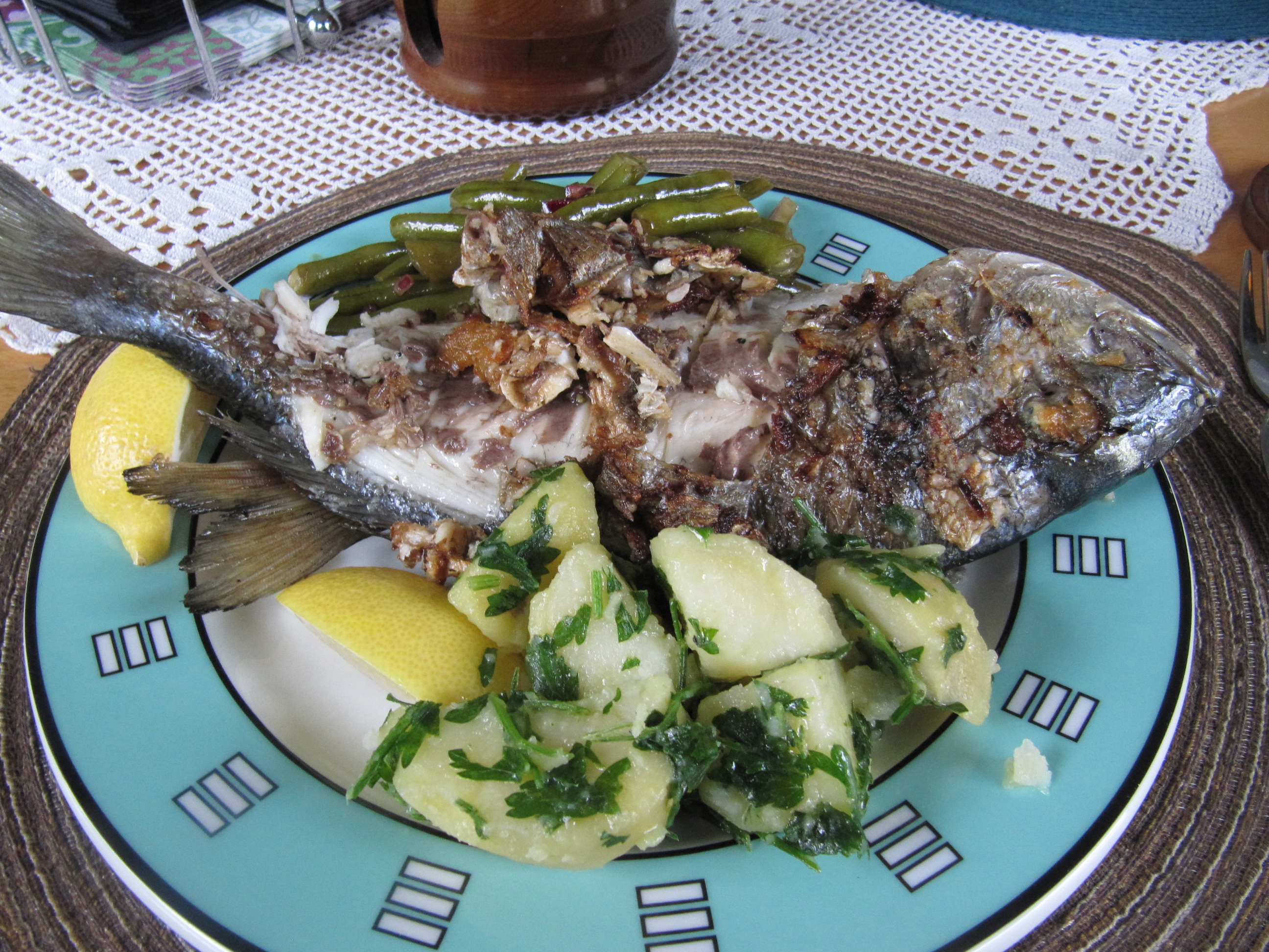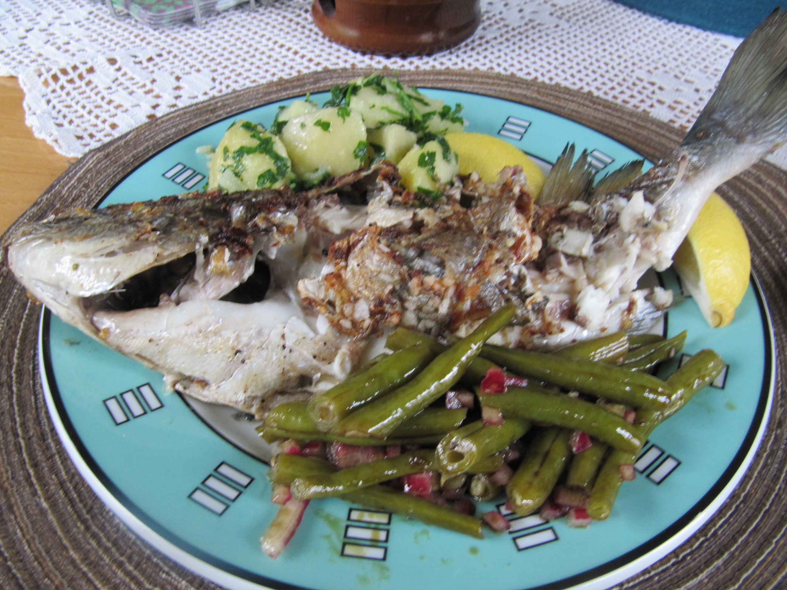 Rezept Nr. 56 : Meine Goldbrasse mit Petersilkartoffeln und Fisolensalat.