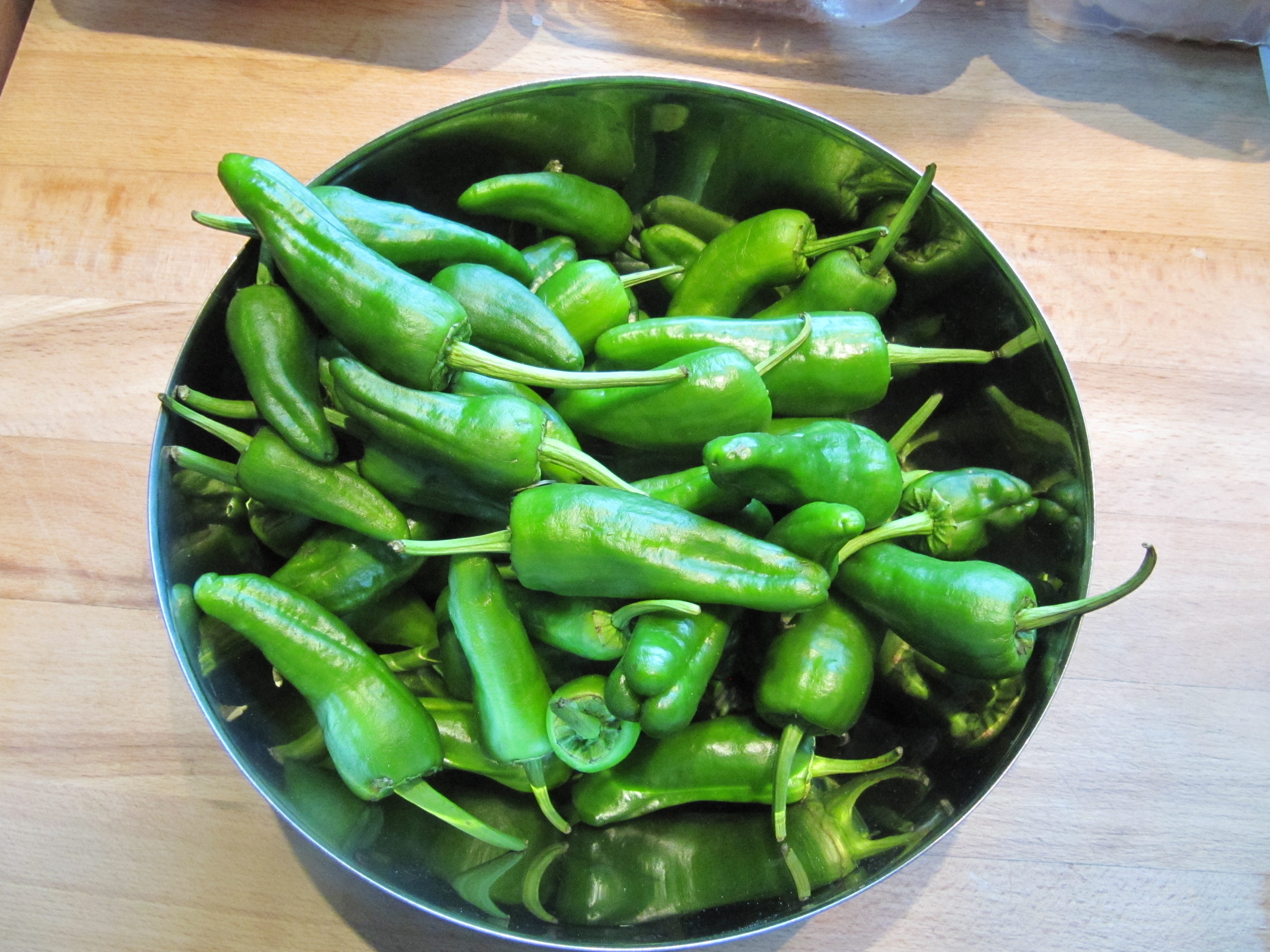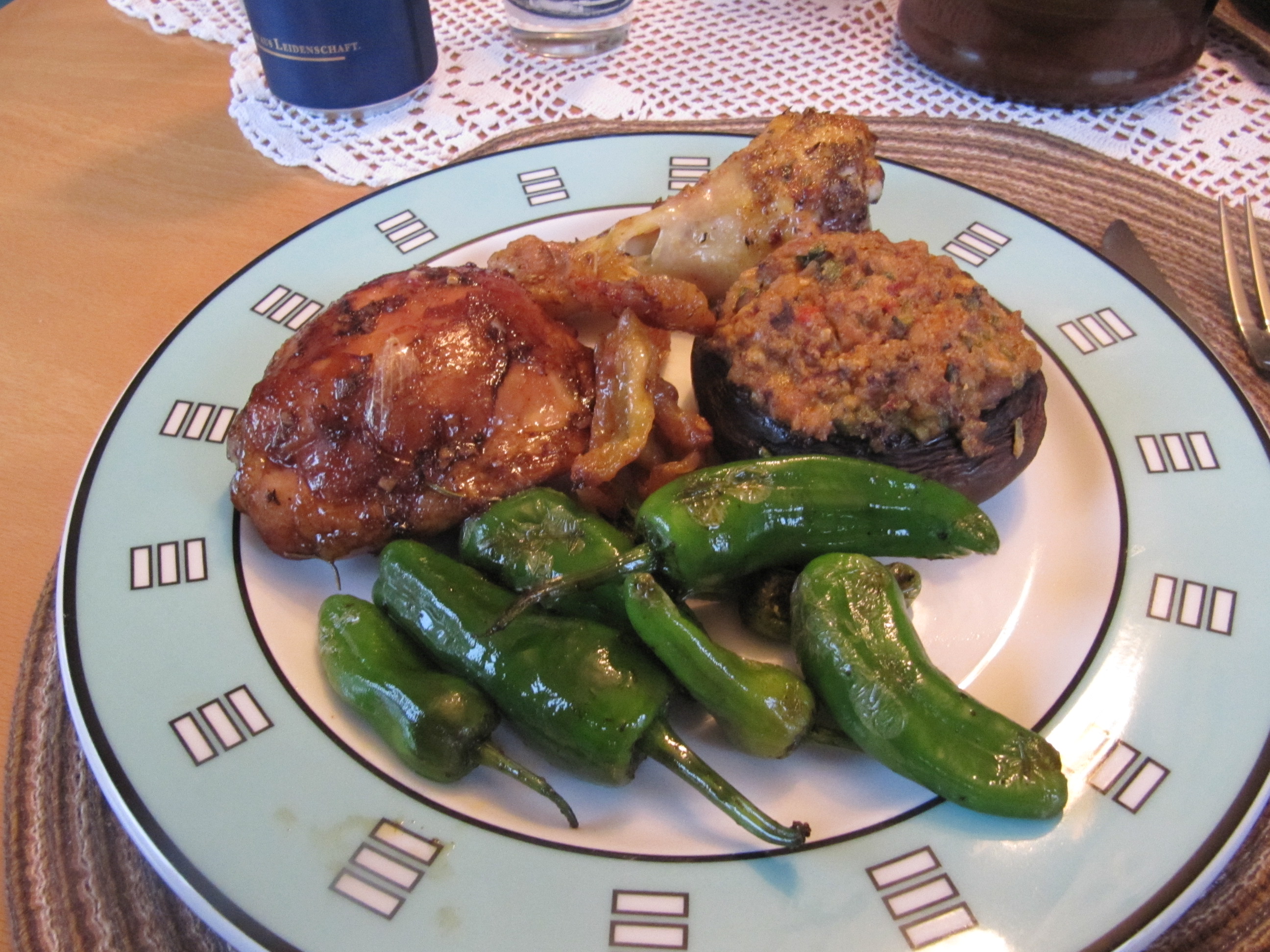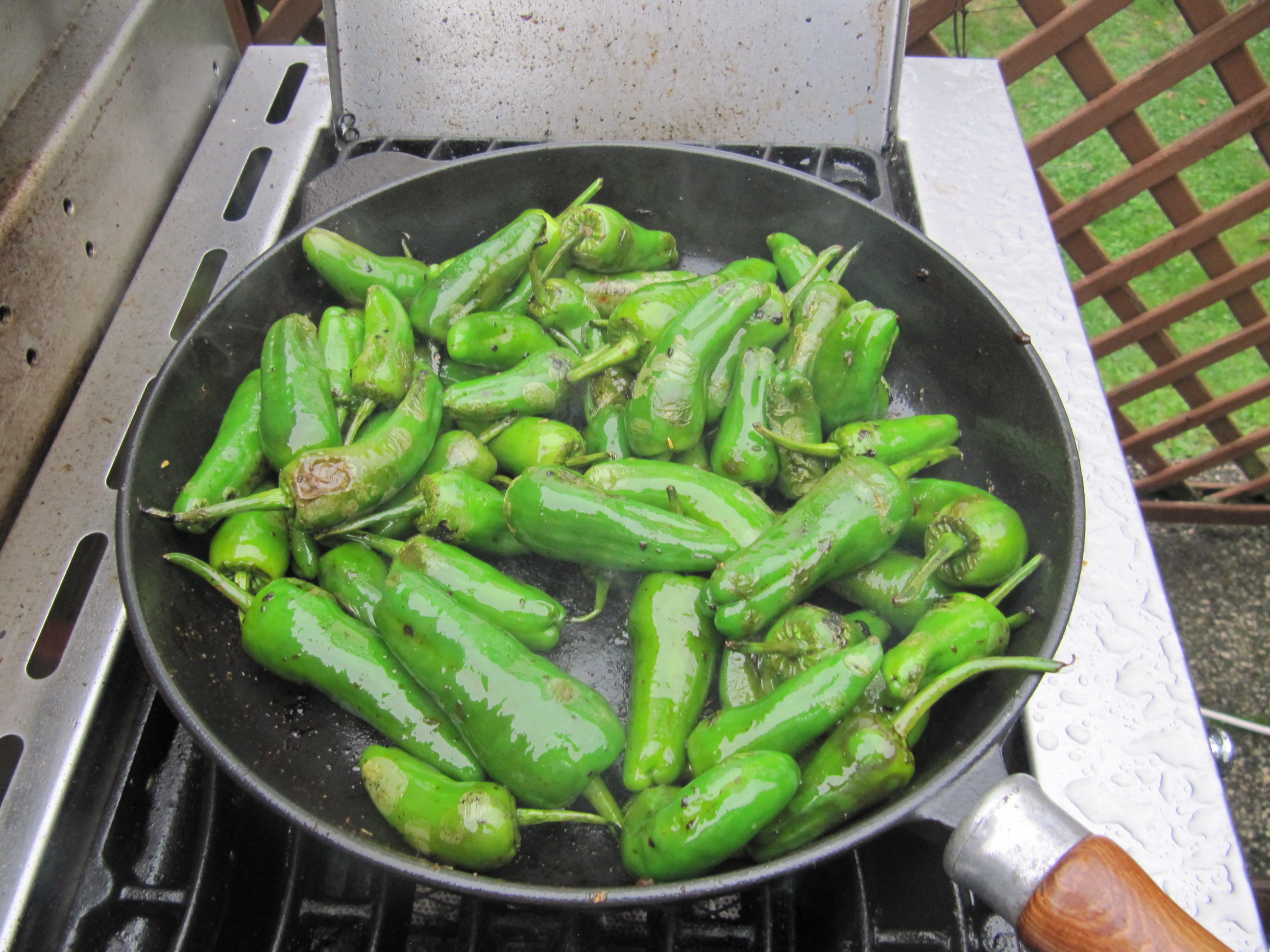 2 Becher Pimentos (spanische Bratpaprika, gibt´s bei Metro) in einer Gußeisenpfanne mit 1 EL Olivenöl bei starker Hitze am Seitenkocher braten bis Pimentos stellenweise gebräunt sind. Servieren und genießen.