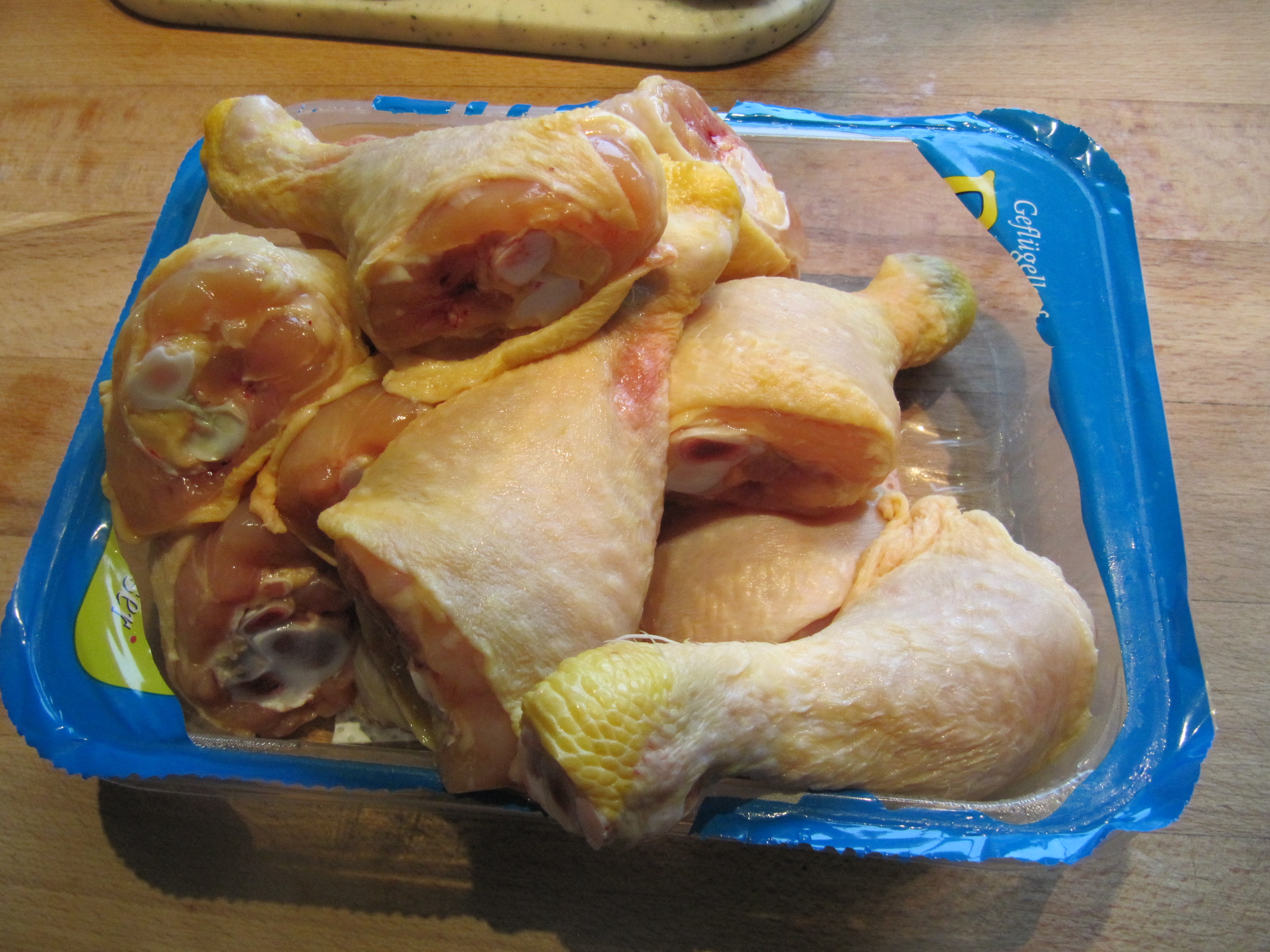 10 Stk. Hühnerkeulen (ca. 2000 g) in Ober- und Unterkeulen trennen.
