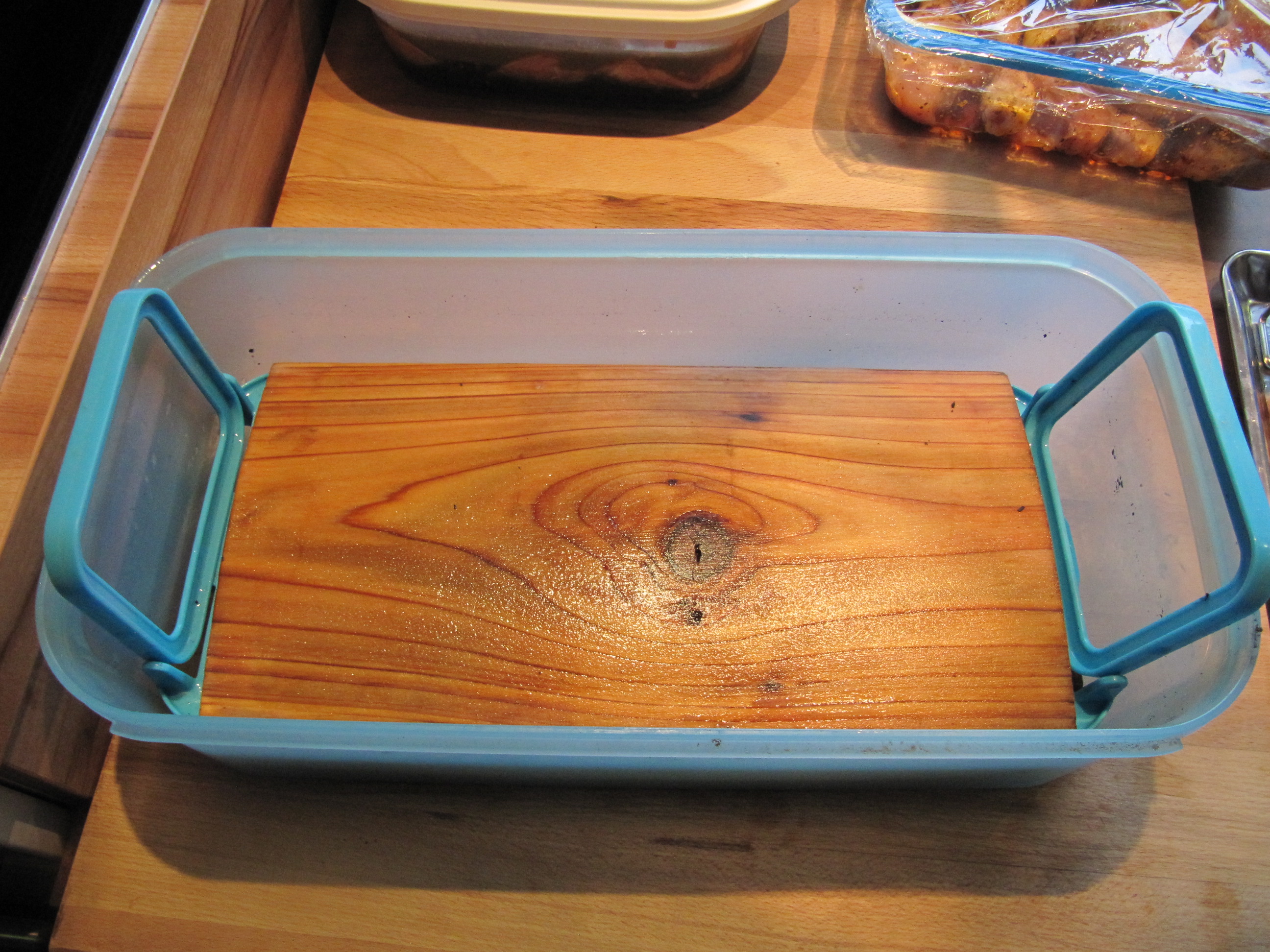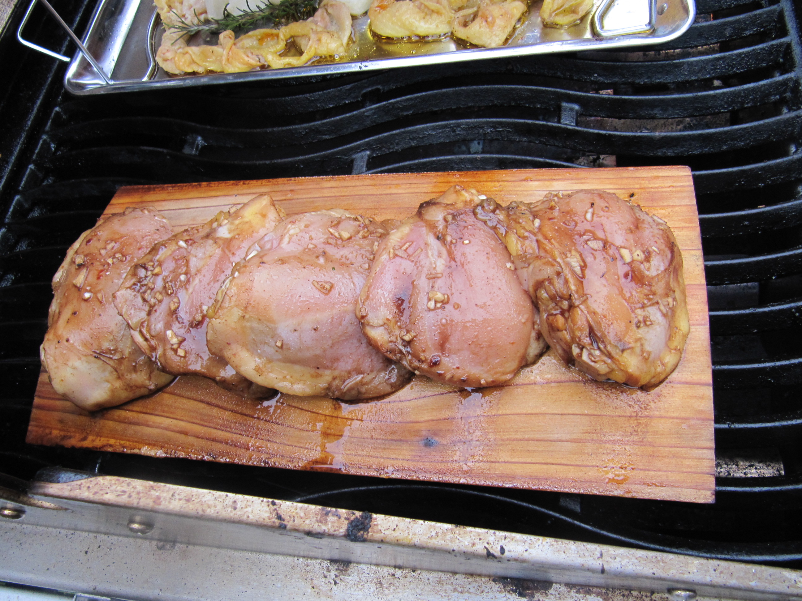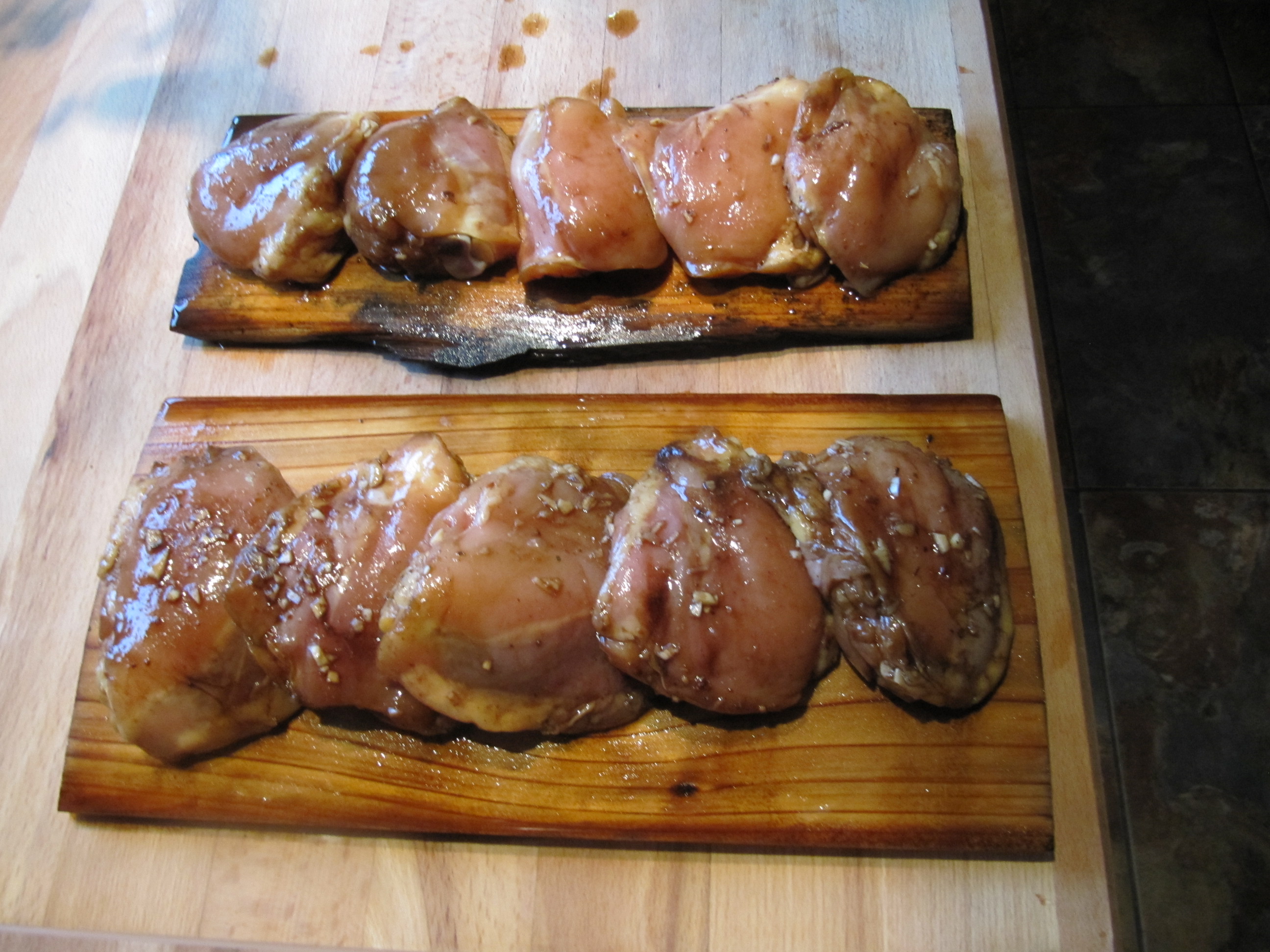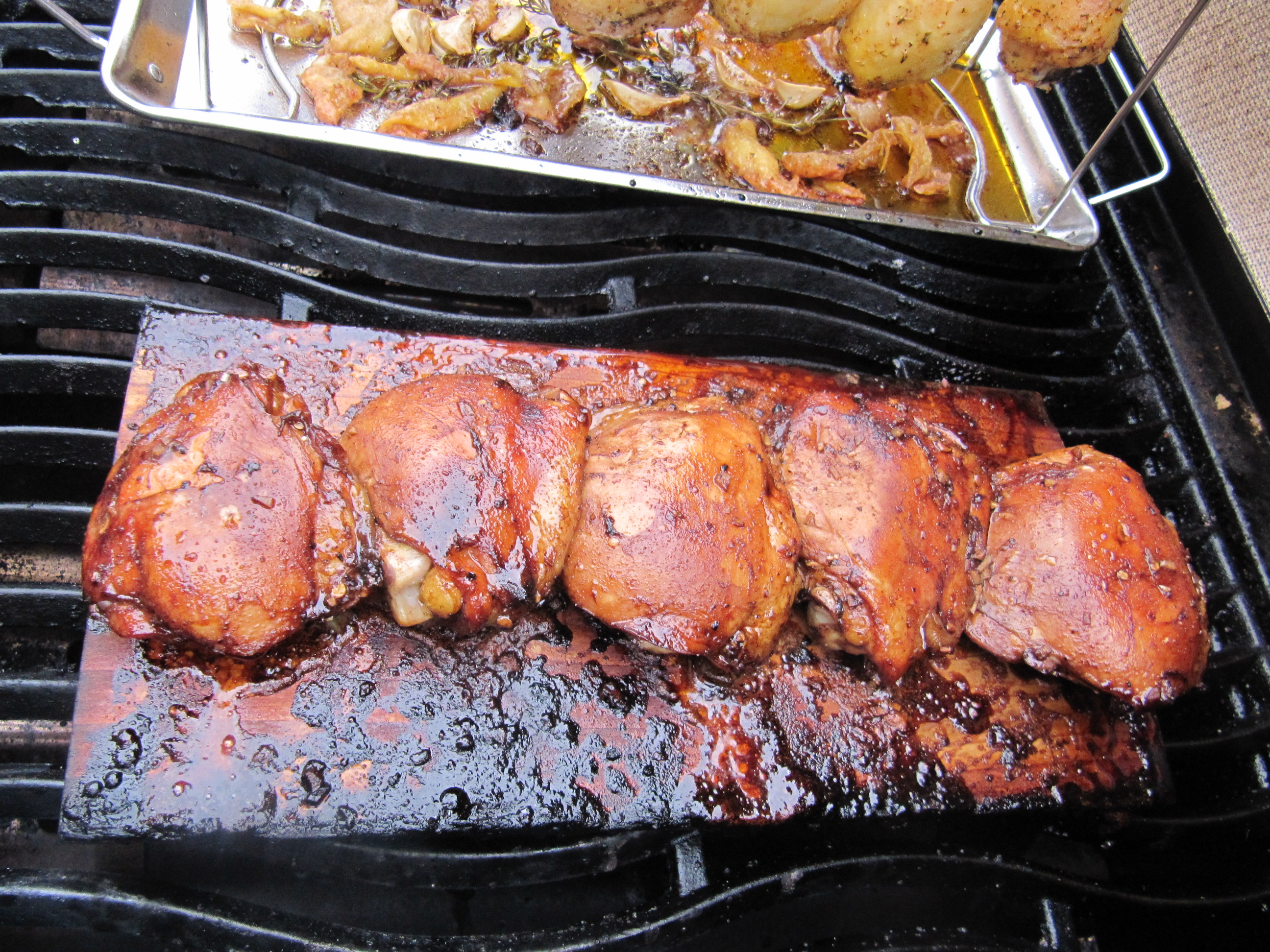 Sojasauce, Essig und Zucker in einem kleinen Topf erhitzen, ca. 20 Min. sanft kochen und zur Hälfte einreduzieren. Jetzt Knoblauch, Ingwer und Chiliflocken einrühren, etwas abkühlen lassen und Öl unterschlagen. Die Hälfte der Glasur zum Bestreichen aufbewahren. Die Oberkeulenstücke in eine Schüssel geben, die Glasur darübergießen, die Keulen mehrmals darin wenden. Abdecken und kaltstellen. 2 Zedernholzbretter, die vorher schon 2 Std. in gesalzenem Wasser eingeweicht wurden, auf den Grillrost des, für mittlere direkte Hitze vorbereiteten, Grills legen und den Deckel schließen. Wenn nach 5-10 Min. die Bretter zu rauchen beginnen, werden sie gewendet. Die Hühneroberkeulen aus der Schüssel nehmen (die Marinade wird nicht mehr benötigt !), auf die rauchenden Bretter auflegen, wieder 5-10 Min. bei geschlossenem Deckel grillen. Sobald die Bretter wieder rauchen, auf niedrige direkte Hitze reduzieren und bei geschlossenem Deckel 35-45 Min. weitergrillen. Wenn beim Einstechen mit Spieß klarer Fleischsaft austritt, sind die Keulen fertig. Die letzten 15 Min. immer wieder mit Glasur bestreichen. Vor dem Servieren nochmals Glasur auftragen.