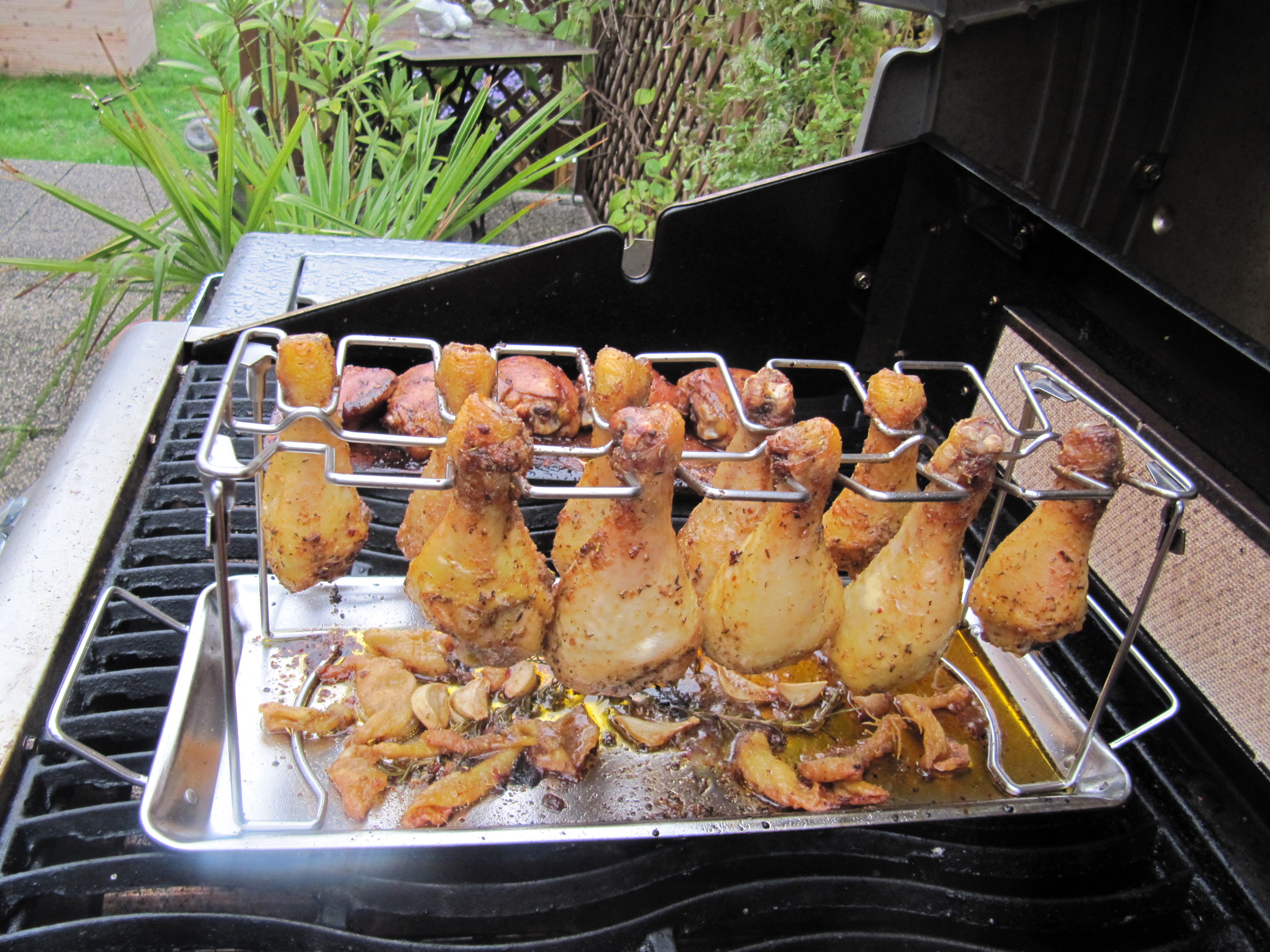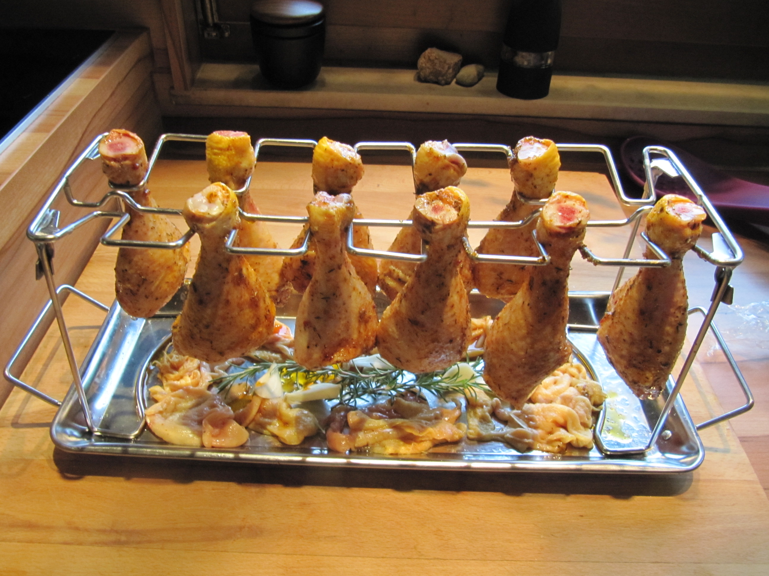 Die 10 Stk. Unterkeulen mit einer Marinade aus 1 EL Adi´s Geflügelgewürz, 1/2 TL geräuchertem Paprikapulver, 1 TL Knoblauchpulver mit 2 EL Olivenöl verrührt, einstreichen, abdecken und kühlstellen. 1 Räucherpfeife mit 1 handvoll 1/2 Std. in Wasser eingeweichten Apfelholzchips füllen, und auf die Brennerabdeckung eines, auf direkte starke Hitze aufgeheizten, Brenners legen. Wenn die Räucherpfeife zu rauchen beginnt, Hitze reduzieren. Die Unterkeulen in das Geflügelrack einhängen, (Es ist Platz für 12 Stk. vorhanden !) in die Tasse darunter 2 Stk. grob geschnittenen Knoblauch und 3 Rosmarinzweige wegen Aromatisierung legen. (Tipp: Ich habe die abgezogene Haut der Oberkeulen dort mitgebraten, es ergaben sich köstliche, knusprige Hautcräcker !) Die Unterkeulen auf dem Rack bei indirekter mittlerer Hitze ca. 45 Min. grillen. Bei halber Grillzeit das Rack wenden, die Keulen immer wieder mit abgetropftem Fett einstreichen. Danach abnehmen und servieren.