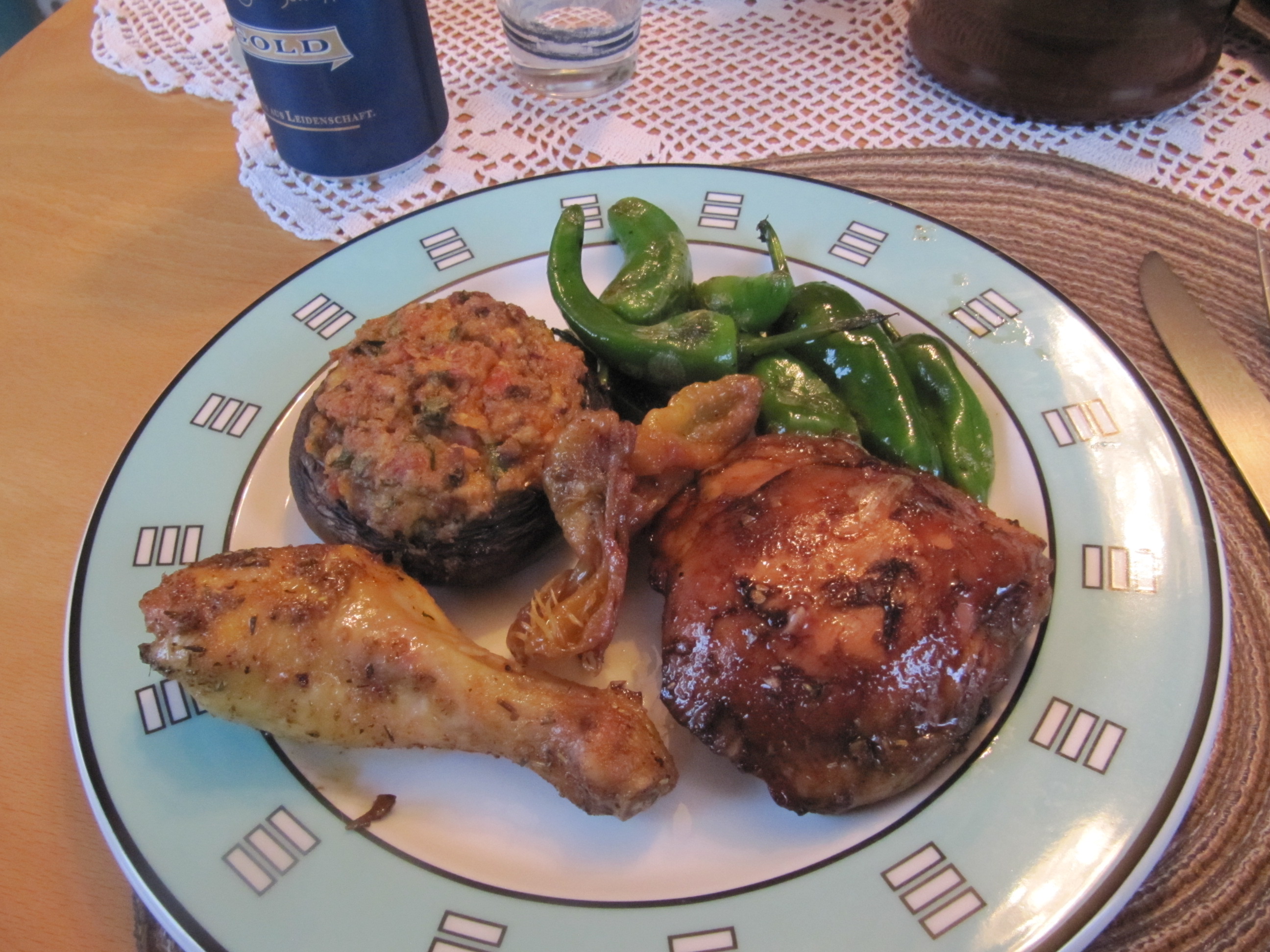 heute gibt´s Hühnerkeulen auf zwei Arten: Die Oberkeulen enthäuted am Zedernholzbrett mit Soja-Ingwer-Glasur, die Unterkeulen im Geflügelrack mit Apfelholz geräuchert. Als Beilage Portobello-Champignons mit pikanter Füllung und gebratene Pimentos.
