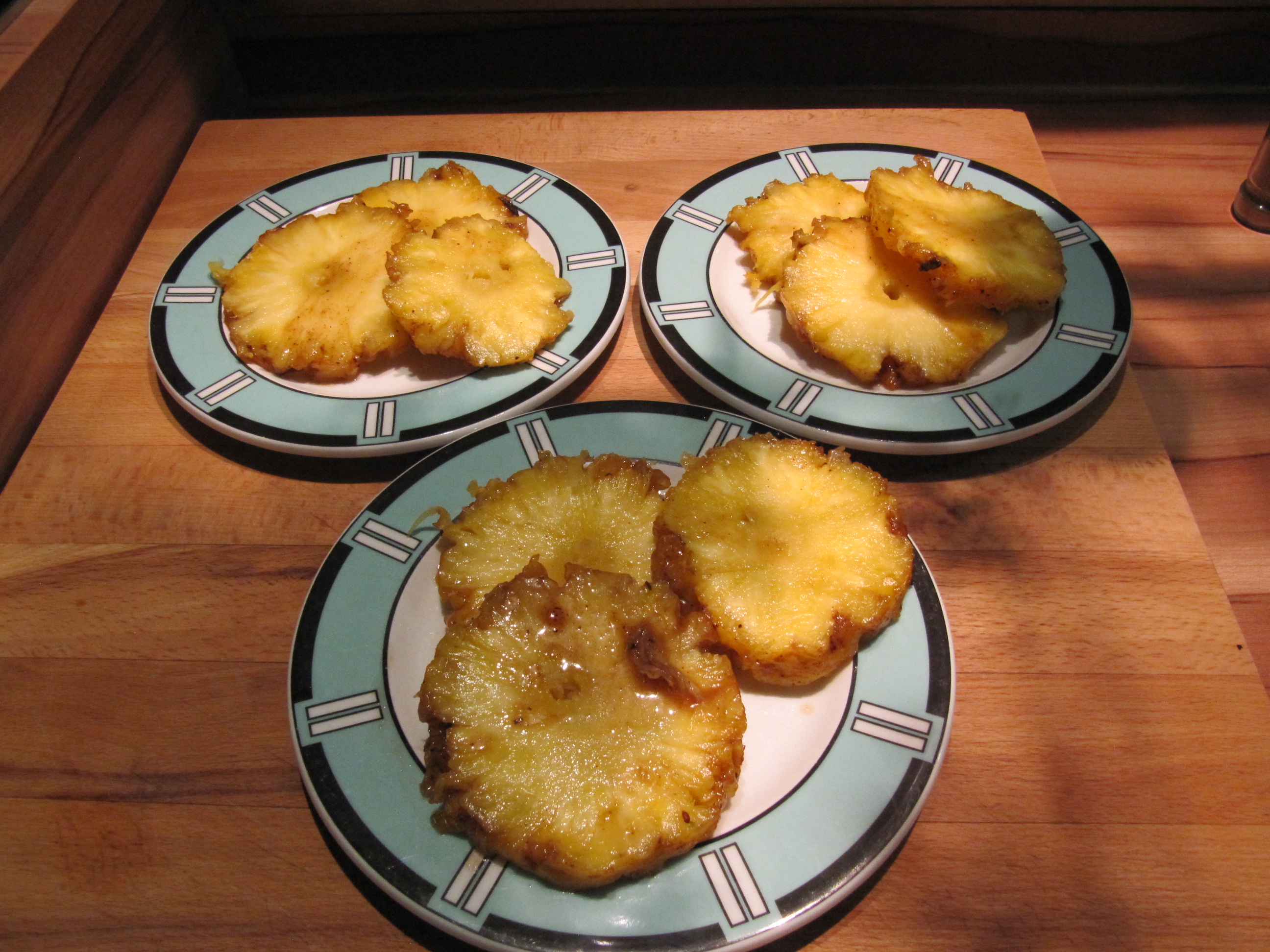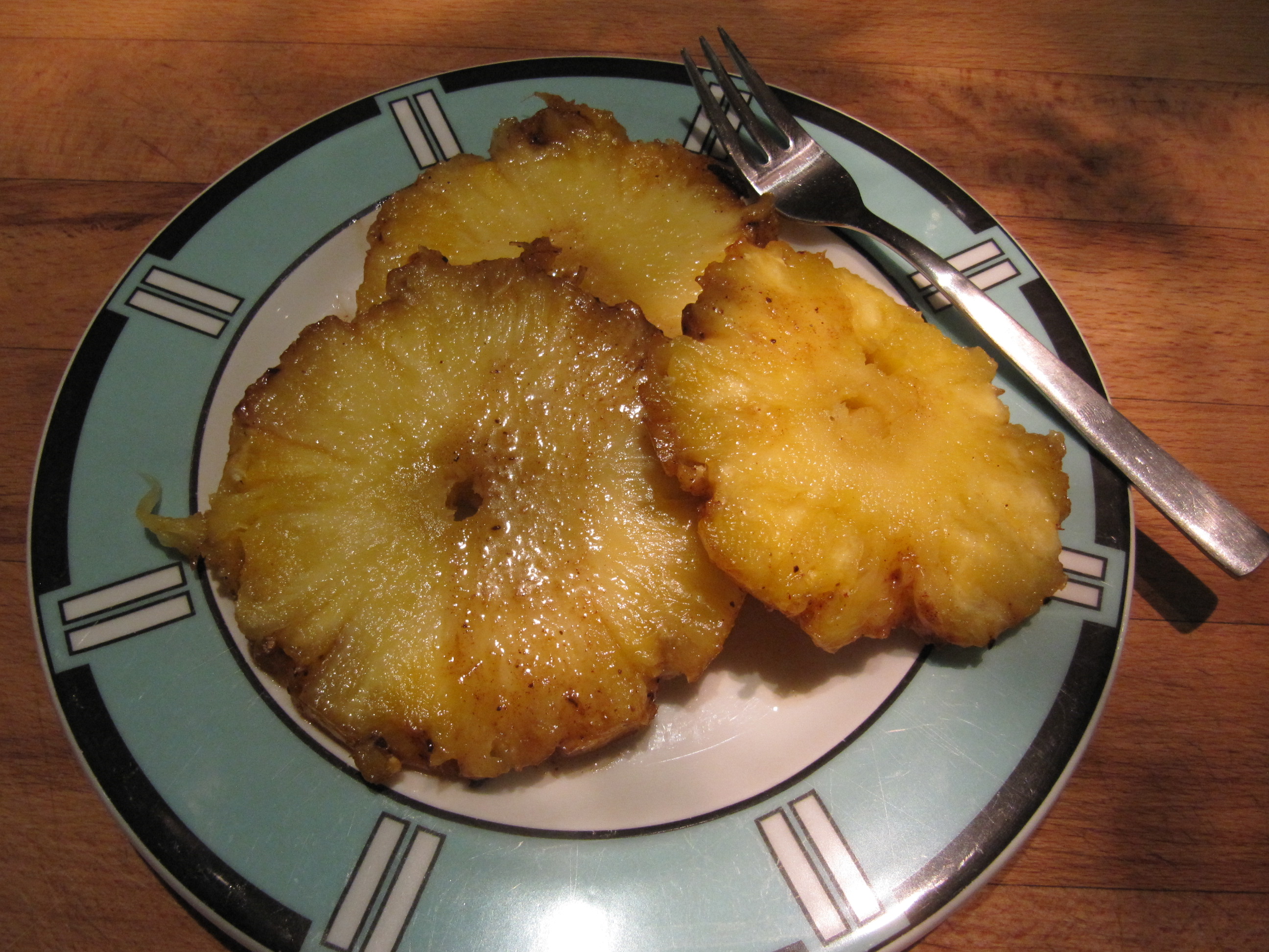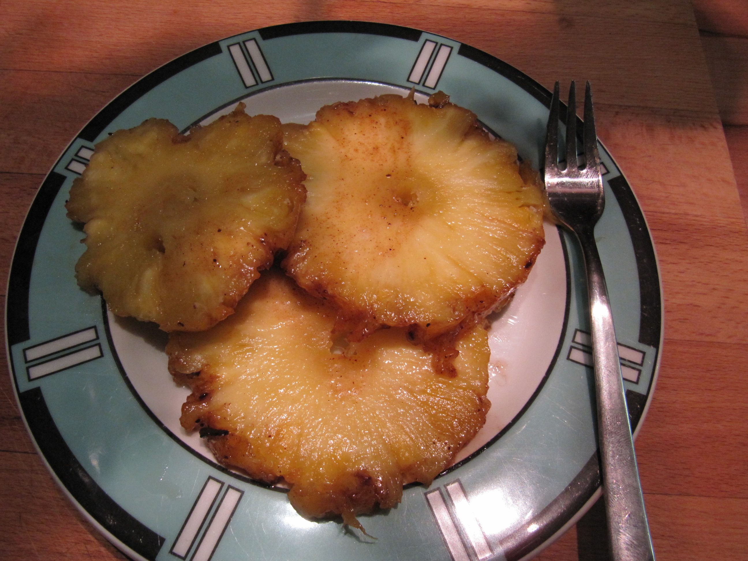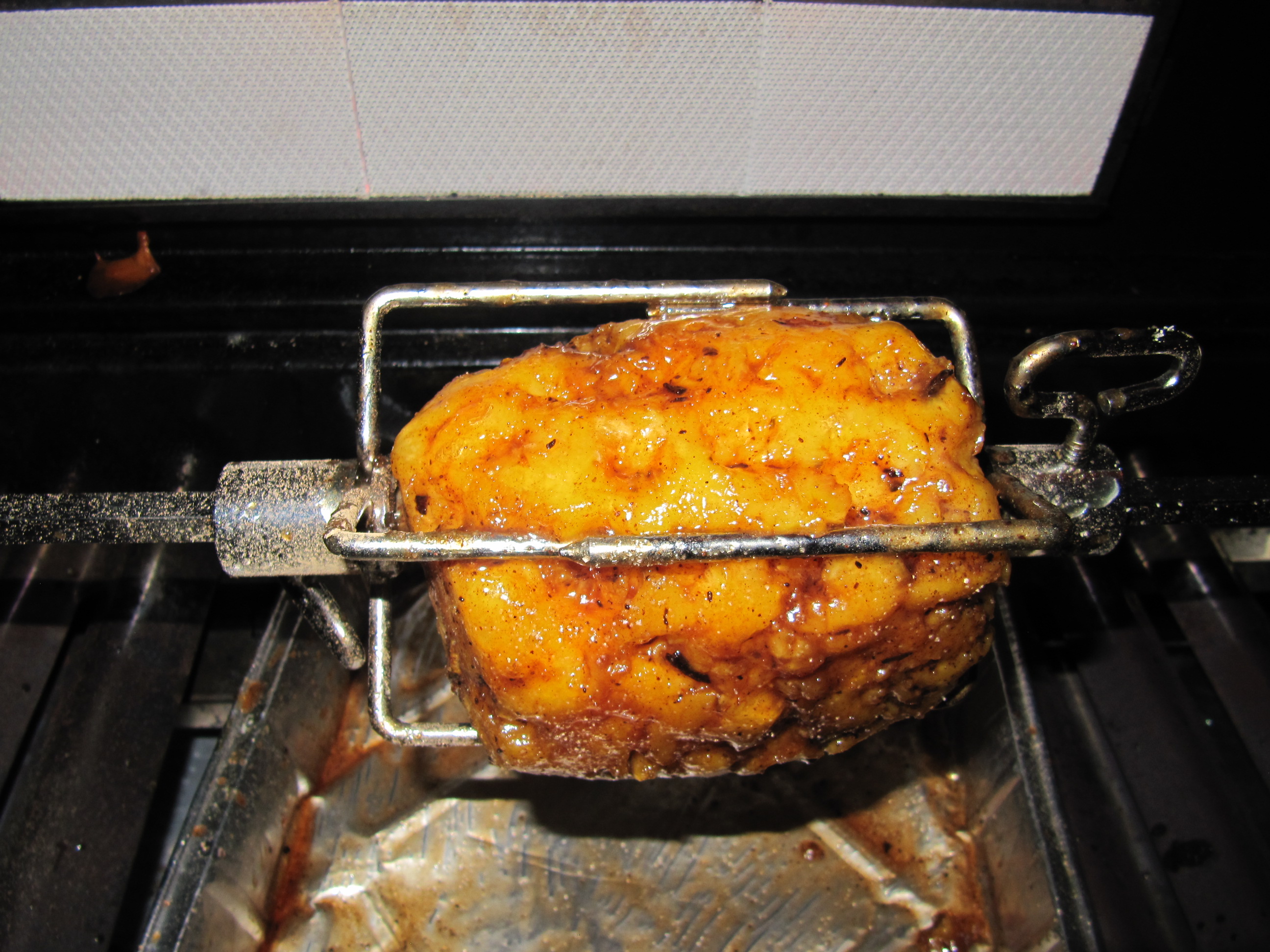 da ich eine Ananas zu Hause hatte, die schon sehr reif geworden ist, wurde diese auf den Drehspieß gesteckt. Mit Nelkenpulver, Honig und Zimtzucker als Glasur stellt sich schon etwas Weihnachtsfeeling bei Genuß dieser Ananas ein. Bei den täglichen Einkäufen werden wir ja schon damit zur Genüge konfrontiert !