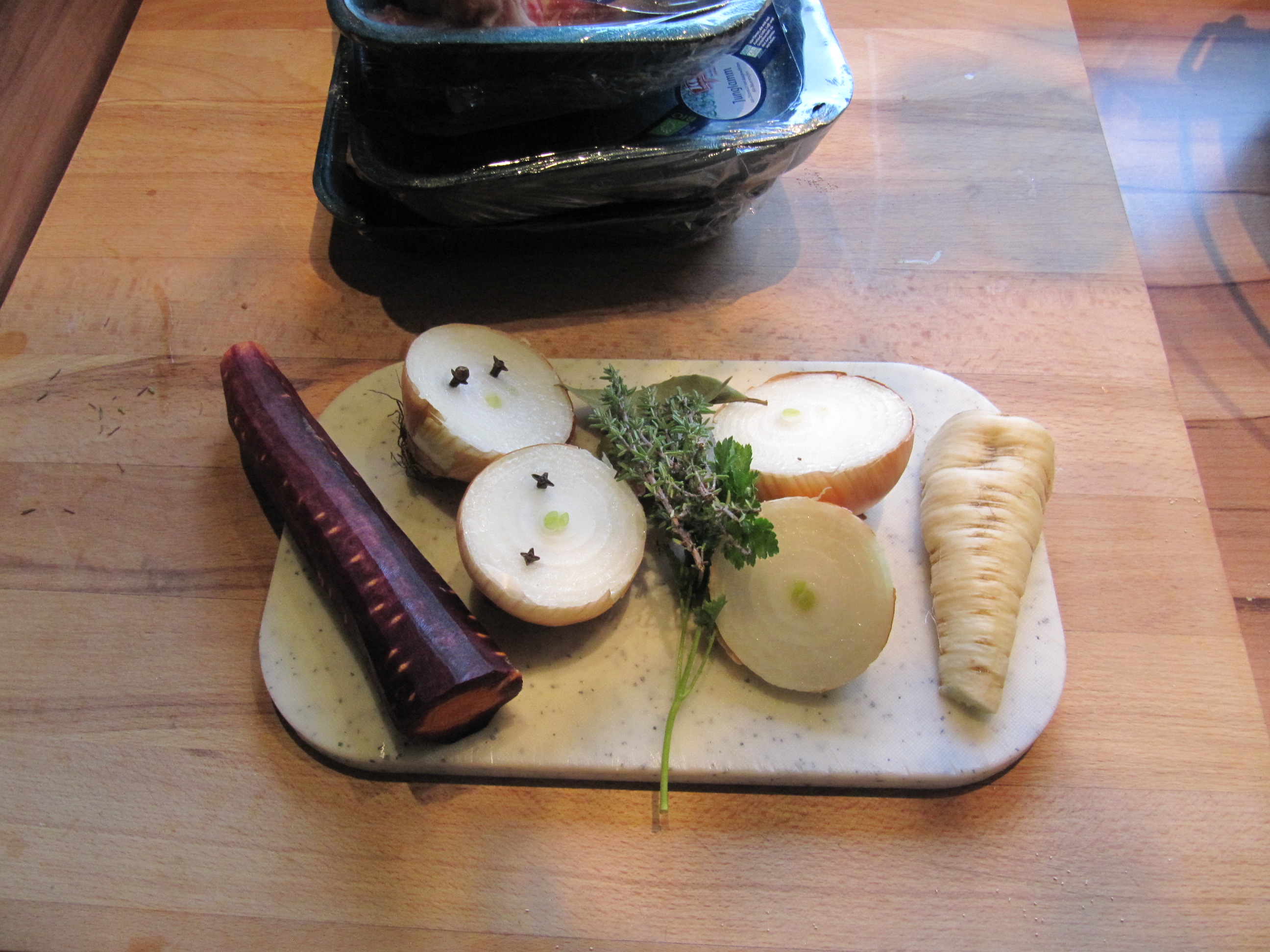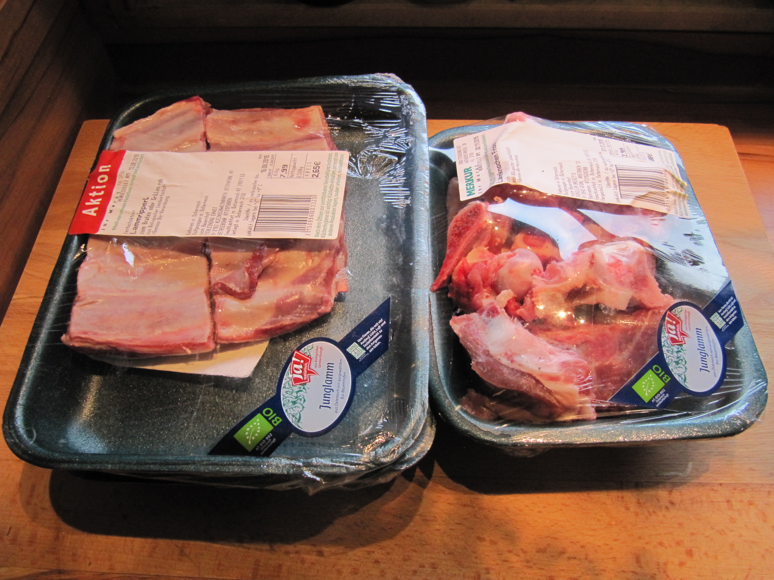2 L Wasser, 2 Lammkeulenknochen (auch Lammknochen oder Lammripperl !), 2 Zwiebel geschält, halbiert und 4 Gewürznelken reingesteckt, 1 Bund Petersilie und Thymian, 2 Lorbeerblätter, 1 große Karotte (Möhre) in Stücke geschnitten (oder 1 Suppengrün)