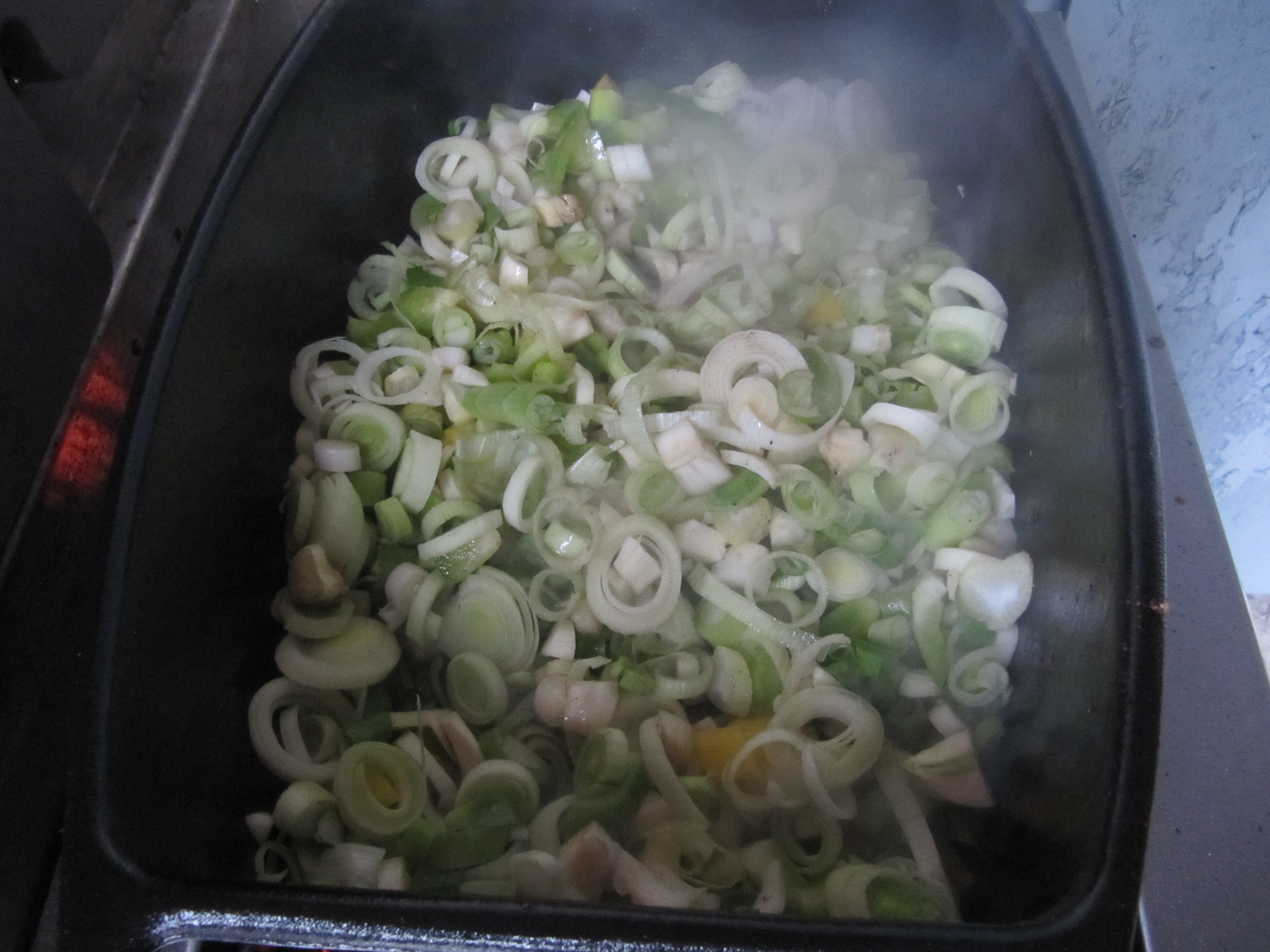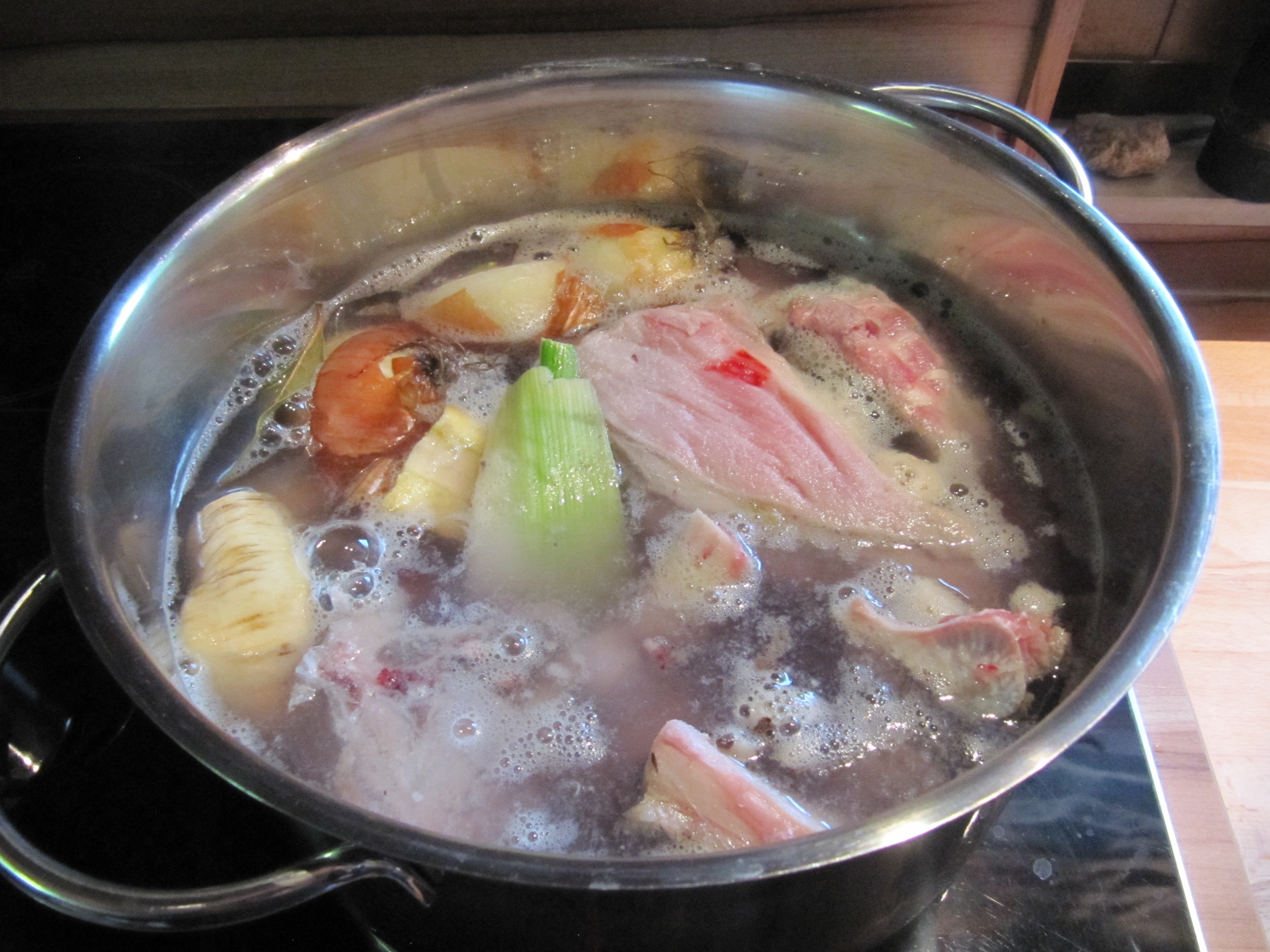 Die Zutaten für die Brühe ca. 3 Std. bei kleiner Flamme sieden lassen. Dann durch Sieb gießen und zur Seite stellen.
