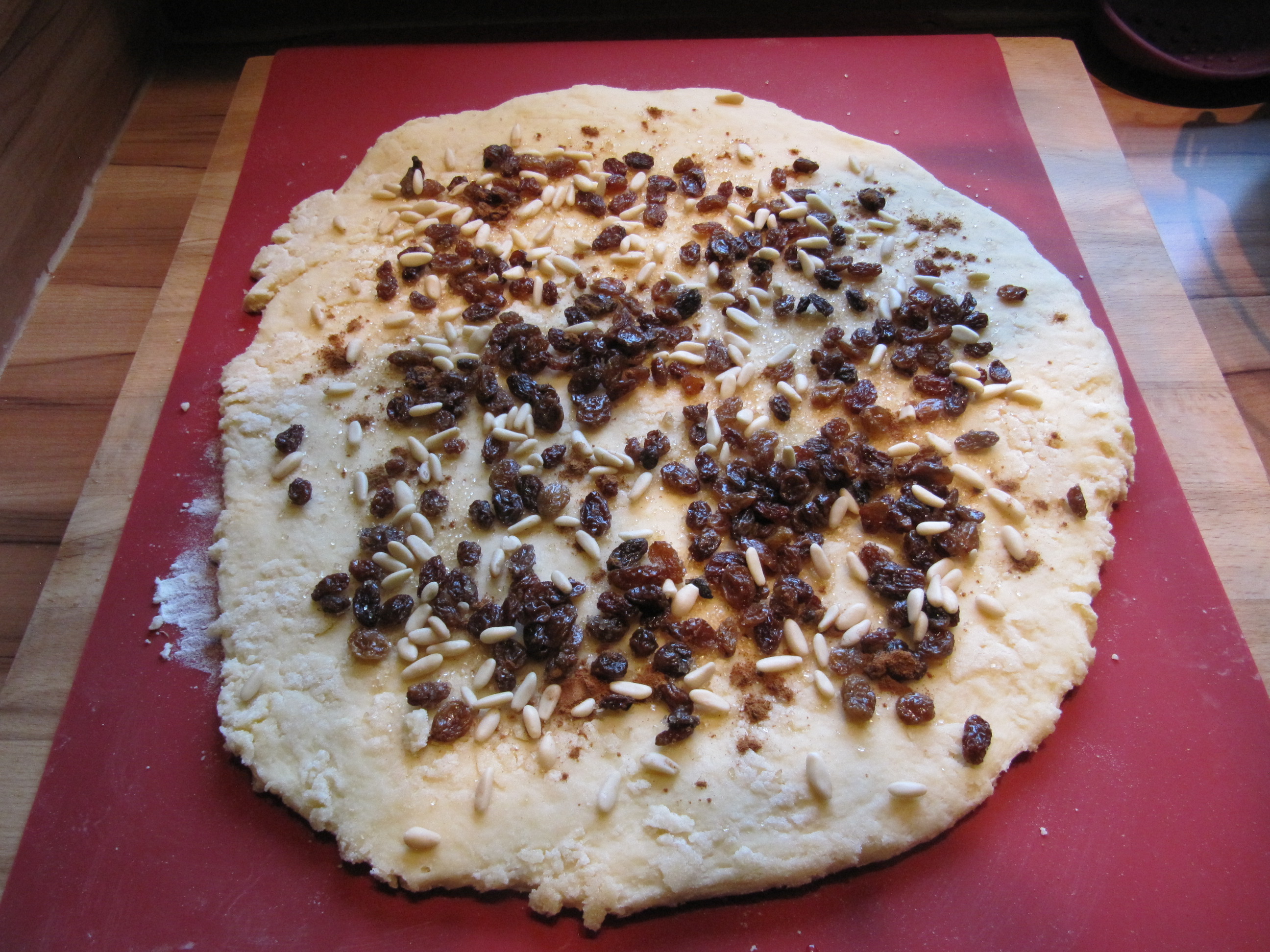 80-100 g braunen Rohrzucker, 1-2 TL Zimt, 3 EL Rumrosinen (oder alkoholfrei: in Apfelsaft aufgeweichte Rosinen verwenden !), Pinienkerne oder gehackte Nüsse nach Belieben.