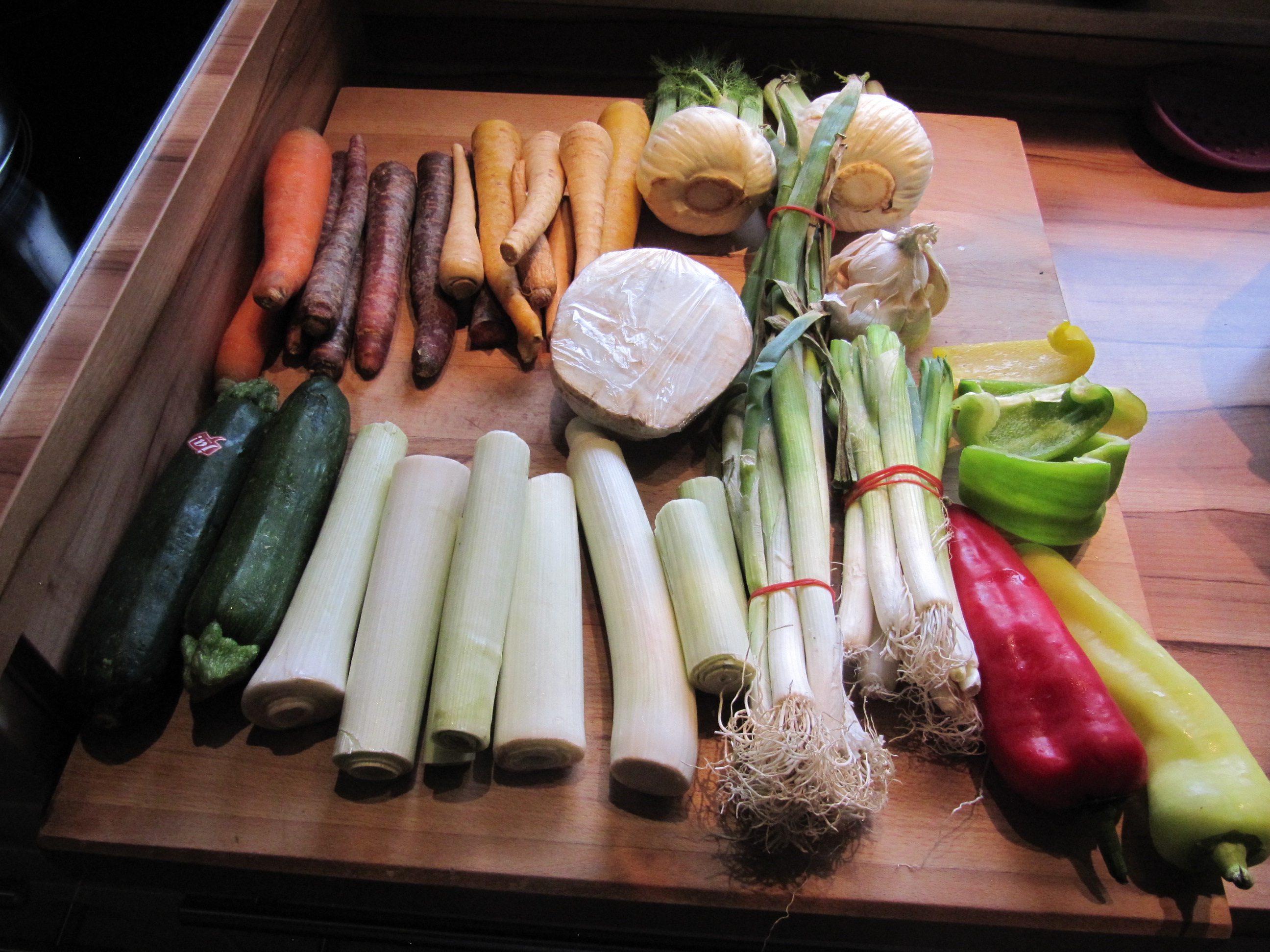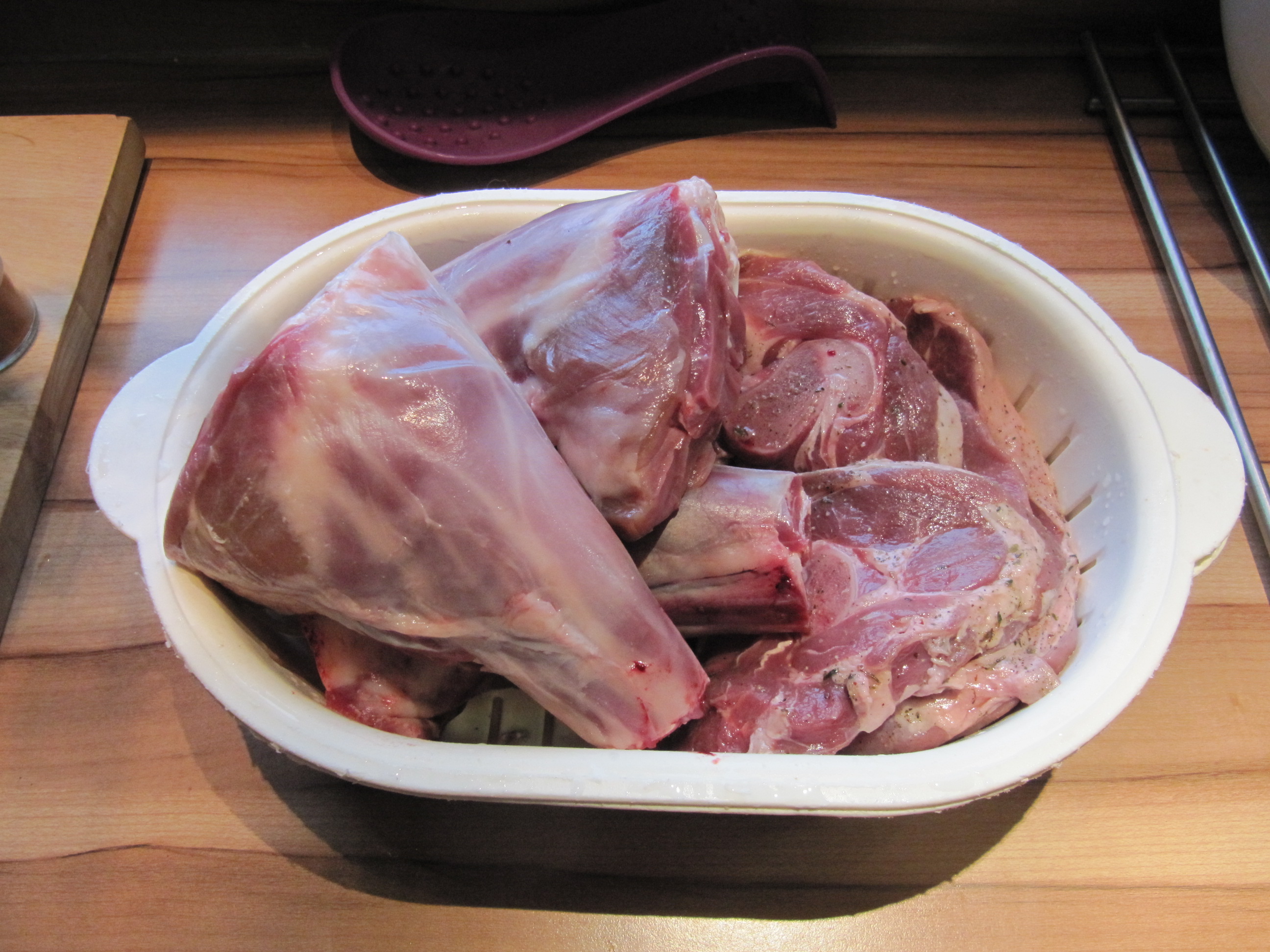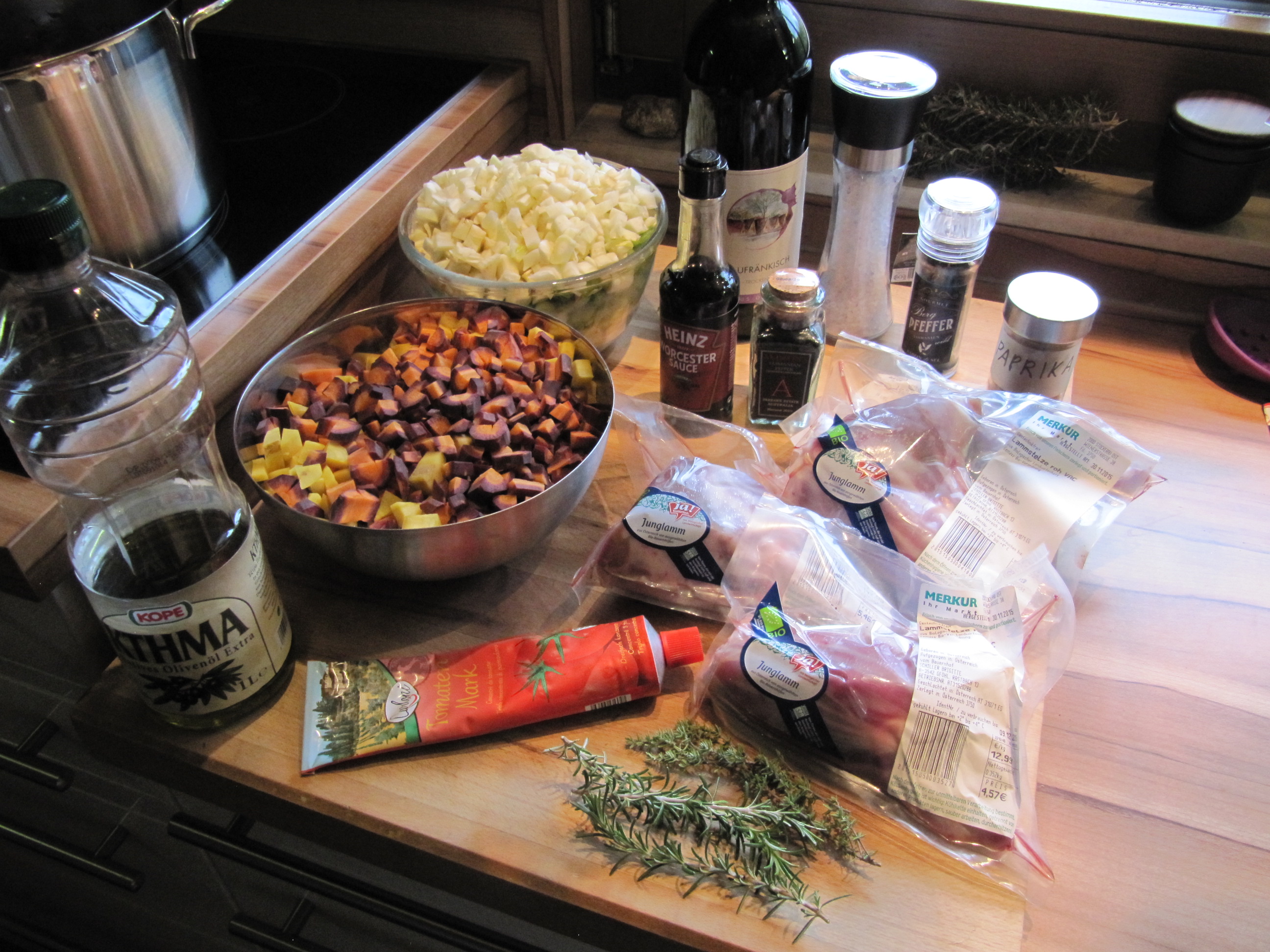 4 Lammkeulen (Auch 4 Lammstelzen und 4 Lammkeulensteaks sind möglich !), 2 große Zwiebel (oder 1 Bund Lauchzwiebel) in Ringe geschnitten, 2 Stangen Lauch in dünne Ringe geschnitten, 1 Bund Karotten (Möhren) in Würfel geschnitten (auch jedes vorhandene Wurzelgemüse wie Petersilwurzeln, Pastinaken, gelbe und lila Karotten (Möhren) kann verwendet werden, Fenchelknolle und Paprikaschote passt auch dazu !), 1 Chilischote entkernt und fein gehackt (wer´s scharf mag !),1 Sellerieknolle in Würfel geschnitten, 5 große Knoblauchzehen geschält und halbiert (dürfen auch mehr sein !), schwarzer Pfeffer und Salz frisch gemahlen (meine momentanen Favoriten : tasmanischer Bergpfeffer und persisches Blausalz !), Worcestershiresauce, Paprikapulver edelsüß (oder geräuchertes), 3 Rosmarin- und Thymianzweige, 2 EL Tomatenmark, Butter, Olivenöl, 1 Flasche Rotwein (zum Ablöschen) 1 Glas Lammfond (oder gekochte Lammbrühe, Rezept siehe unten !)