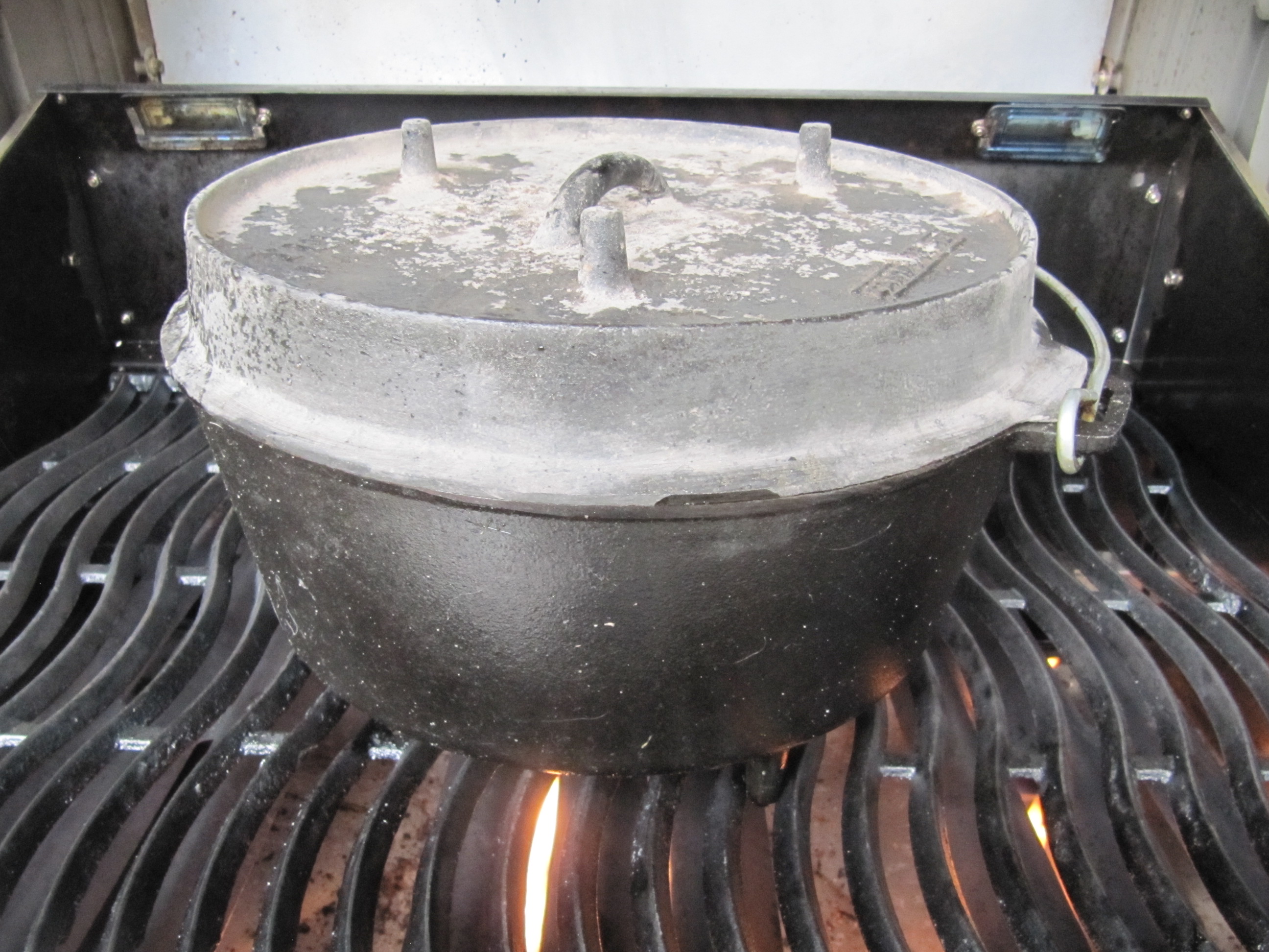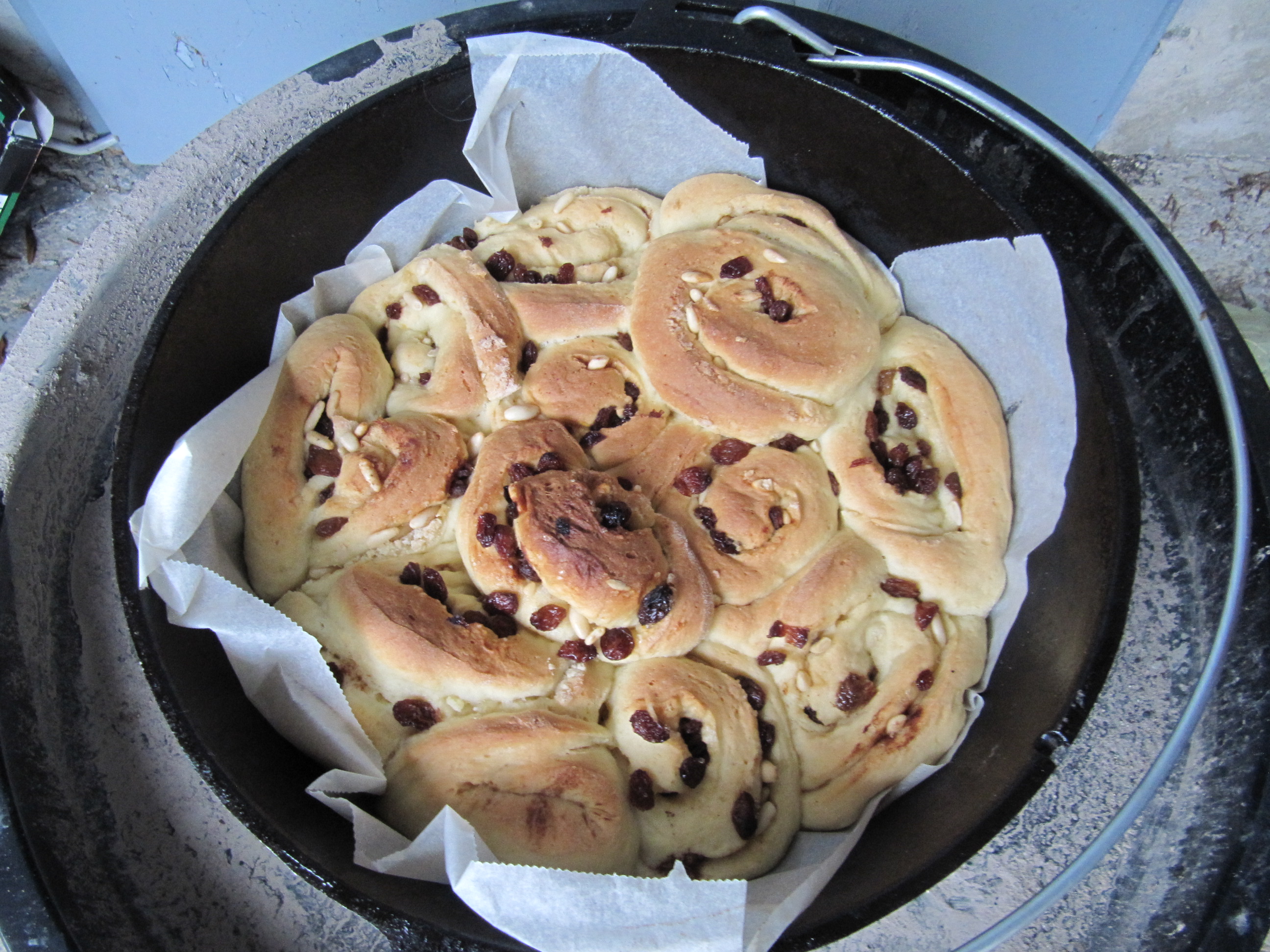 heute gibt´s nach längerer Zeit wieder ein neues Rezept. Wegen einer Erkältung und dem Zeitaufwand der Herstellung von Räucherspeck (Info: Bei Interesse „Mein Räuchern“ aus dem Verzeichnis aufrufen !) war es nicht früher möglich. Hauptspeise und Dessert sind im Dutch-Oven zubereitet worden und wirklich köstlich geraten. Die kalte Vorspeise möchte ich euch auch nicht vorenthalten, hat Dank meiner Gattin auch vorzüglich geschmeckt ! Da ich bis jetzt nur einen Dutch-Oven 12″ besitze. wurden die Zimtschnecken schon am Vormittag traditionell mit Briketts oben und unten zubereitet um den Dutch für die Zubereitung der Lammkeule am Nachmittag frei zu haben. Wegen strömendem Regen und Sturm war die Beheizung mit Briketts nicht möglich, so wurde der Dutch im Gasgrill beheizt, und zwar bei Niedrigtemperatur von unten wie ein traditioneller Potjie aus Südafrika eingesetzt. Dabei kommt eine Garzeit von 3 Stunden zustande. (Längere Garzeit schadet auch nicht, ich hatte den Dutch 4 1/2 Std. am Feuer !)